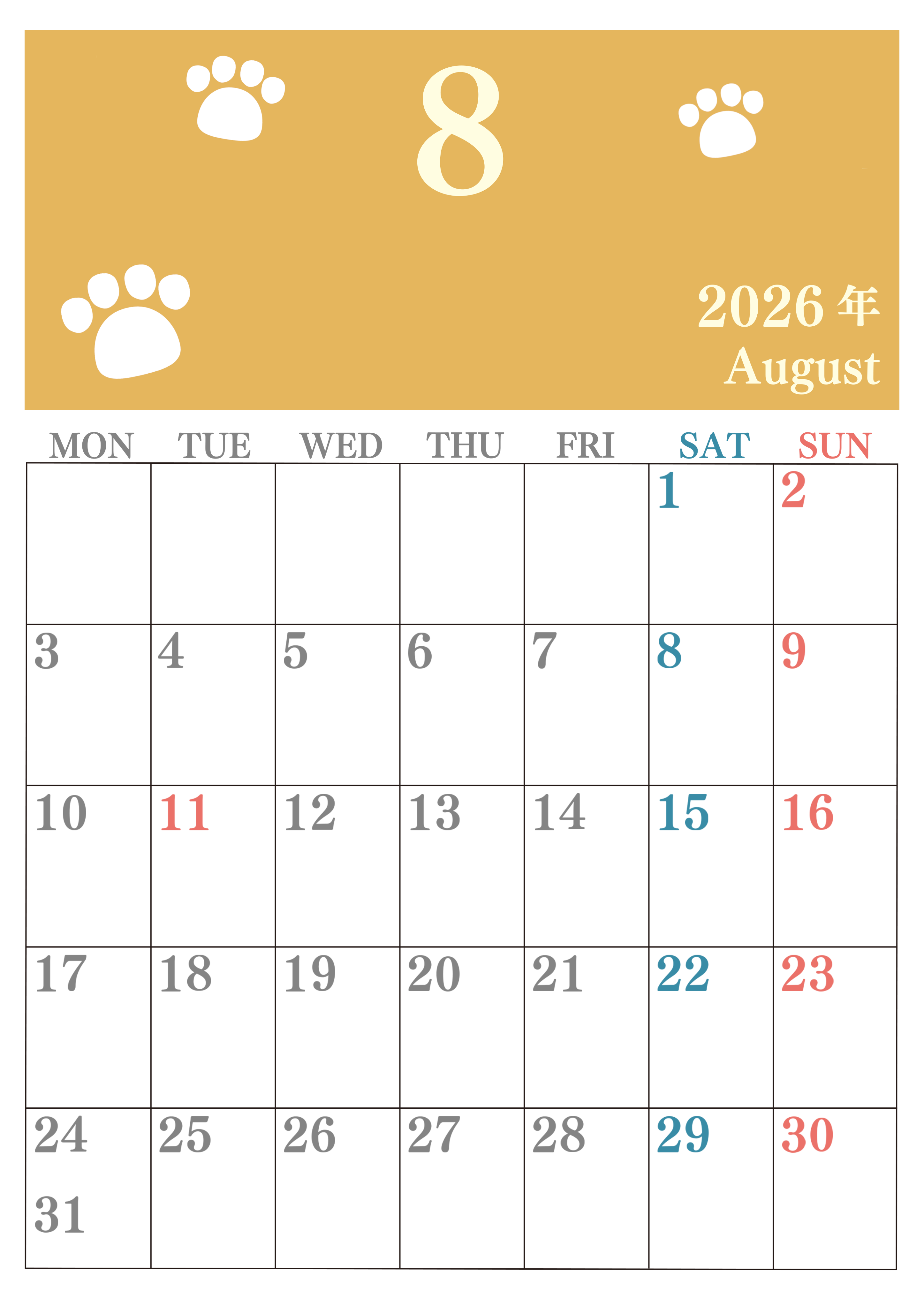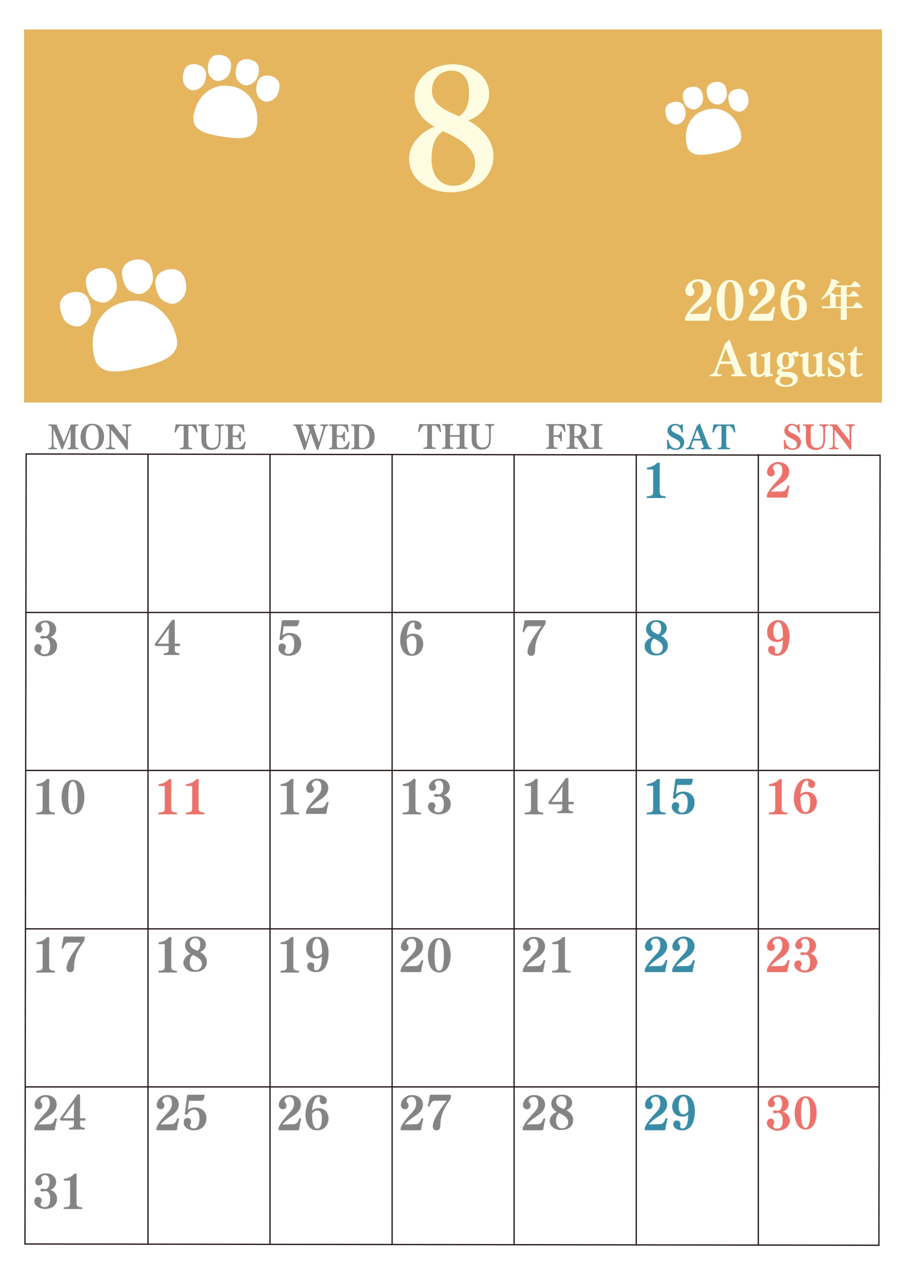 2026年8月カレンダーは縦型月曜始まりで猫の肉球がゆるかわいいレイアウトです。無料かつ自由に予定を書き込めます。ダウンロードしてすぐに印刷利用しませんか?(2026-01250811)