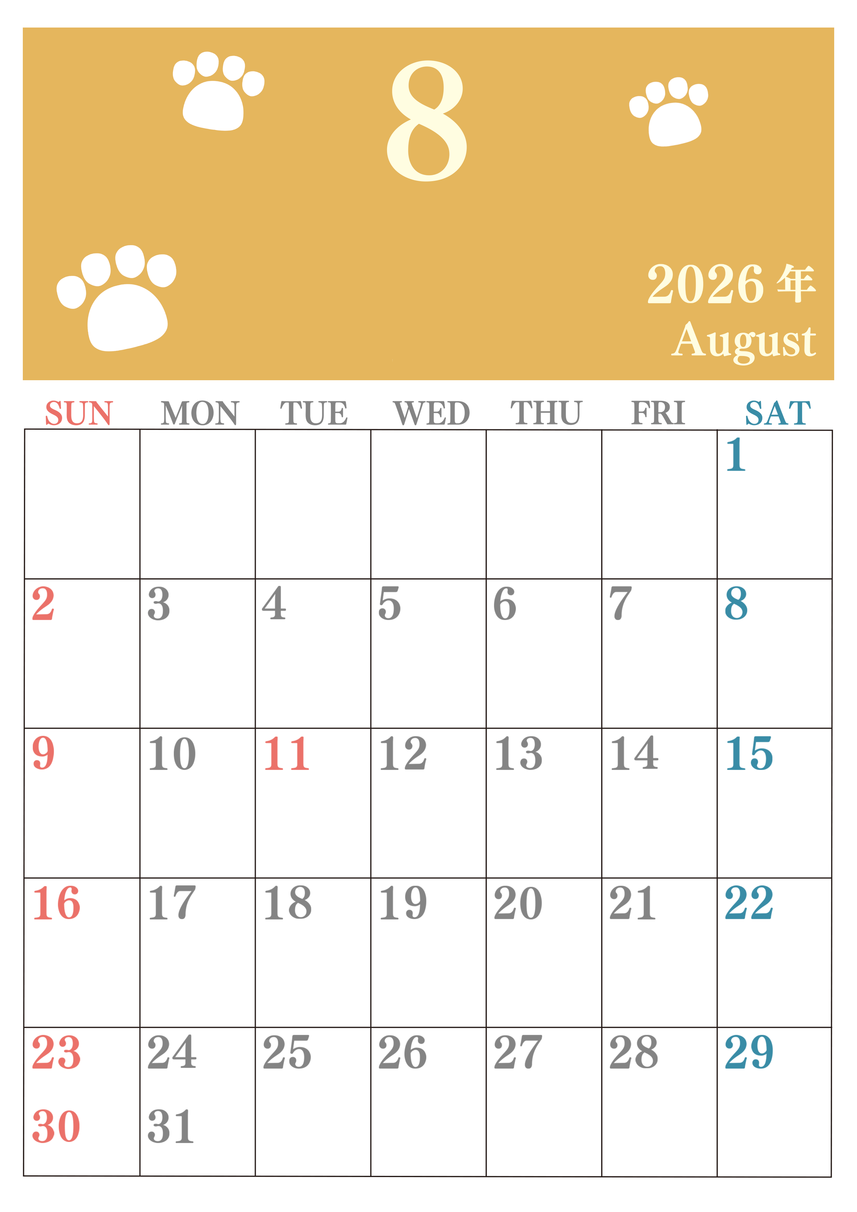 2026年・無料のカレンダーテンプレート 2026年8月カレンダーは縦型日曜始まりで猫の肉球がゆるかわいいレイアウト!無料かつ自由に予定を書き込めます!(2026-01250810) 素材状デザイン王 2025年4月9日 2026年8月カレンダーは縦型日曜始まりで猫の肉球がゆるかわいいレイアウトです。無料かつ自由に予定を書き込めます。ダウンロードしてすぐに印刷利用しませんか?(2026-01250810) かわいい 8月 猫 縦型のカレンダー 日曜始まり カレンダーデザイン-0125