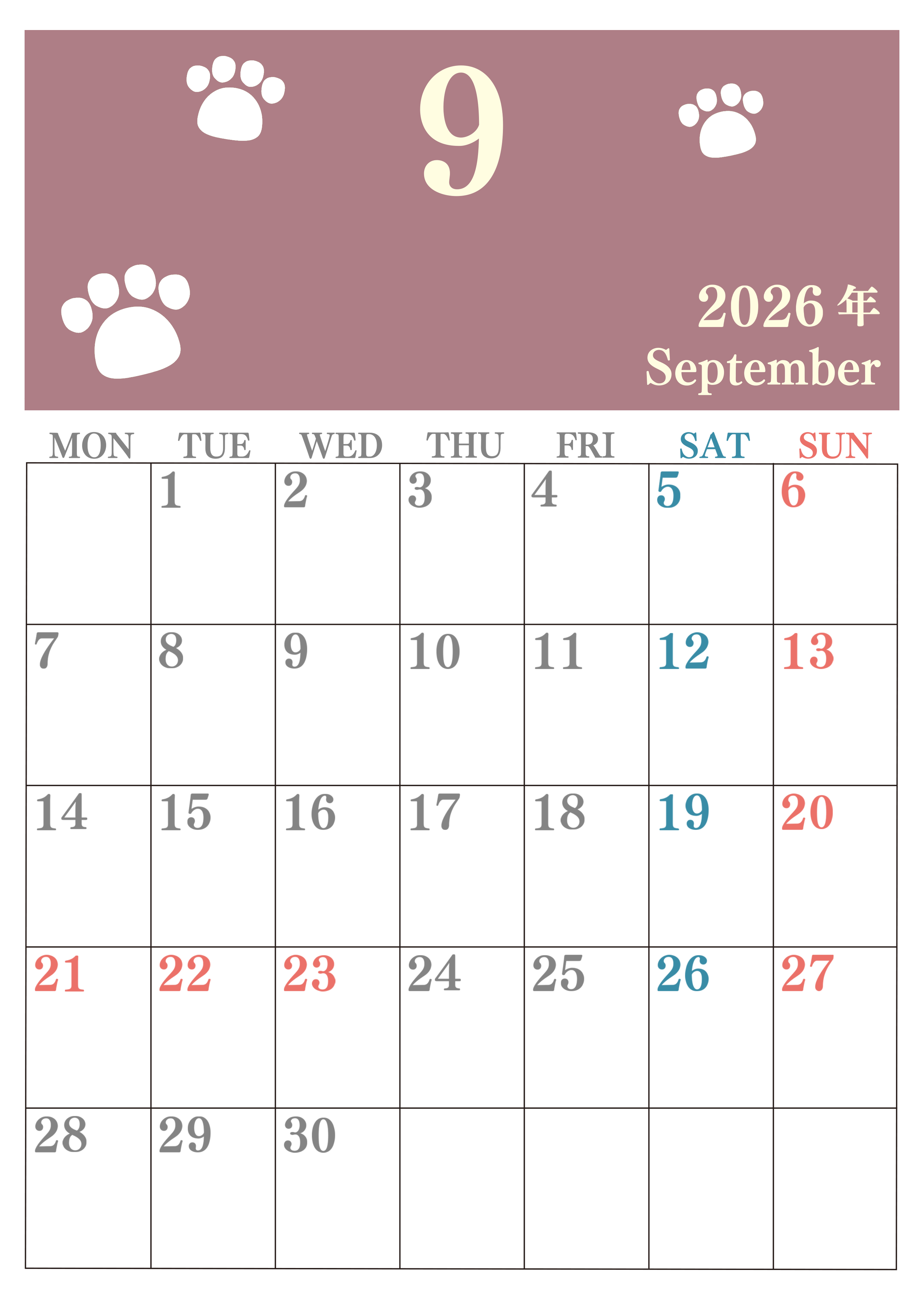 2026年・無料のカレンダーテンプレート 2026年9月カレンダーは縦型月曜始まりで猫の肉球がゆるかわいいレイアウト!無料かつ自由に予定を書き込めます!(2026-01250911) 素材状デザイン王 2025年4月9日 2026年9月カレンダーは縦型月曜始まりで猫の肉球がゆるかわいいレイアウトです。無料かつ自由に予定を書き込めます。ダウンロードしてすぐに印刷利用しませんか?(2026-01250911) かわいい 9月 猫 縦型のカレンダー 月曜始まり カレンダーデザイン-0125