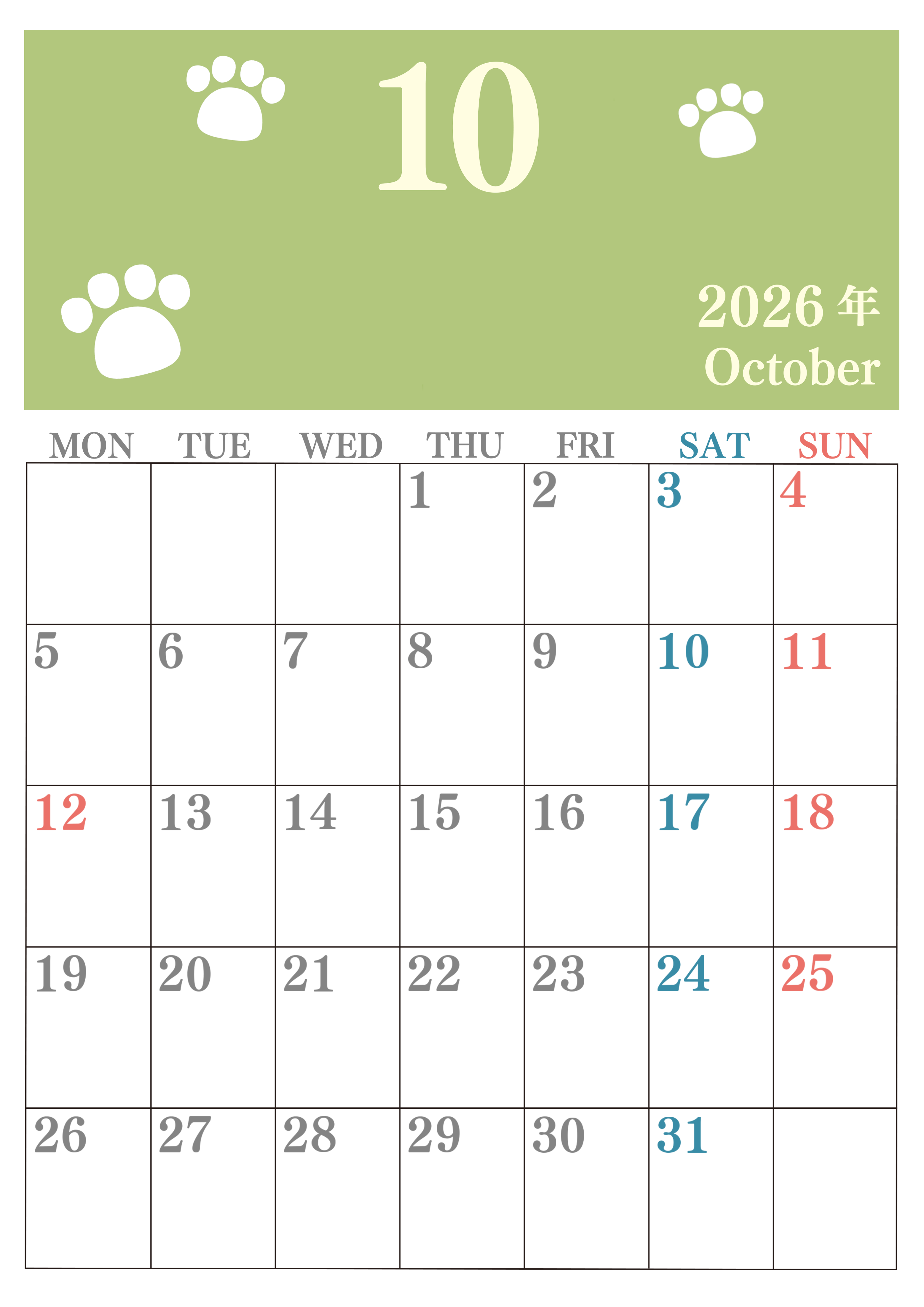 2026年・無料のカレンダーテンプレート 2026年10月カレンダーは縦型月曜始まりで猫の肉球がゆるかわいいレイアウト!無料かつ自由に予定を書き込めます!(2026-01251011) 素材状デザイン王 2025年4月9日 2026年10月カレンダーは縦型月曜始まりで猫の肉球がゆるかわいいレイアウトです。無料かつ自由に予定を書き込めます。ダウンロードしてすぐに印刷利用しませんか?(2026-01251011) かわいい 10月 猫 縦型のカレンダー 月曜始まり カレンダーデザイン-0125