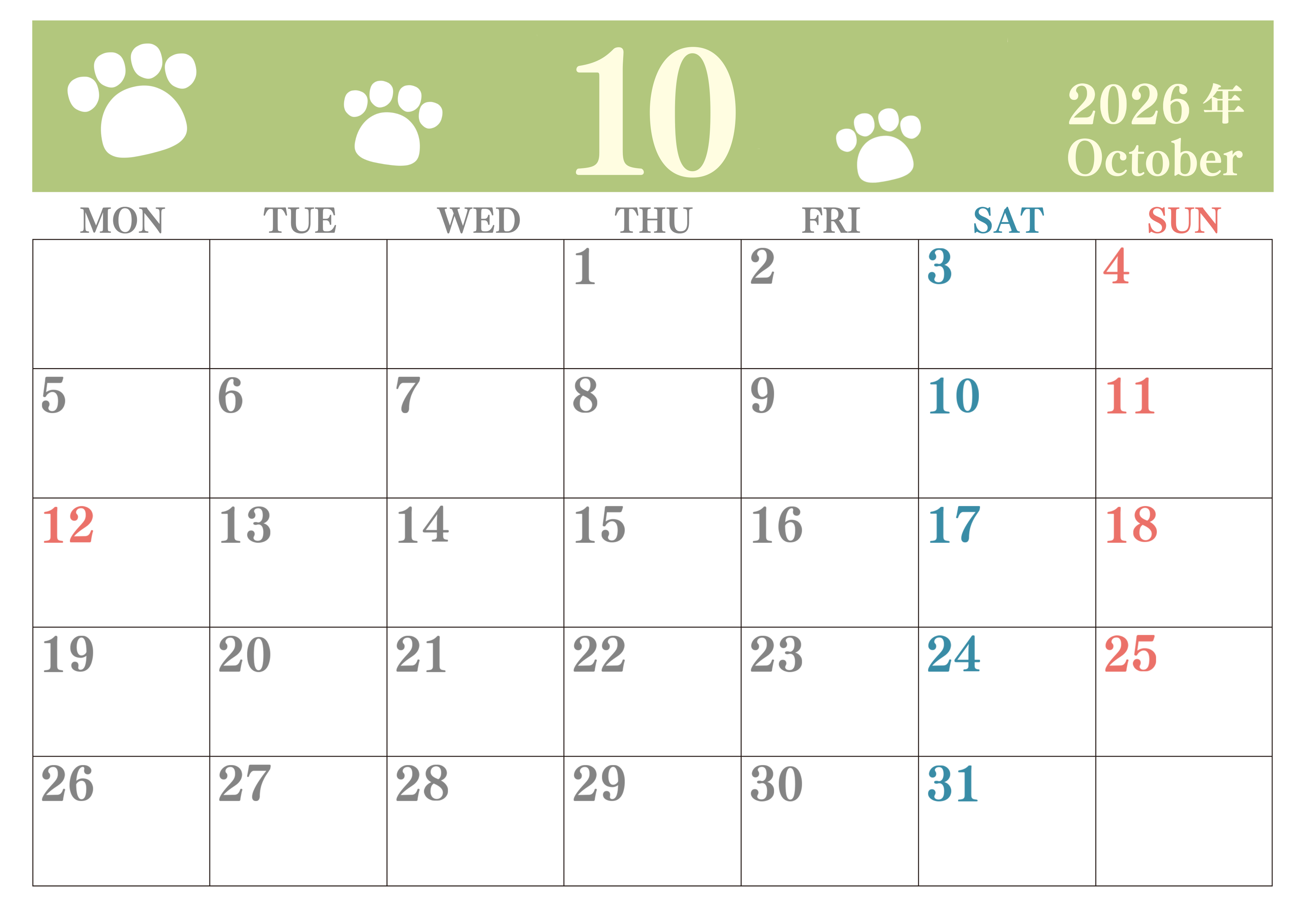 2026年10月カレンダーは横型月曜始まりで猫の肉球がゆるかわいいレイアウト!無料かつ自由に予定を書き込めます!(2026-01251001)