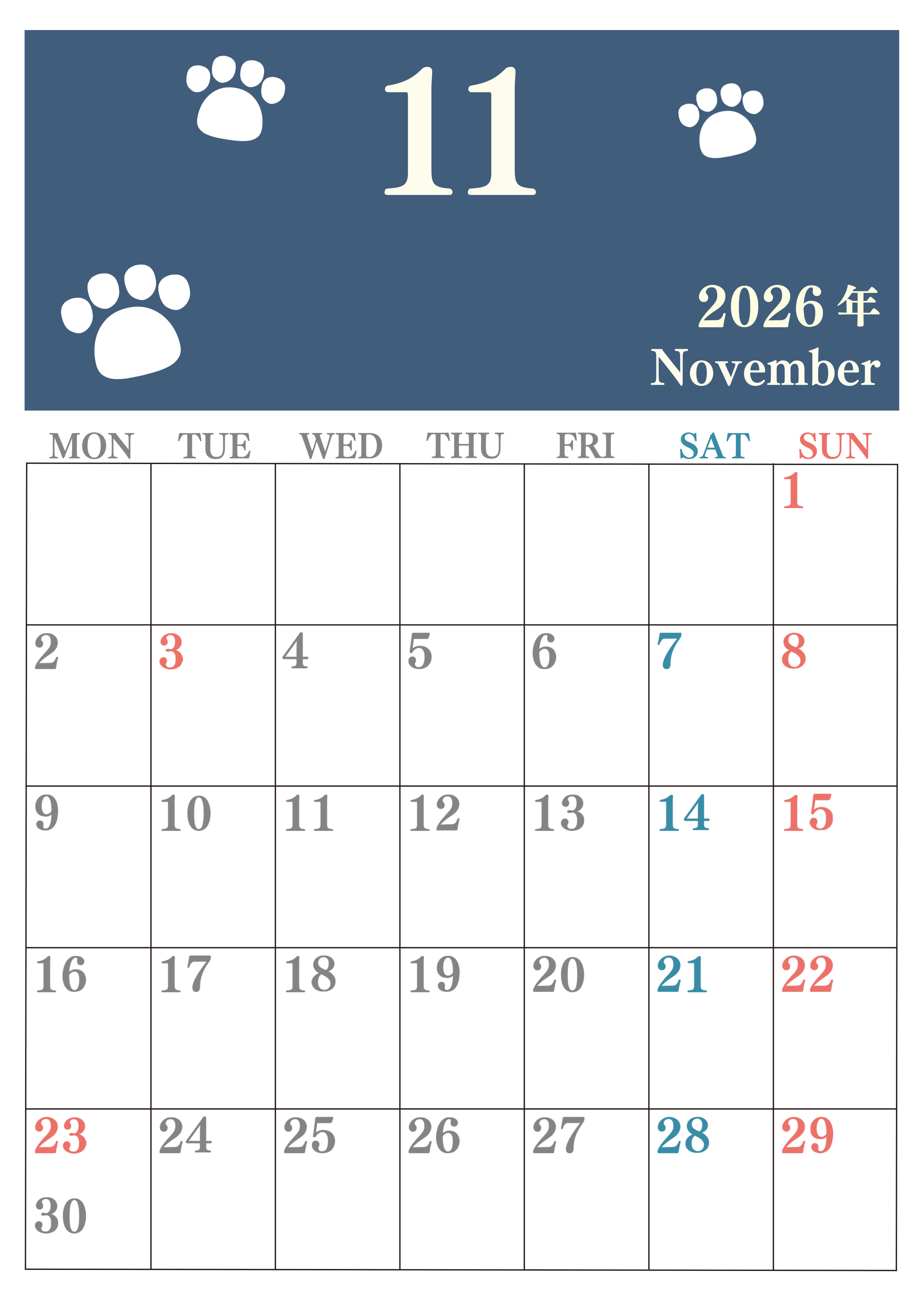 2026年11月カレンダーは縦型月曜始まりで猫の肉球がゆるかわいいレイアウト!無料かつ自由に予定を書き込めます!(2026-01251111)