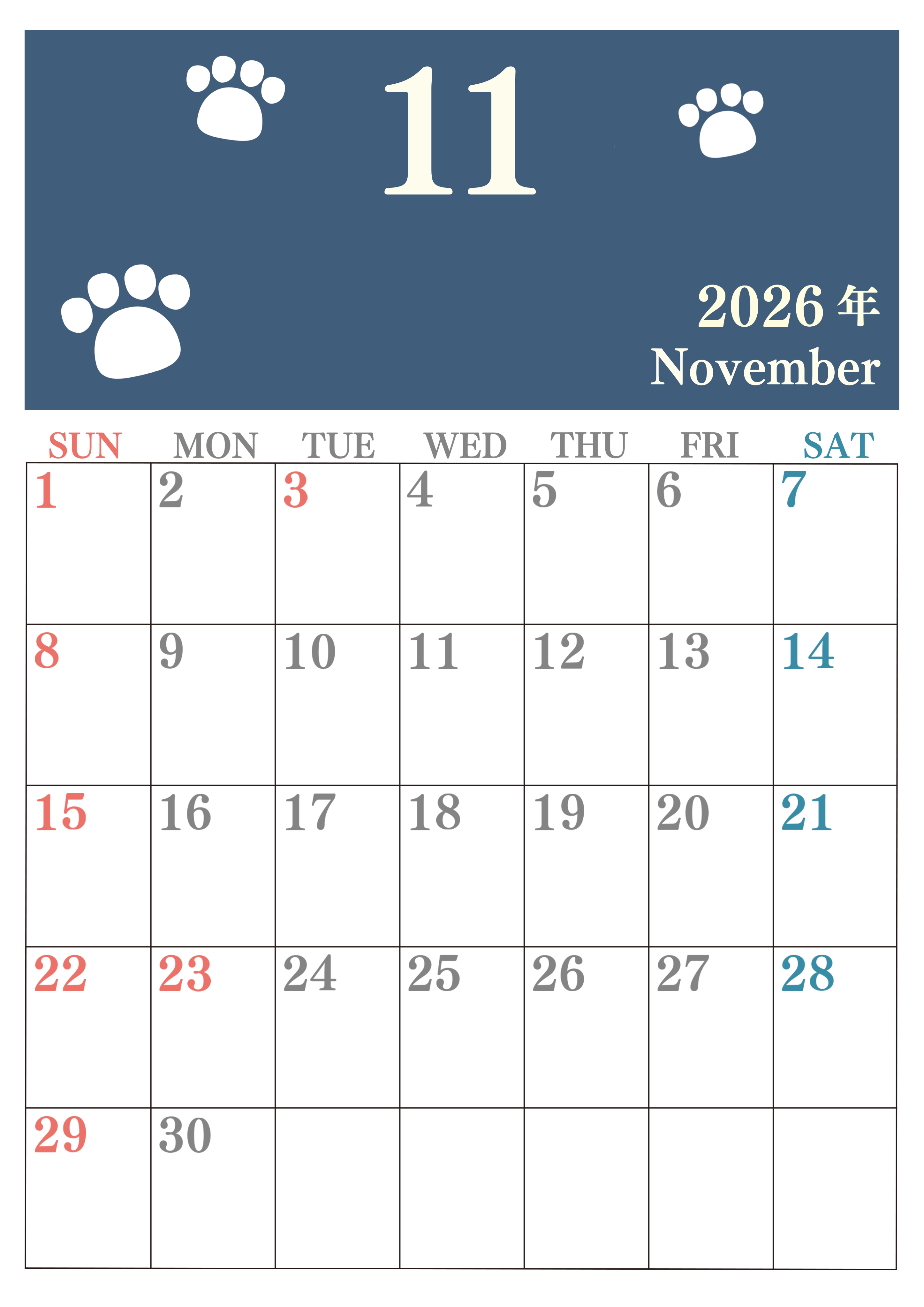 2026年・無料のカレンダーテンプレート 2026年11月カレンダーは縦型日曜始まりで猫の肉球がゆるかわいいレイアウト!無料かつ自由に予定を書き込めます!(2026-01251110) 素材状デザイン王 2025年4月9日 2026年11月カレンダーは縦型日曜始まりで猫の肉球がゆるかわいいレイアウトです。無料かつ自由に予定を書き込めます。ダウンロードしてすぐに印刷利用しませんか?(2026-01251110) かわいい 11月 猫 縦型のカレンダー 日曜始まり カレンダーデザイン-0125