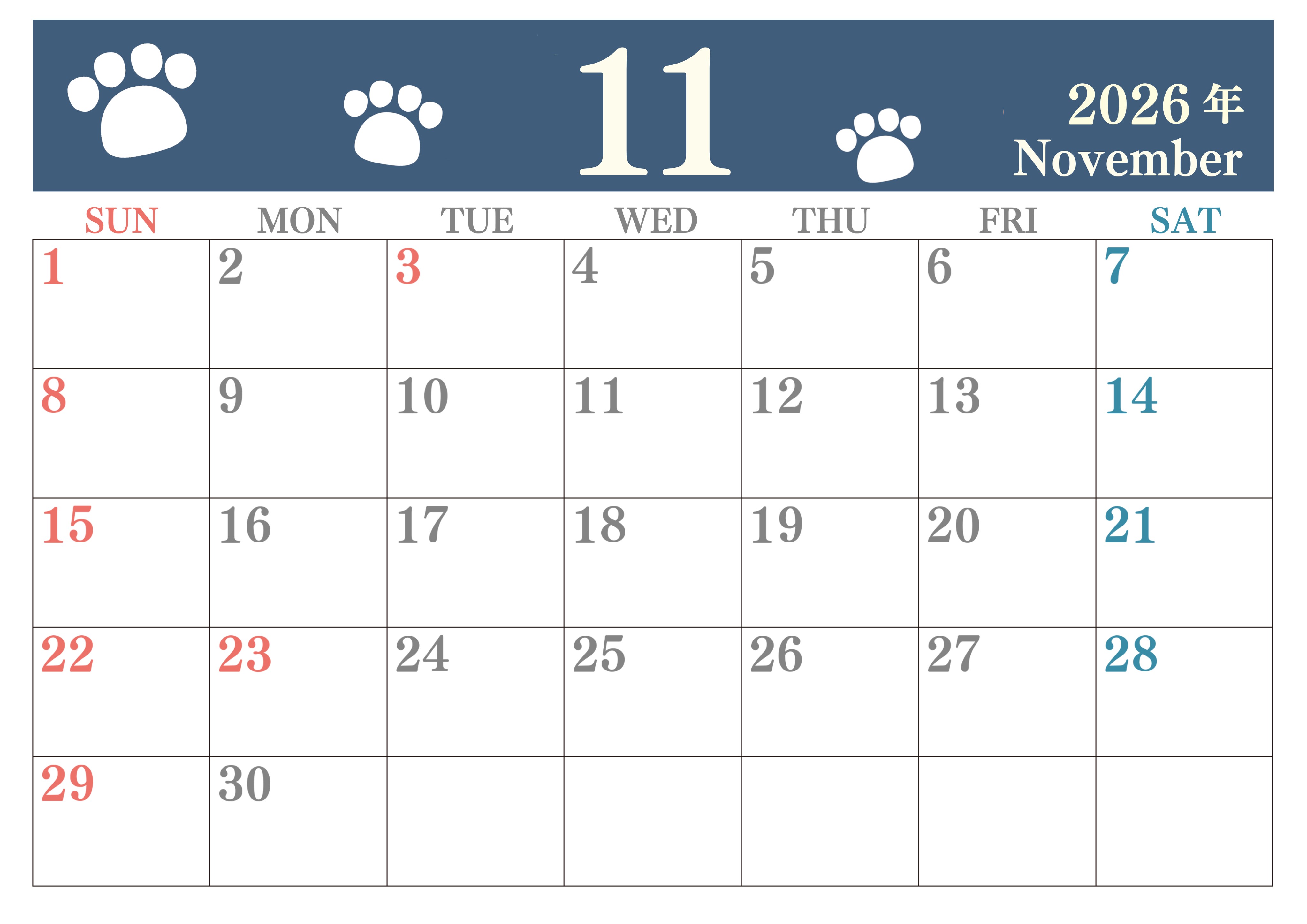 2026年・無料のカレンダーテンプレート 2026年11月カレンダーは横型日曜始まりで猫の肉球がゆるかわいいレイアウト!無料かつ自由に予定を書き込めます!(2026-01251100) 素材状デザイン王 2025年4月9日 2026年11月カレンダーは横型日曜始まりで猫の肉球がゆるかわいいレイアウトです。無料かつ自由に予定を書き込めます。ダウンロードしてすぐに印刷利用しませんか?(2026-01251100) かわいい 11月 猫 横型のカレンダー 日曜始まり カレンダーデザイン-0125