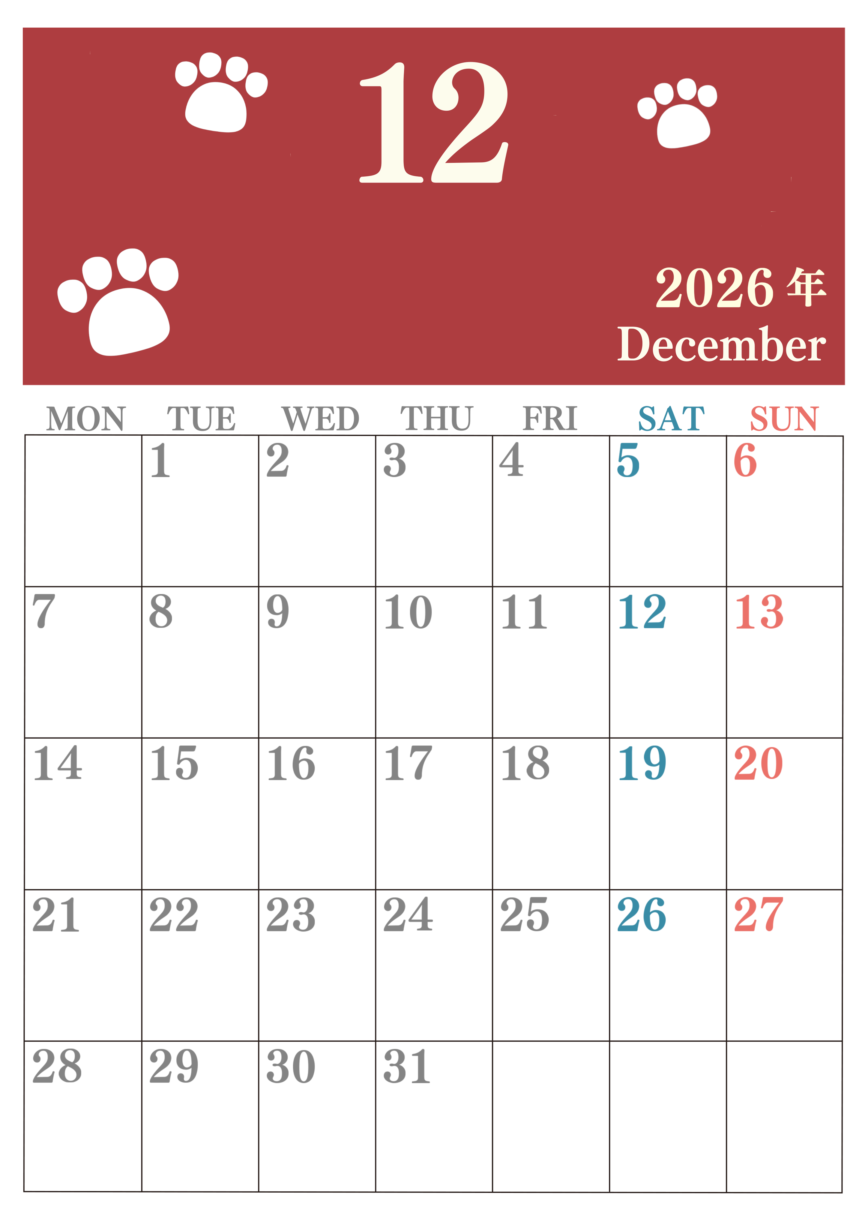 2026年・無料のカレンダーテンプレート 2026年12月カレンダーは縦型月曜始まりで猫の肉球がゆるかわいいレイアウト!無料かつ自由に予定を書き込めます!(2026-01251211) 素材状デザイン王 2025年4月9日 2026年12月カレンダーは縦型月曜始まりで猫の肉球がゆるかわいいレイアウトです。無料かつ自由に予定を書き込めます。ダウンロードしてすぐに印刷利用しませんか?(2026-01251211) かわいい 12月 猫 縦型のカレンダー 月曜始まり カレンダーデザイン-0125