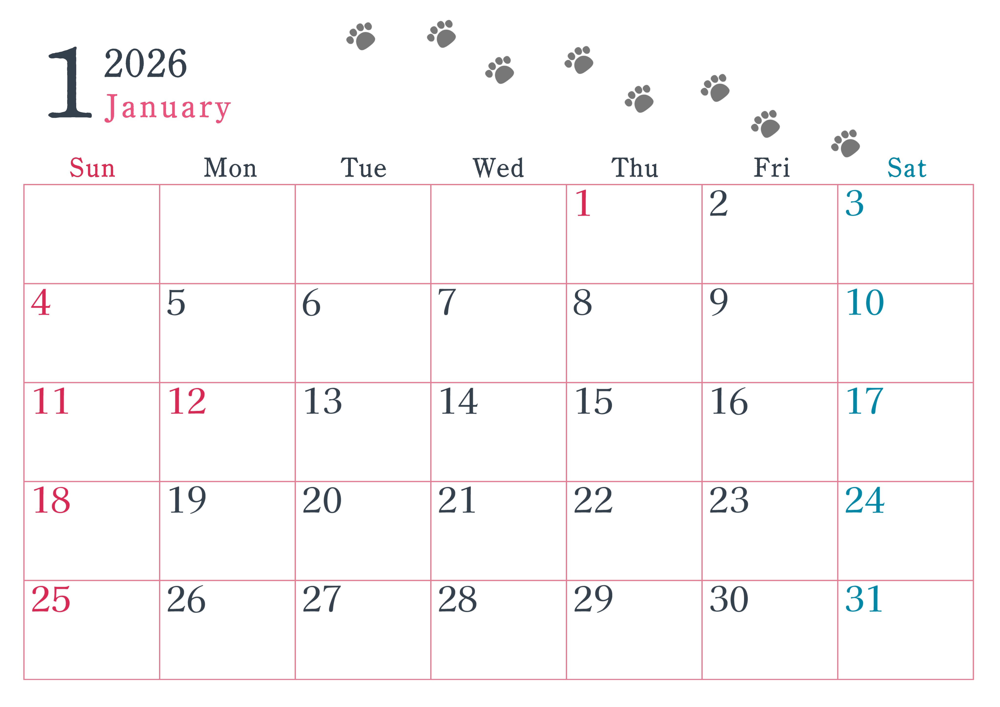 2026年・無料のカレンダーテンプレート 2026年1月カレンダーは横型日曜始まりで猫が自由気ままに歩き回った足あとがかわいい♪ダウンロード無料♪(2026-01260100) 素材状デザイン王 2025年4月9日 2026年1月カレンダーは横型日曜始まりで猫が自由気ままに歩き回った足あとがかわいいイラストつきです。ダウンロードは無料でできるので気軽にご利用ください。(2026-01260100) かわいい 1月 猫 横型のカレンダー 日曜始まり カレンダーデザイン-0126