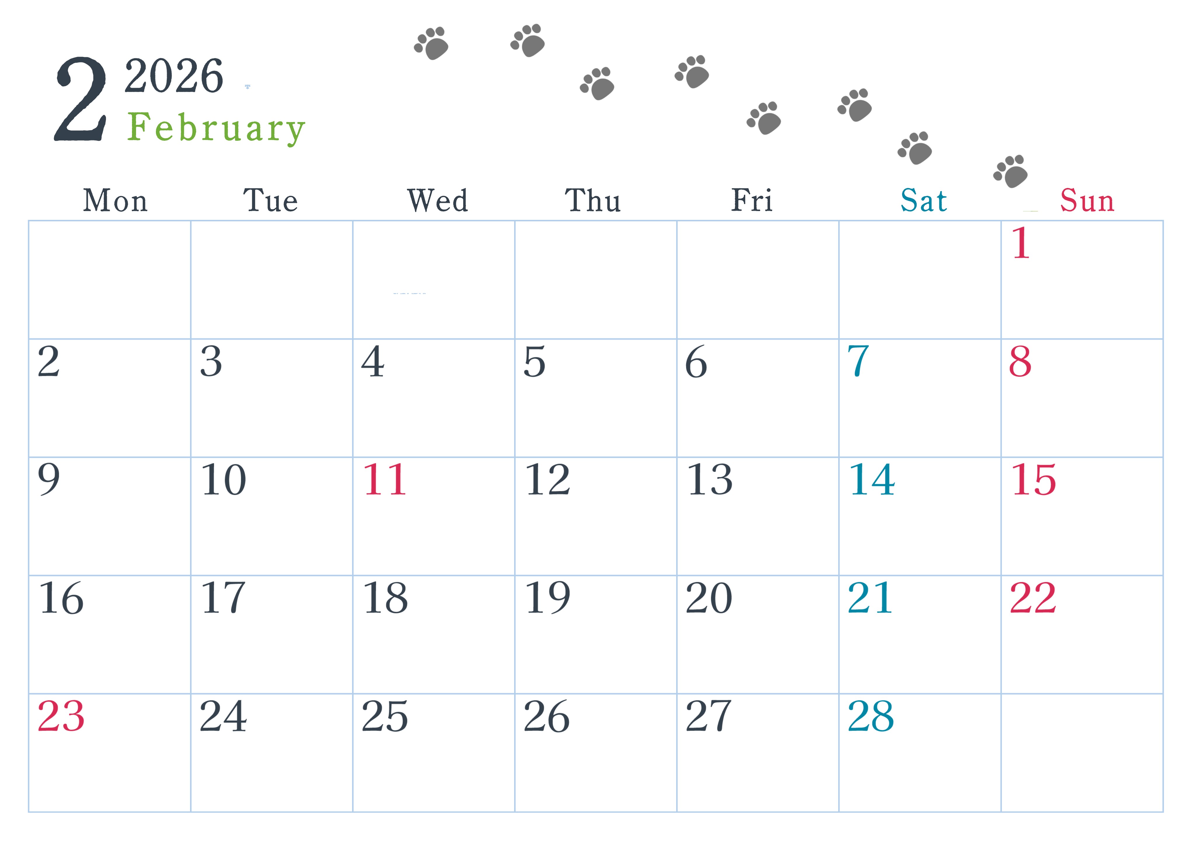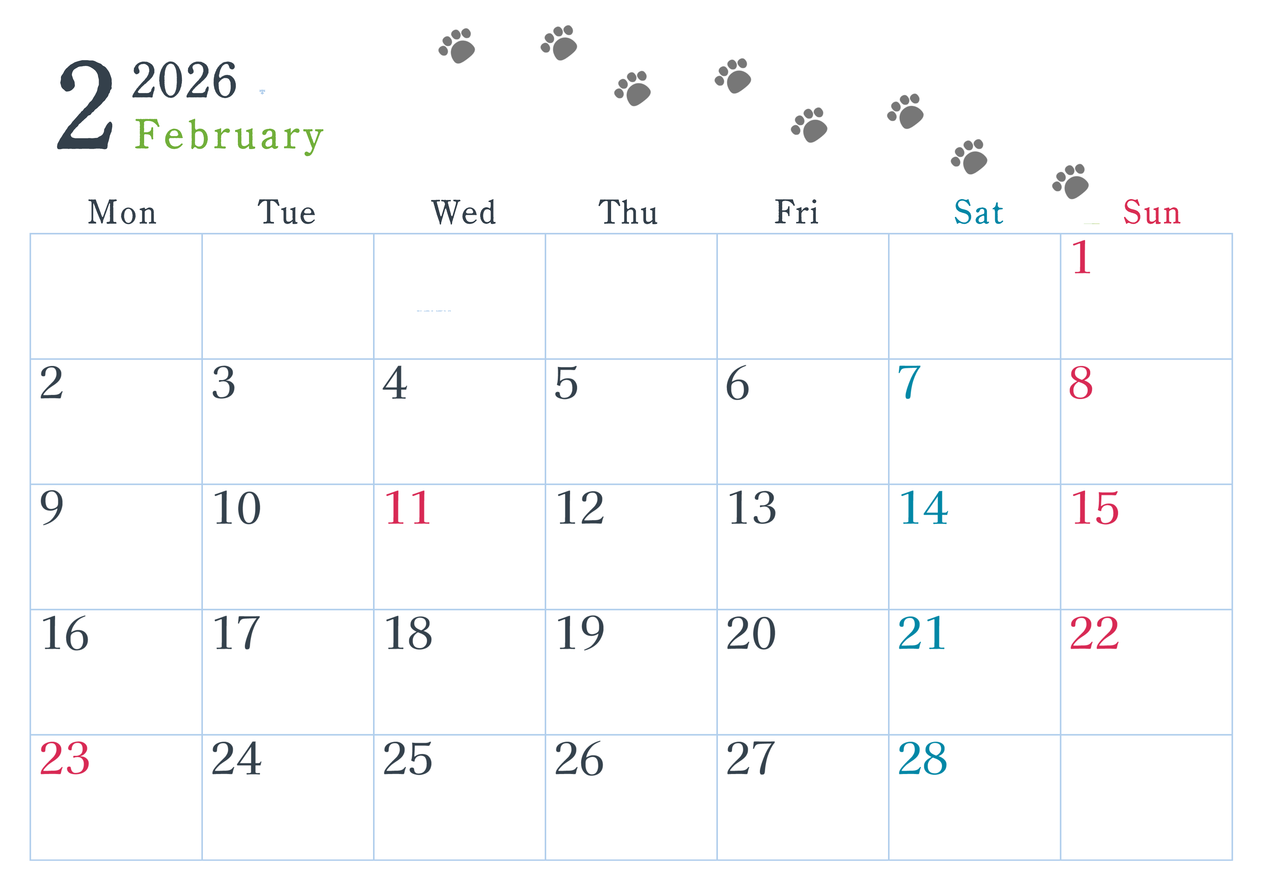 2026年2月カレンダーは横型月曜始まりで猫が自由気ままに歩き回った足あとがかわいいイラストつきです。ダウンロードは無料でできるので気軽にご利用ください。(2026-01260201)