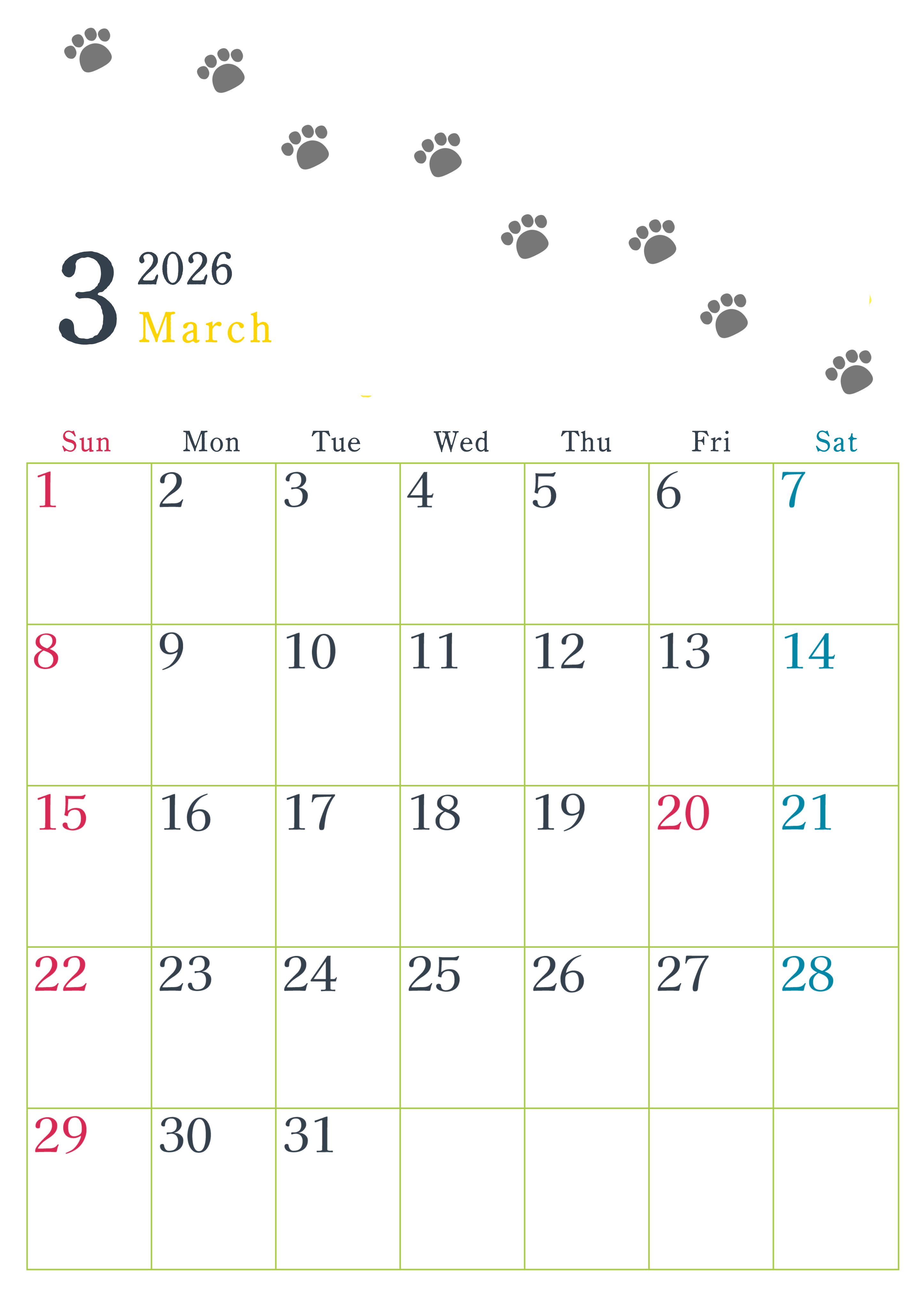 2026年・無料のカレンダーテンプレート 2026年3月カレンダーは縦型日曜始まりで猫が自由気ままに歩き回った足あとがかわいい♪ダウンロード無料♪(2026-01260310) 素材状デザイン王 2025年4月9日 2026年3月カレンダーは縦型日曜始まりで猫が自由気ままに歩き回った足あとがかわいいイラストつきです。ダウンロードは無料でできるので気軽にご利用ください。(2026-01260310) かわいい 3月 猫 縦型のカレンダー 日曜始まり カレンダーデザイン-0126