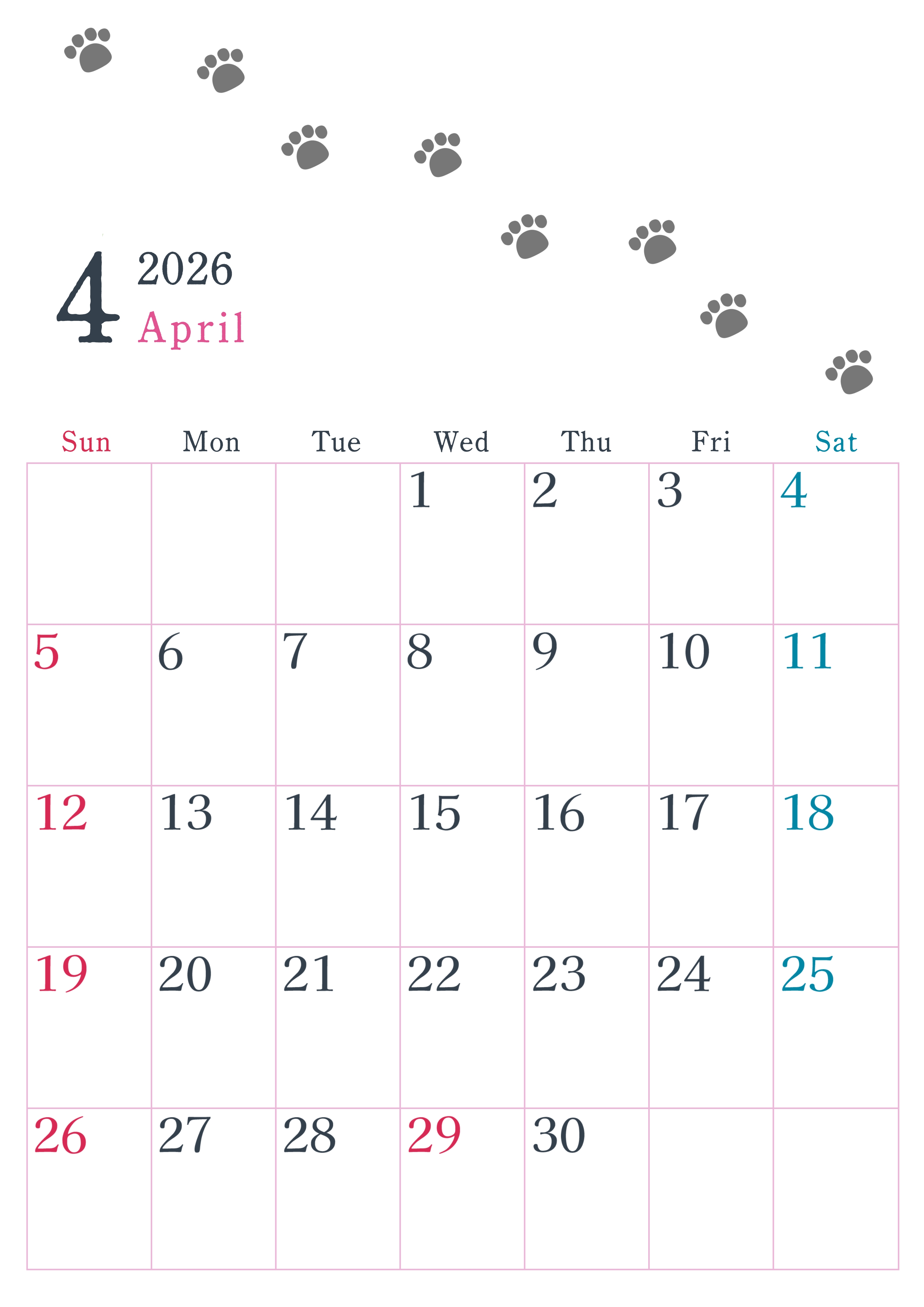 2026年4月カレンダーは縦型日曜始まりで猫が自由気ままに歩き回った足あとがかわいい♪ダウンロード無料♪(2026-01260410)