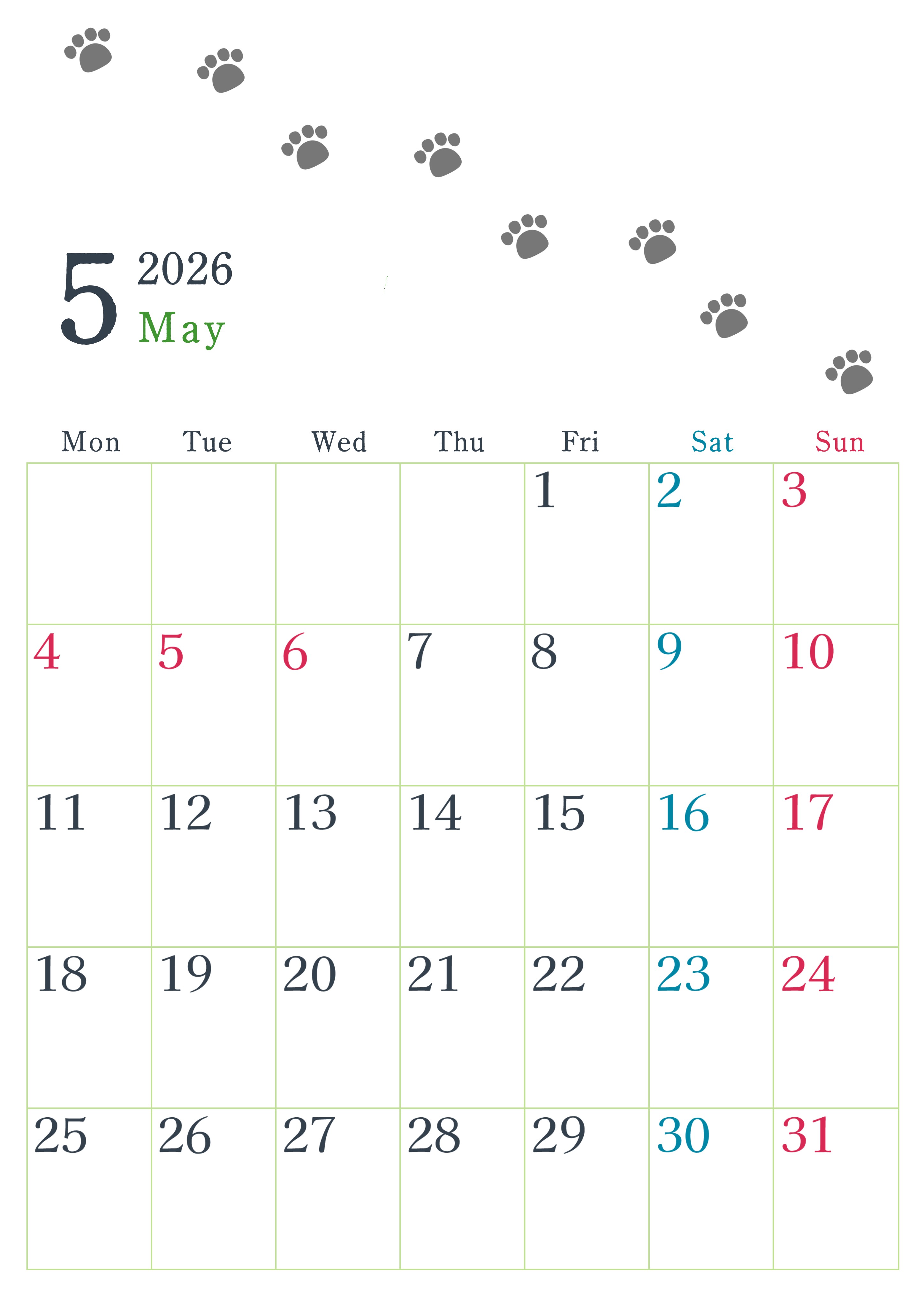 2026年・無料のカレンダーテンプレート 2026年5月カレンダーは縦型月曜始まりで猫が自由気ままに歩き回った足あとがかわいい♪ダウンロード無料♪(2026-01260511) 素材状デザイン王 2025年4月9日 2026年5月カレンダーは縦型月曜始まりで猫が自由気ままに歩き回った足あとがかわいいイラストつきです。ダウンロードは無料でできるので気軽にご利用ください。(2026-01260511) かわいい 5月 猫 縦型のカレンダー 月曜始まり カレンダーデザイン-0126