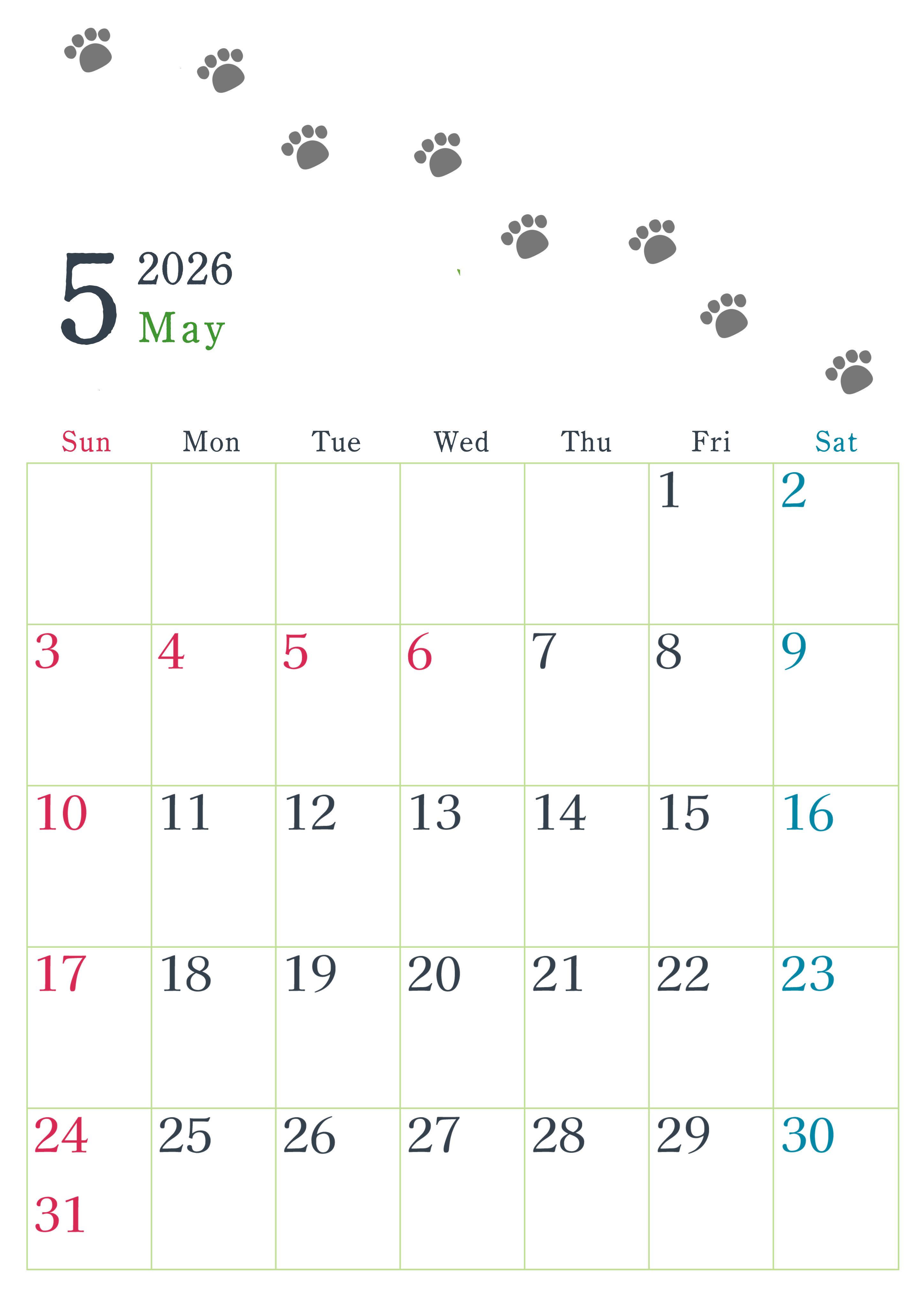 2026年・無料のカレンダーテンプレート 2026年5月カレンダーは縦型日曜始まりで猫が自由気ままに歩き回った足あとがかわいい♪ダウンロード無料♪(2026-01260510) 素材状デザイン王 2025年4月9日 2026年5月カレンダーは縦型日曜始まりで猫が自由気ままに歩き回った足あとがかわいいイラストつきです。ダウンロードは無料でできるので気軽にご利用ください。(2026-01260510) かわいい 5月 猫 縦型のカレンダー 日曜始まり カレンダーデザイン-0126