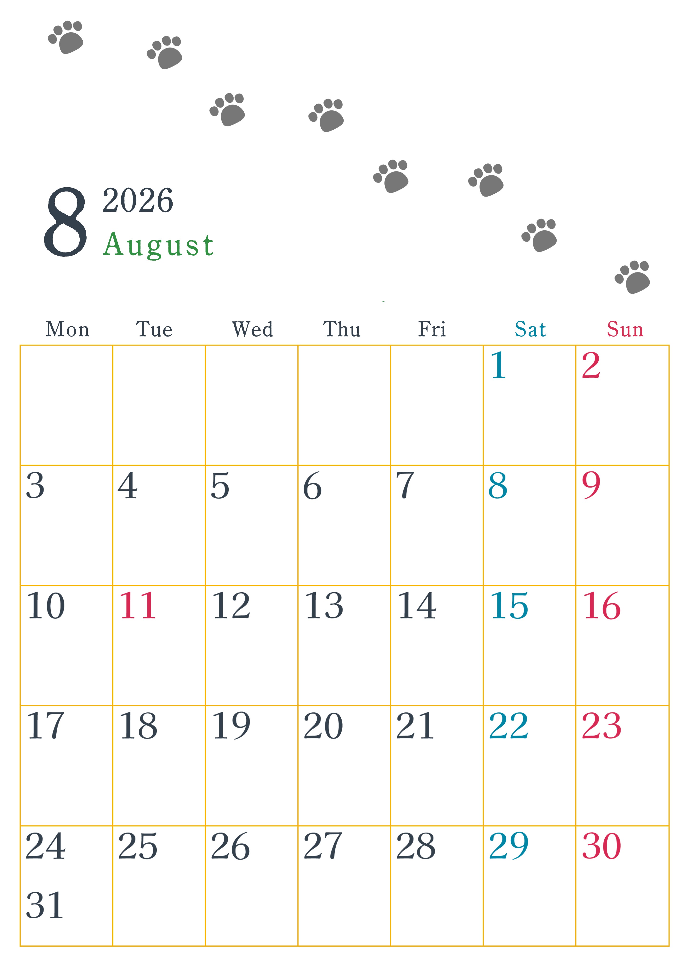 2026年・無料のカレンダーテンプレート 2026年8月カレンダーは縦型月曜始まりで猫が自由気ままに歩き回った足あとがかわいい♪ダウンロード無料♪(2026-01260811) 素材状デザイン王 2025年4月9日 2026年8月カレンダーは縦型月曜始まりで猫が自由気ままに歩き回った足あとがかわいいイラストつきです。ダウンロードは無料でできるので気軽にご利用ください。(2026-01260811) かわいい 8月 猫 縦型のカレンダー 月曜始まり カレンダーデザイン-0126