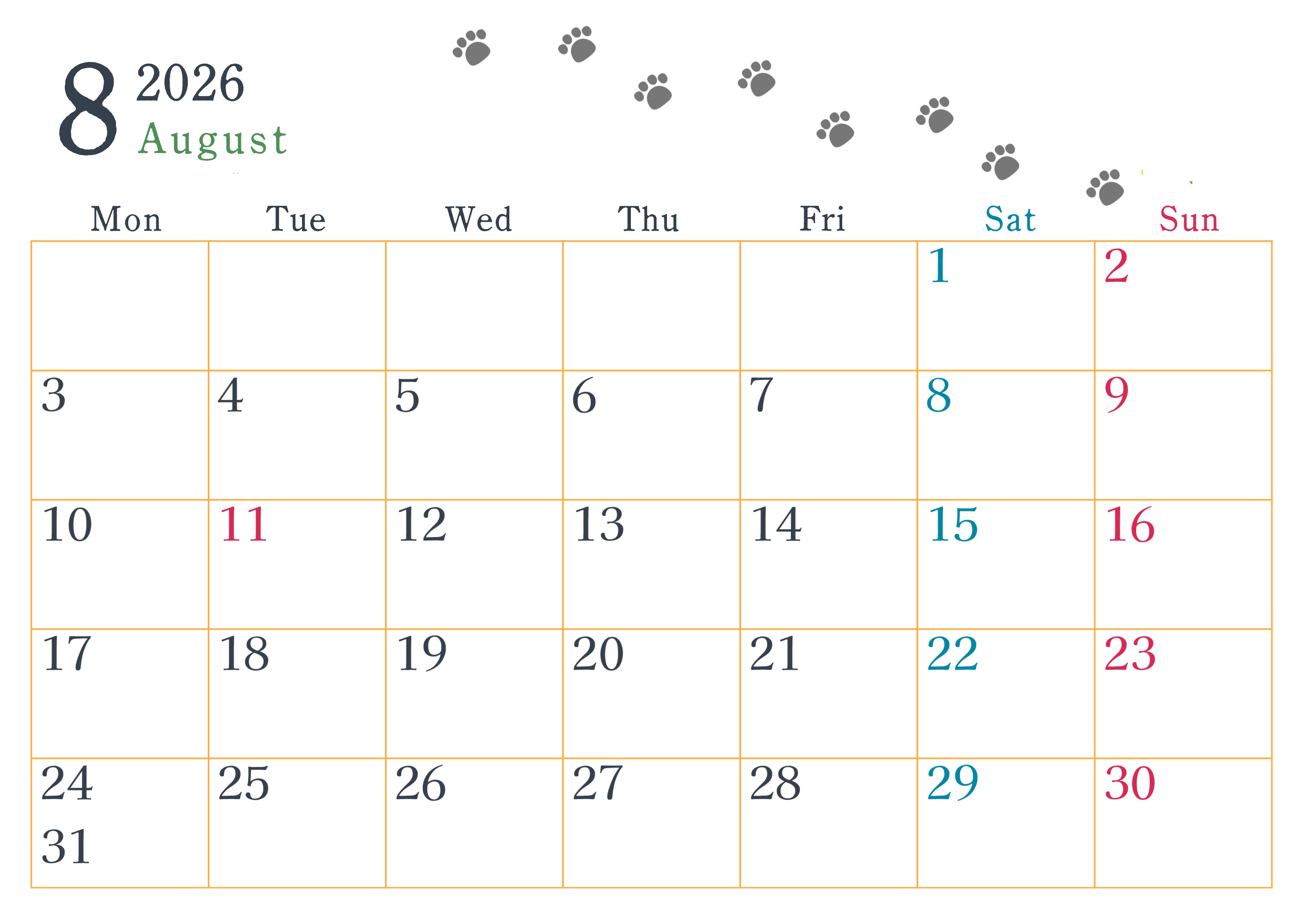 2026年・無料のカレンダーテンプレート 2026年8月カレンダーは横型月曜始まりで猫が自由気ままに歩き回った足あとがかわいい♪ダウンロード無料♪(2026-01260801) 素材状デザイン王 2025年4月9日 2026年8月カレンダーは横型月曜始まりで猫が自由気ままに歩き回った足あとがかわいいイラストつきです。ダウンロードは無料でできるので気軽にご利用ください。(2026-01260801) かわいい 8月 猫 横型のカレンダー 月曜始まり カレンダーデザイン-0126