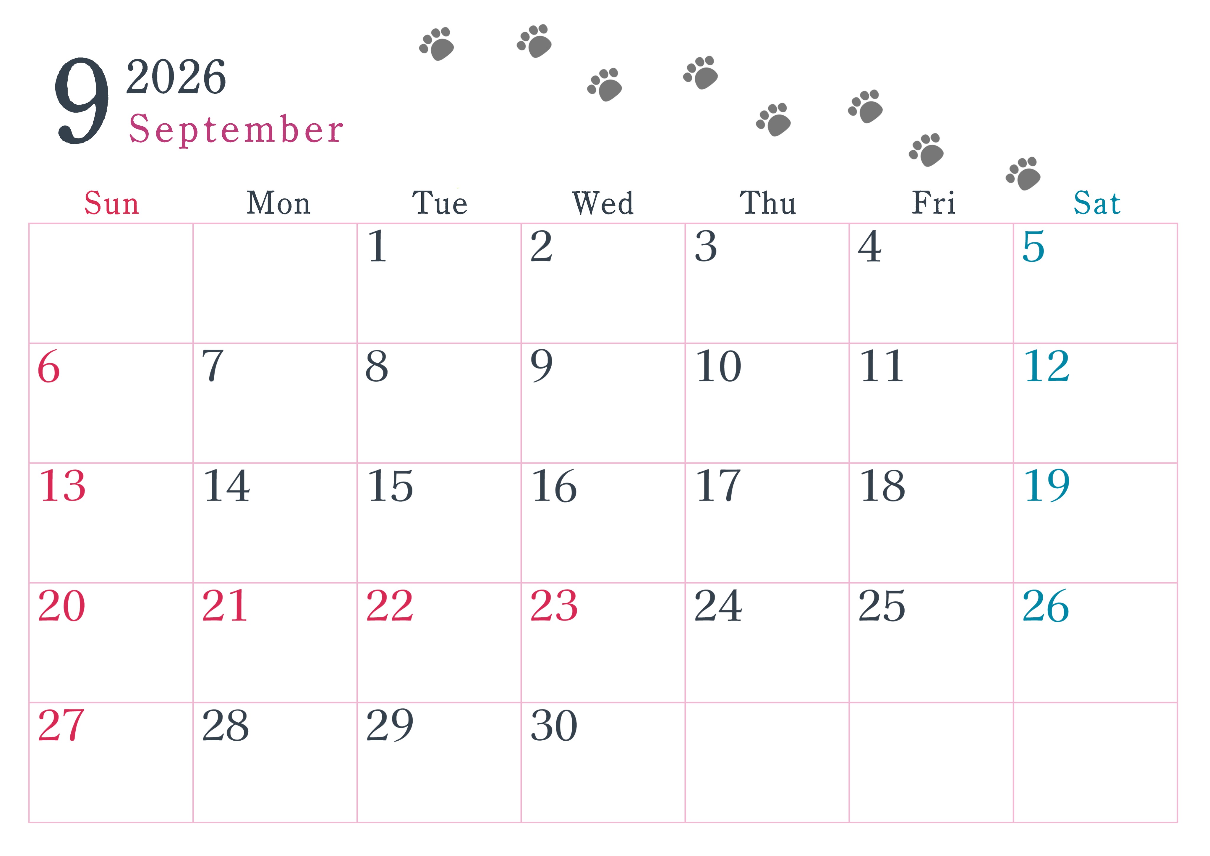 2026年9月カレンダーは横型日曜始まりで猫が自由気ままに歩き回った足あとがかわいい♪ダウンロード無料♪(2026-01260900)