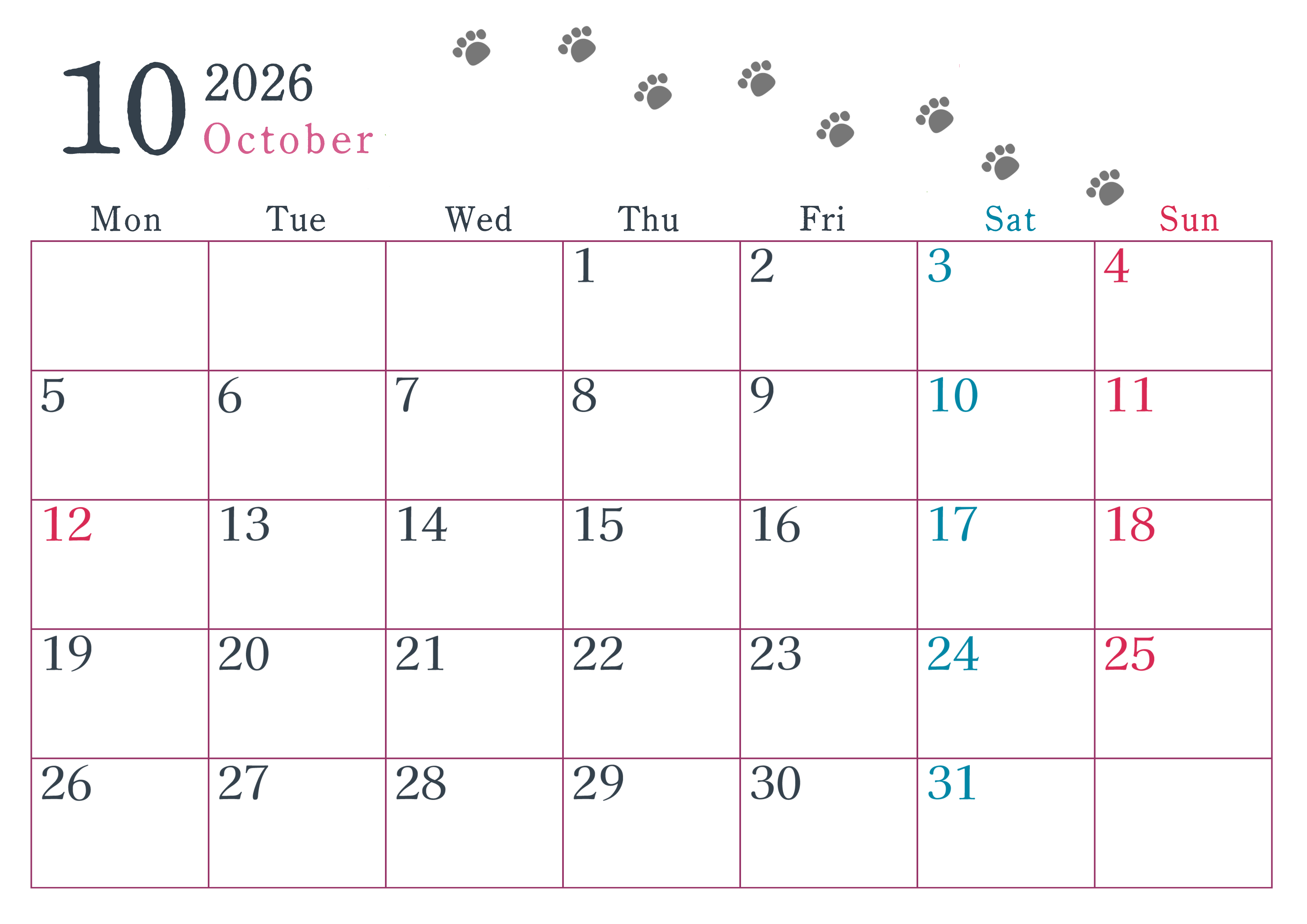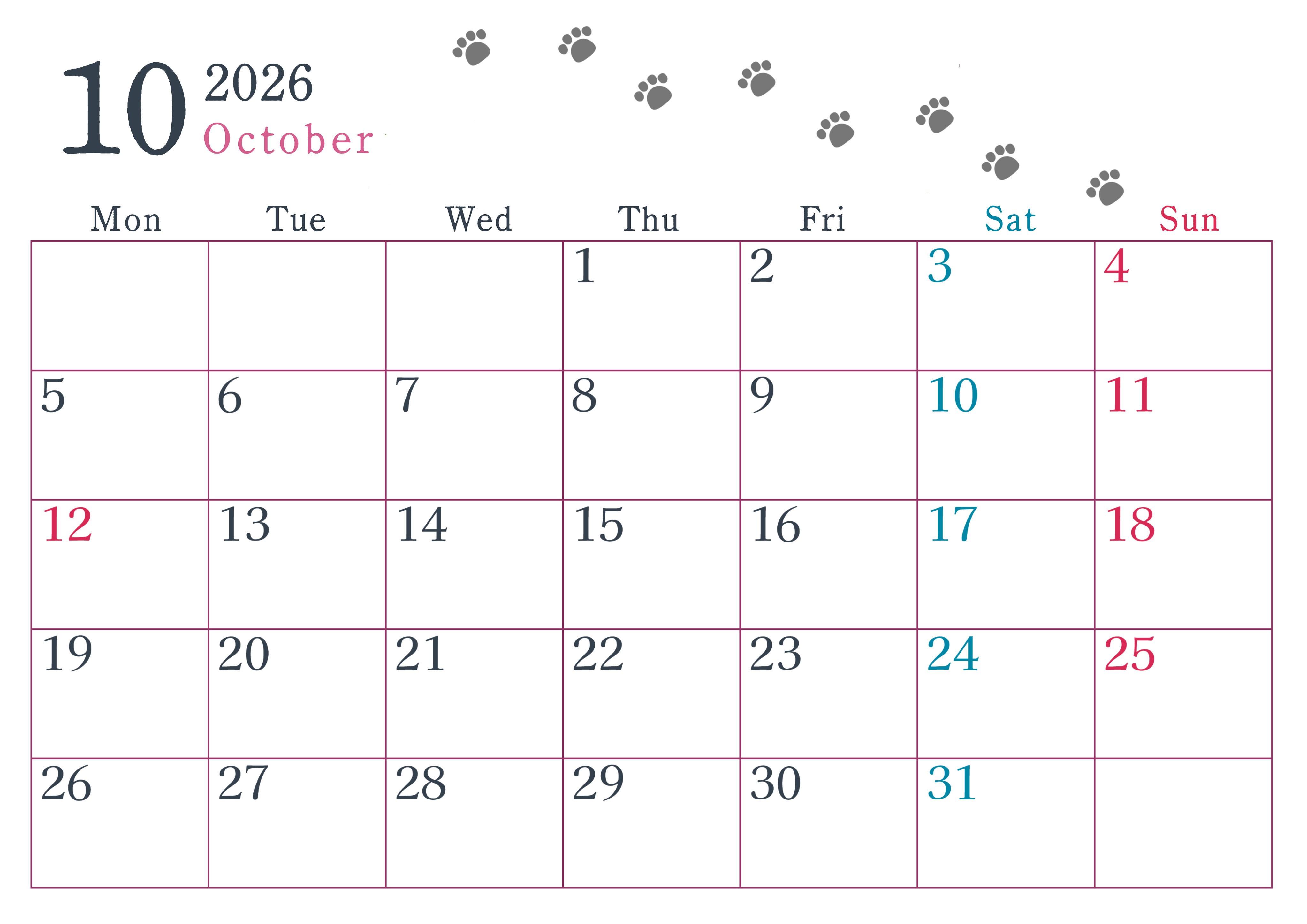 2026年・無料のカレンダーテンプレート 2026年10月カレンダーは横型月曜始まりで猫が自由気ままに歩き回った足あとがかわいい♪ダウンロード無料♪(2026-01261001) 素材状デザイン王 2025年4月9日 2026年10月カレンダーは横型月曜始まりで猫が自由気ままに歩き回った足あとがかわいいイラストつきです。ダウンロードは無料でできるので気軽にご利用ください。(2026-01261001) かわいい 10月 猫 横型のカレンダー 月曜始まり カレンダーデザイン-0126