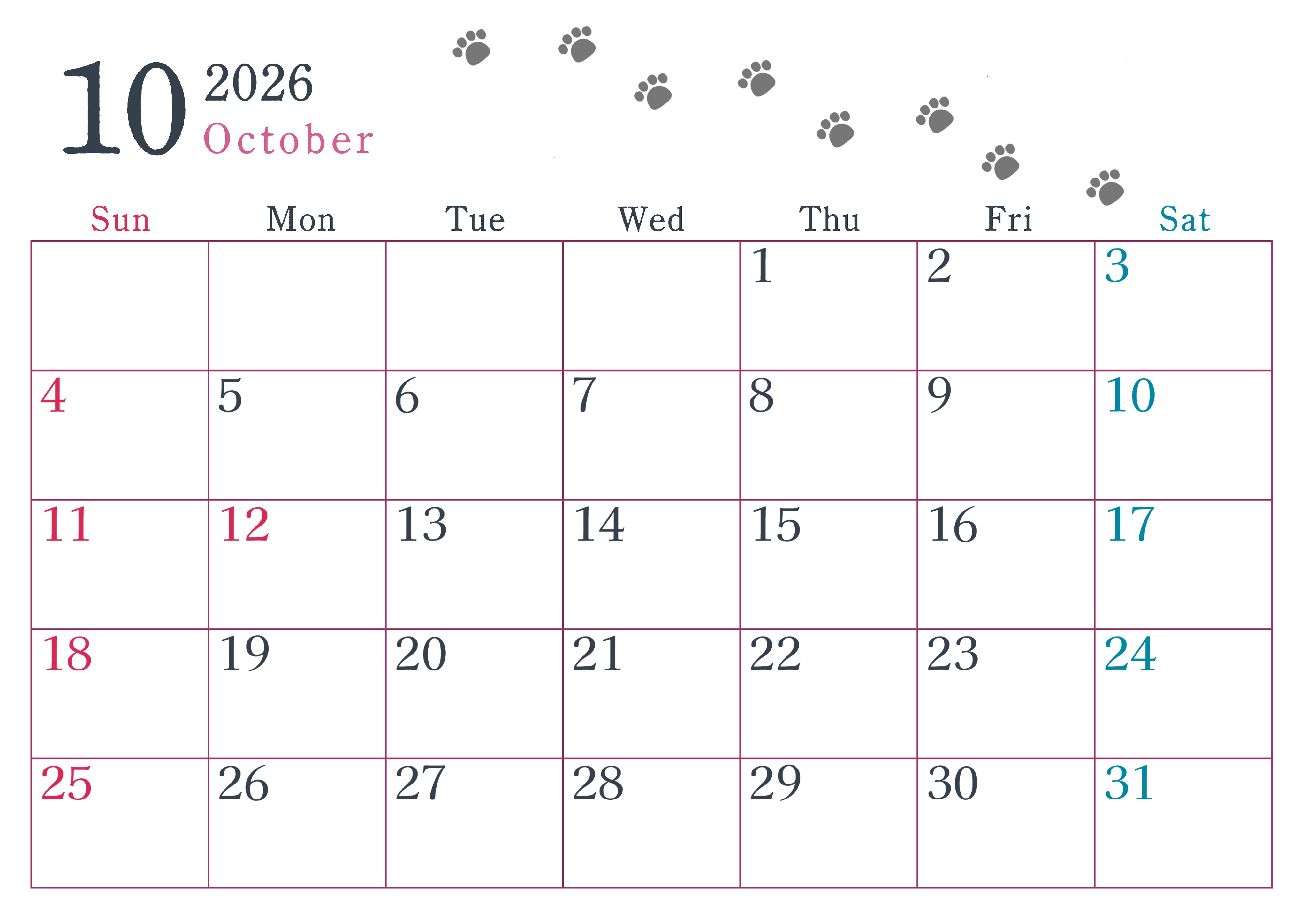 2026年・無料のカレンダーテンプレート 2026年10月カレンダーは横型日曜始まりで猫が自由気ままに歩き回った足あとがかわいい♪ダウンロード無料♪(2026-01261000) 素材状デザイン王 2025年4月9日 2026年10月カレンダーは横型日曜始まりで猫が自由気ままに歩き回った足あとがかわいいイラストつきです。ダウンロードは無料でできるので気軽にご利用ください。(2026-01261000) かわいい 10月 猫 横型のカレンダー 日曜始まり カレンダーデザイン-0126