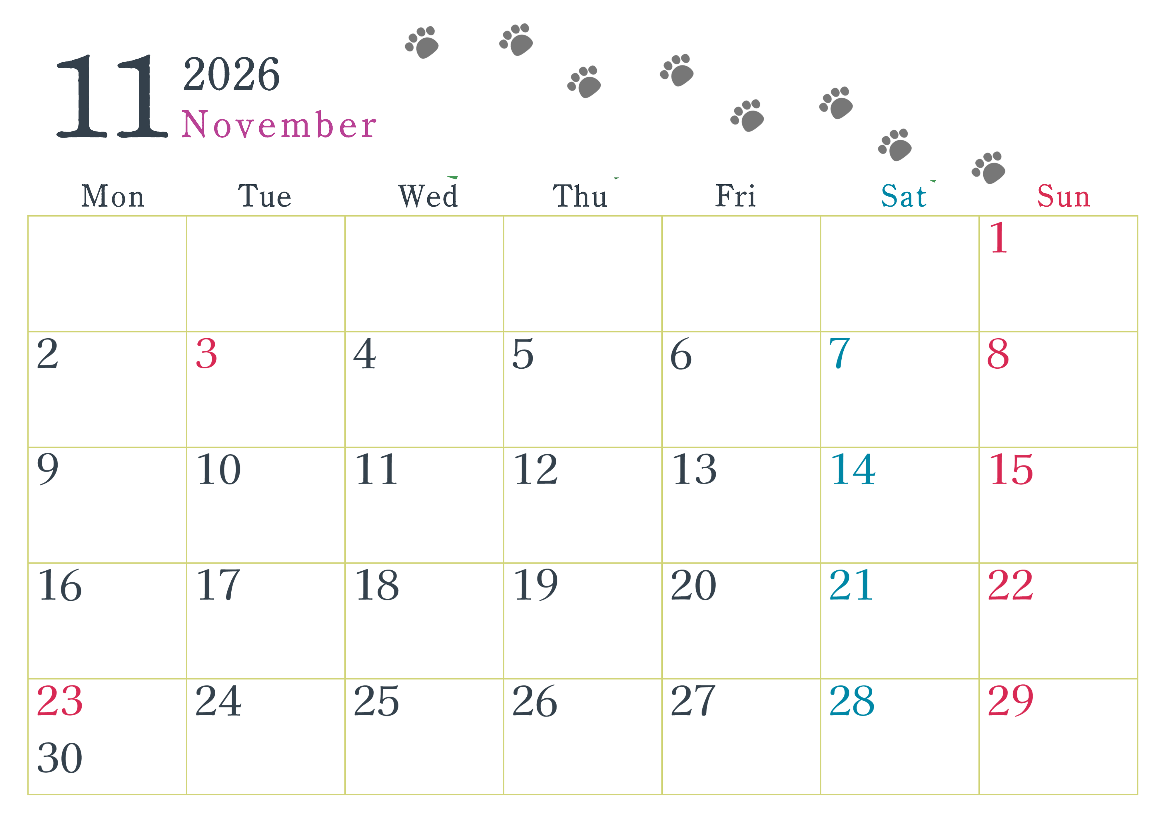 2026年・無料のカレンダーテンプレート 2026年11月カレンダーは横型月曜始まりで猫が自由気ままに歩き回った足あとがかわいい♪ダウンロード無料♪(2026-01261101) 素材状デザイン王 2025年4月9日 2026年11月カレンダーは横型月曜始まりで猫が自由気ままに歩き回った足あとがかわいいイラストつきです。ダウンロードは無料でできるので気軽にご利用ください。(2026-01261101) かわいい 11月 猫 横型のカレンダー 月曜始まり カレンダーデザイン-0126