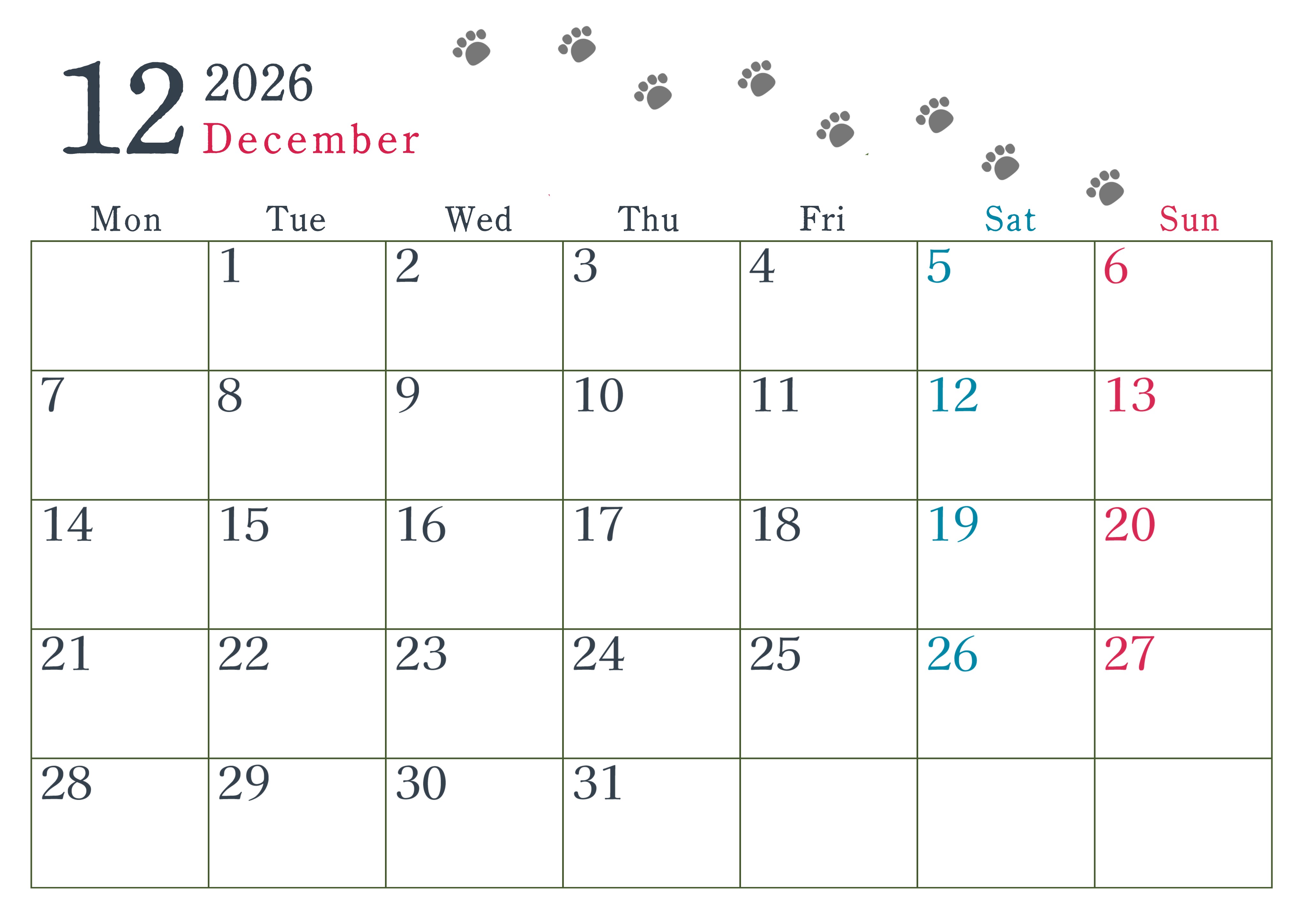 2026年・無料のカレンダーテンプレート 2026年12月カレンダーは横型月曜始まりで猫が自由気ままに歩き回った足あとがかわいい♪ダウンロード無料♪(2026-01261201) 素材状デザイン王 2025年4月9日 2026年12月カレンダーは横型月曜始まりで猫が自由気ままに歩き回った足あとがかわいいイラストつきです。ダウンロードは無料でできるので気軽にご利用ください。(2026-01261201) かわいい 12月 猫 横型のカレンダー 月曜始まり カレンダーデザイン-0126