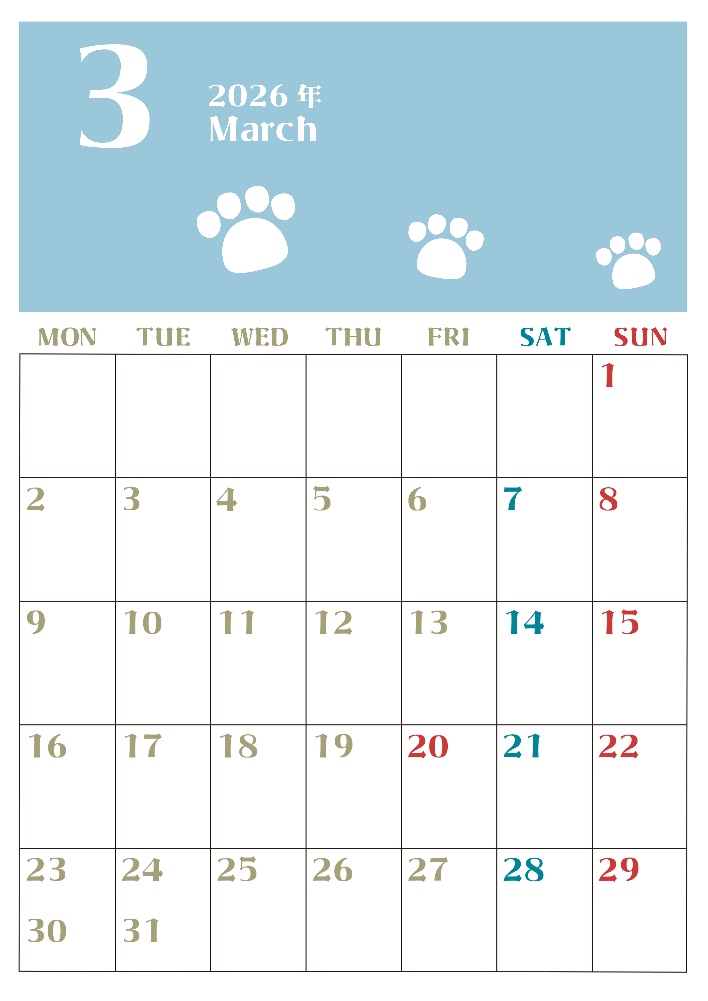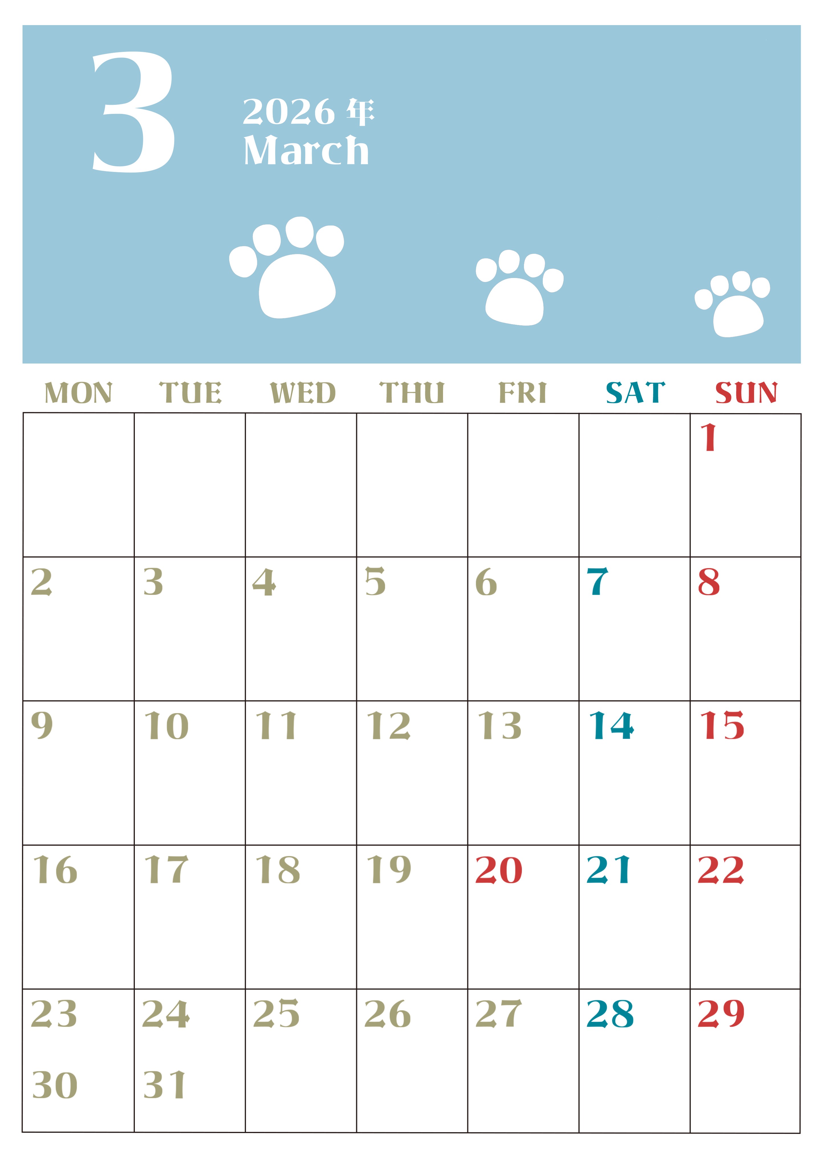 2026年・無料のカレンダーテンプレート 2026年3月カレンダーは縦型月曜始まりで猫の肉球がおしゃれかわいいカラフルな無料イラスト付き素材♪(2026-01270311) 素材状デザイン王 2025年4月9日 2026年3月カレンダーは縦型月曜始まりで猫の肉球がおしゃれかわいいカラフルな無料イラスト付き素材です。白いゆるかわいい猫の足あとが毎月カラフルな色のカレンダーに添えられているので楽しくスケジュール管理ができます。(2026-01270311) おしゃれ 3月 猫 縦型のカレンダー 月曜始まり カレンダーデザイン-0127