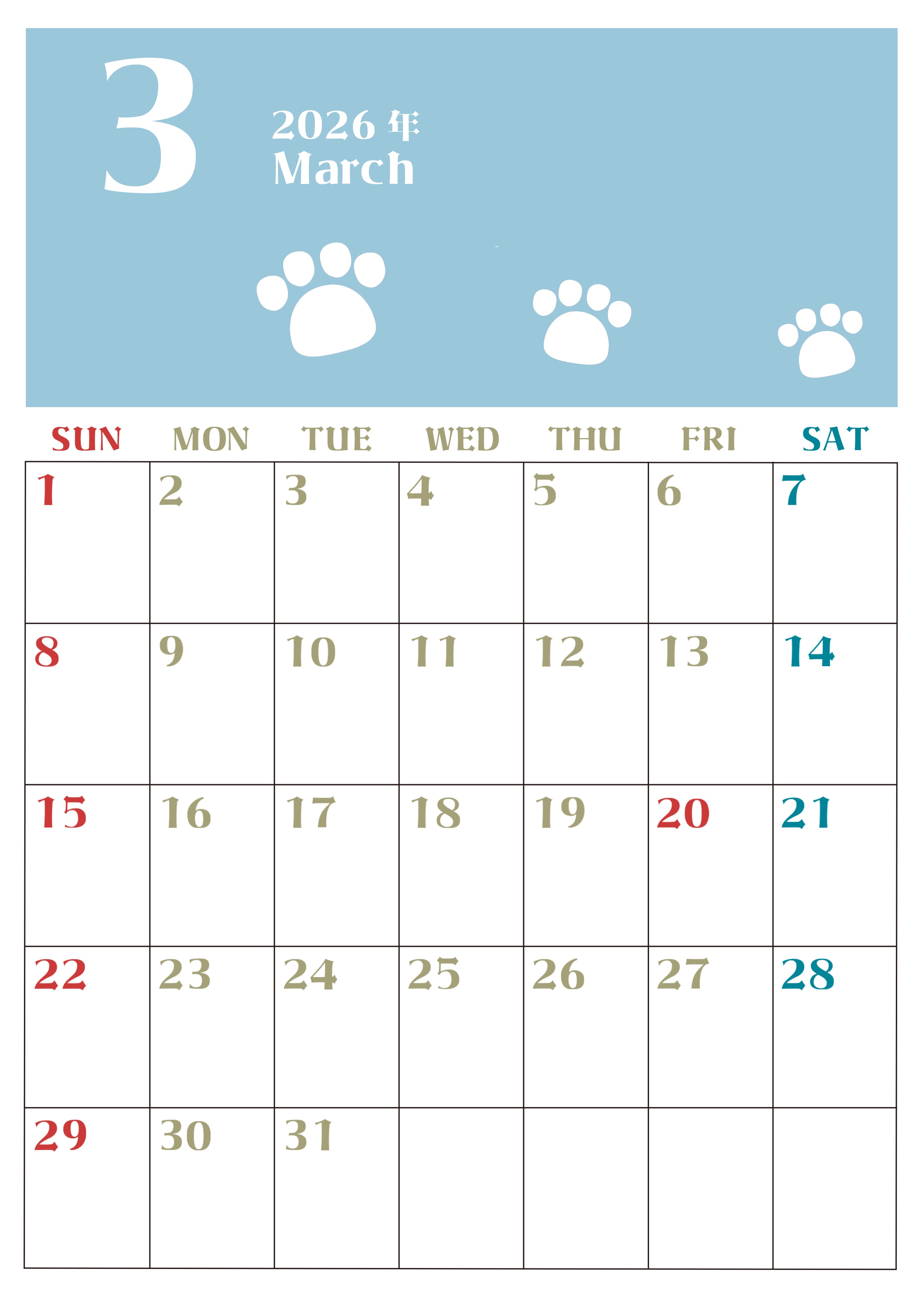 2026年3月カレンダーは縦型日曜始まりで猫の肉球がおしゃれかわいいカラフルな無料イラスト付き素材♪(2026-01270310)