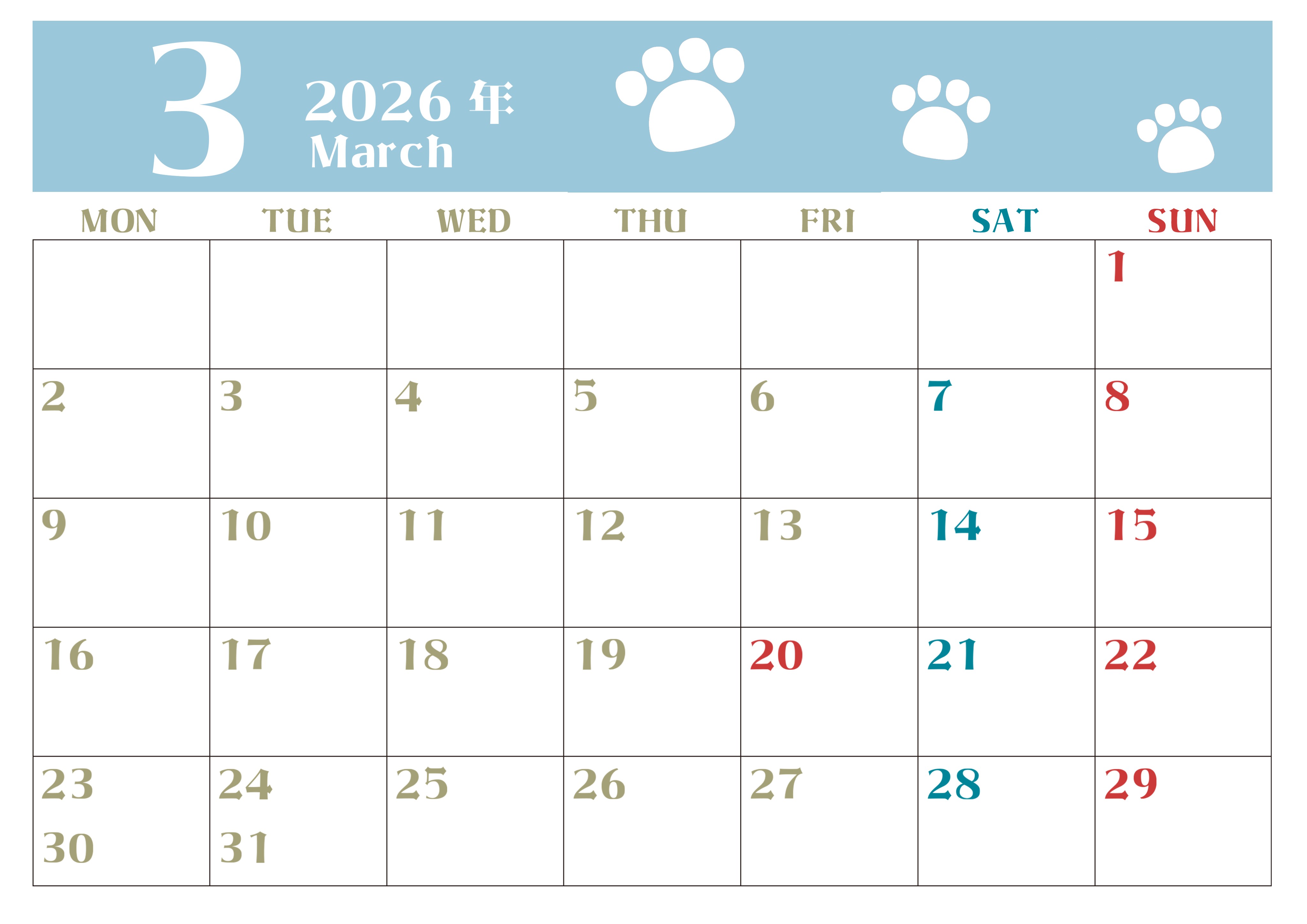 2026年・無料のカレンダーテンプレート 2026年3月カレンダーは横型月曜始まりで猫の肉球がおしゃれかわいいカラフルな無料イラスト付き素材♪(2026-01270301) 素材状デザイン王 2025年4月9日 2026年3月カレンダーは横型月曜始まりで猫の肉球がおしゃれかわいいカラフルな無料イラスト付き素材です。白いゆるかわいい猫の足あとが毎月カラフルな色のカレンダーに添えられているので楽しくスケジュール管理ができます。(2026-01270301) おしゃれ 3月 猫 横型のカレンダー 月曜始まり カレンダーデザイン-0127