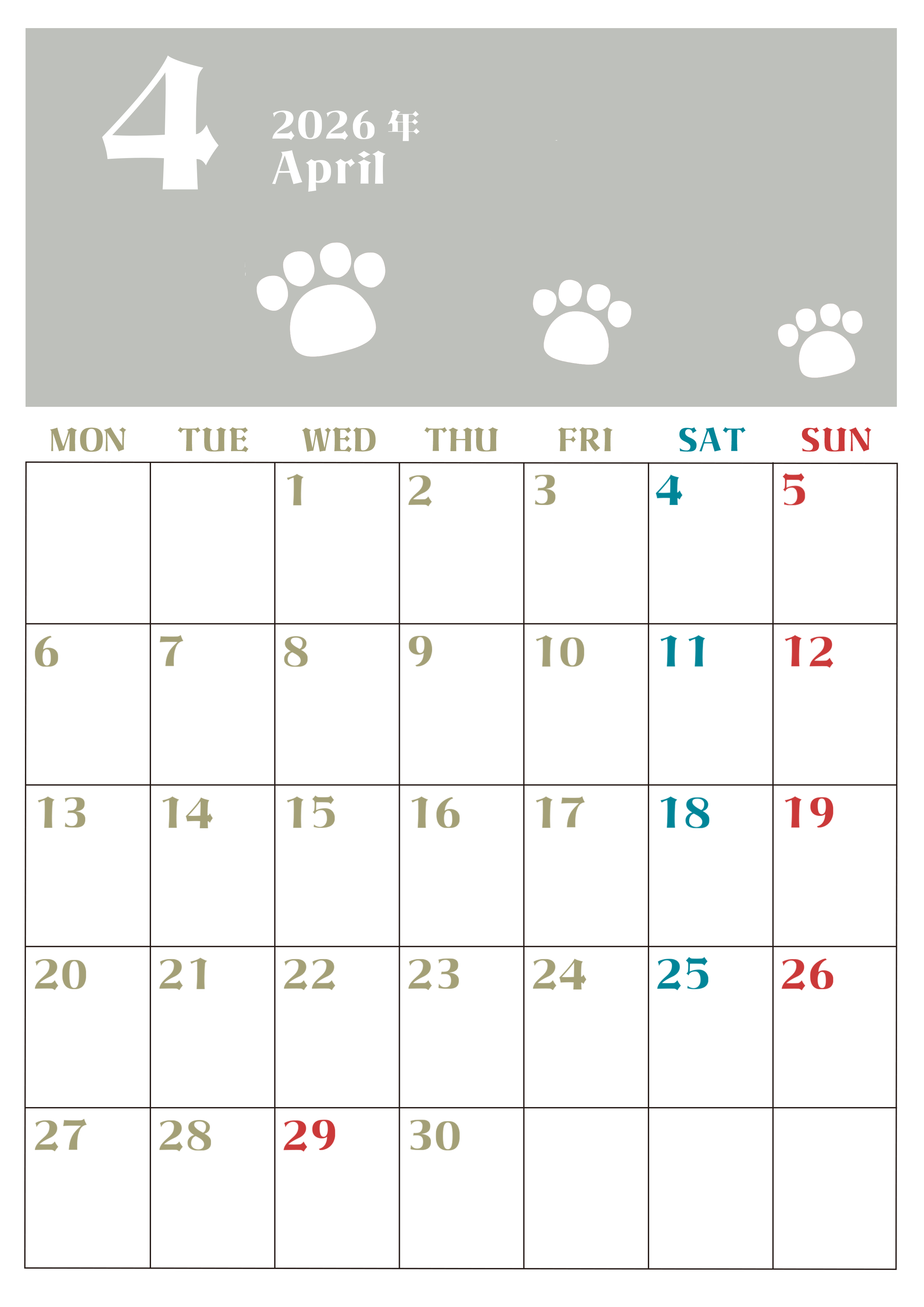 2026年・無料のカレンダーテンプレート 2026年4月カレンダーは縦型月曜始まりで猫の肉球がおしゃれかわいいカラフルな無料イラスト付き素材♪(2026-01270411) 素材状デザイン王 2025年4月9日 2026年4月カレンダーは縦型月曜始まりで猫の肉球がおしゃれかわいいカラフルな無料イラスト付き素材です。白いゆるかわいい猫の足あとが毎月カラフルな色のカレンダーに添えられているので楽しくスケジュール管理ができます。(2026-01270411) おしゃれ 4月 猫 縦型のカレンダー 月曜始まり カレンダーデザイン-0127