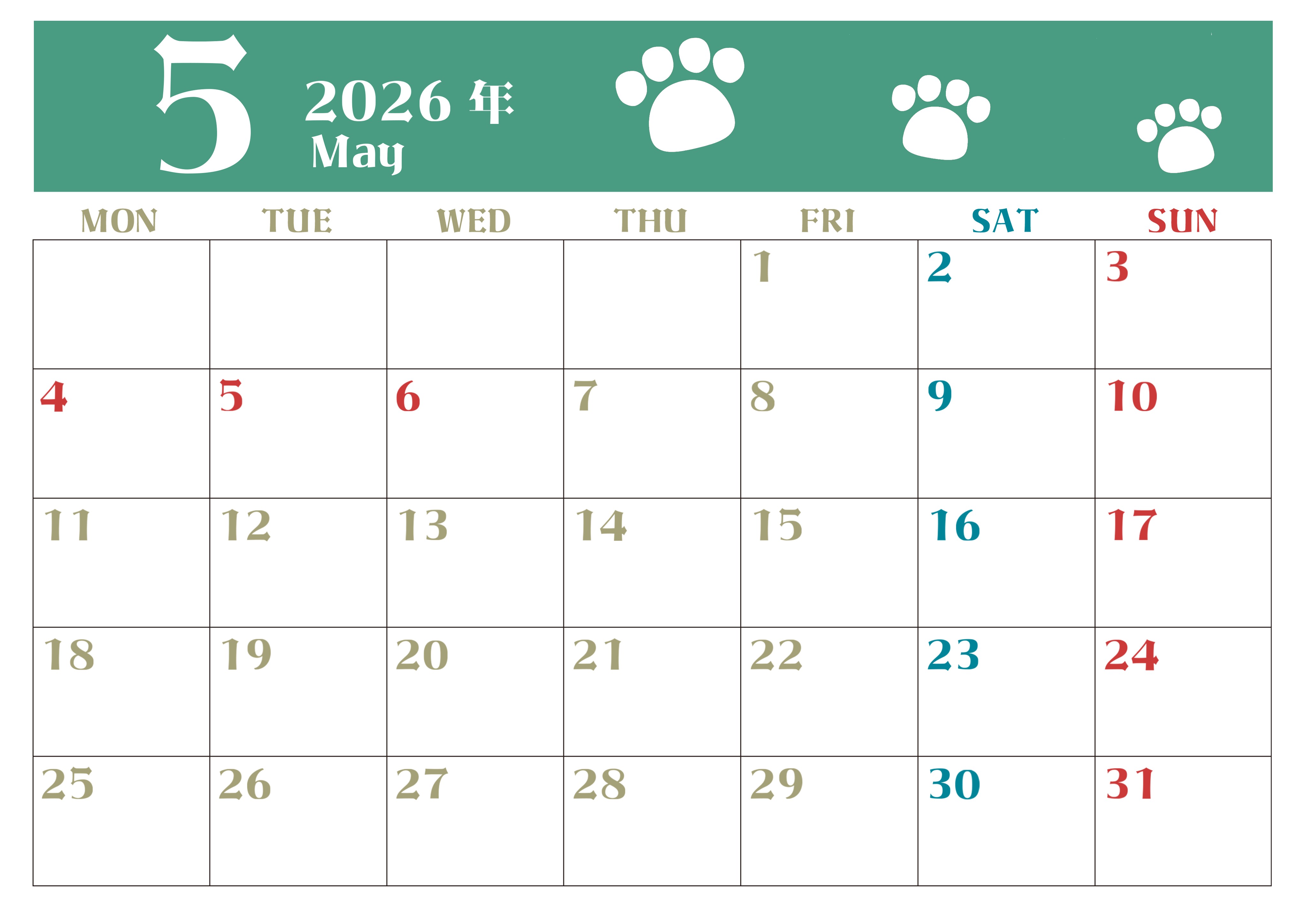 2026年・無料のカレンダーテンプレート 2026年5月カレンダーは横型月曜始まりで猫の肉球がおしゃれかわいいカラフルな無料イラスト付き素材♪(2026-01270501) 素材状デザイン王 2025年4月9日 2026年5月カレンダーは横型月曜始まりで猫の肉球がおしゃれかわいいカラフルな無料イラスト付き素材です。白いゆるかわいい猫の足あとが毎月カラフルな色のカレンダーに添えられているので楽しくスケジュール管理ができます。(2026-01270501) おしゃれ 5月 猫 横型のカレンダー 月曜始まり カレンダーデザイン-0127