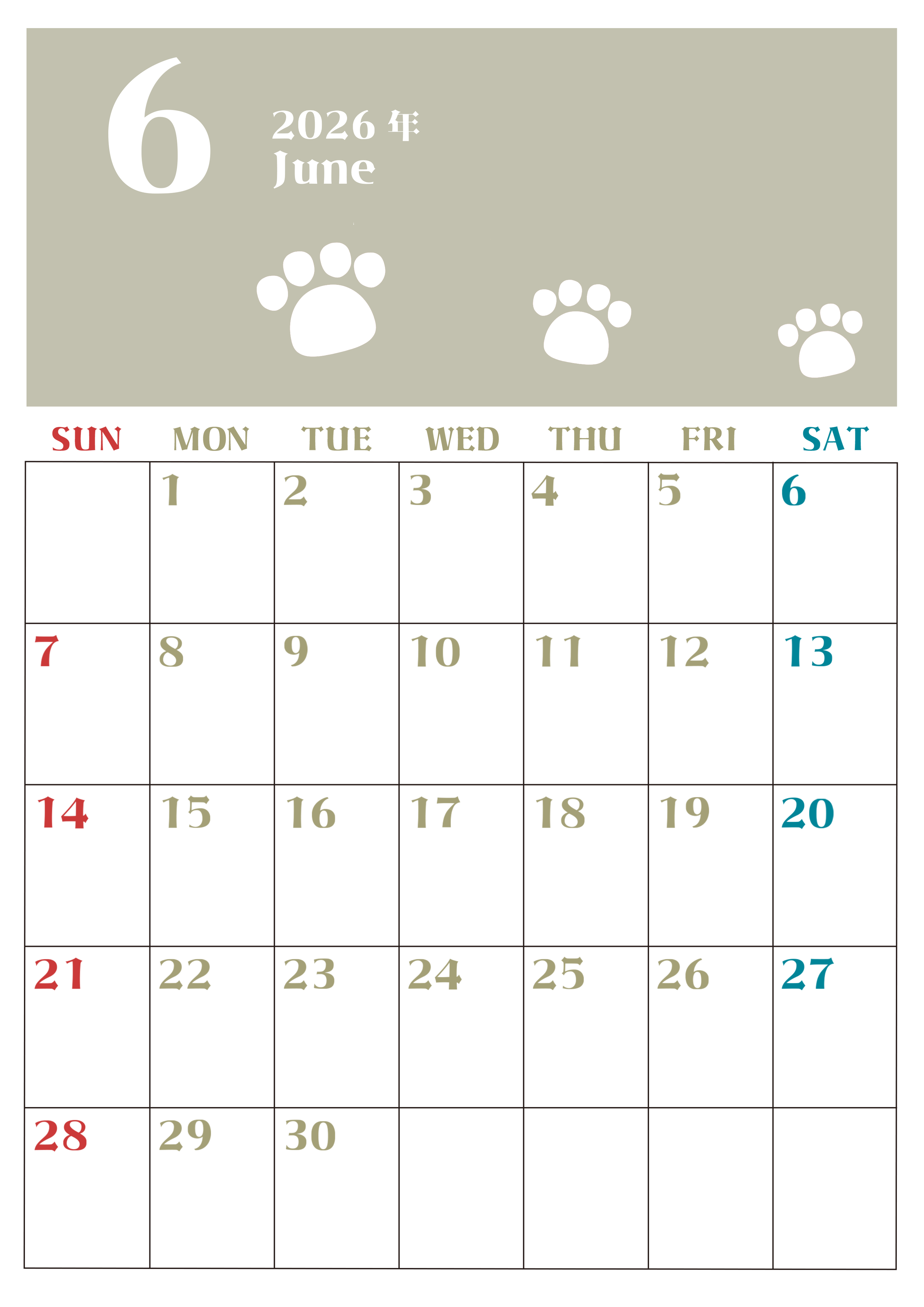 2026年・無料のカレンダーテンプレート 2026年6月カレンダーは縦型日曜始まりで猫の肉球がおしゃれかわいいカラフルな無料イラスト付き素材♪(2026-01270610) 素材状デザイン王 2025年4月9日 2026年6月カレンダーは縦型日曜始まりで猫の肉球がおしゃれかわいいカラフルな無料イラスト付き素材です。白いゆるかわいい猫の足あとが毎月カラフルな色のカレンダーに添えられているので楽しくスケジュール管理ができます。(2026-01270610) おしゃれ 6月 猫 縦型のカレンダー 日曜始まり カレンダーデザイン-0127
