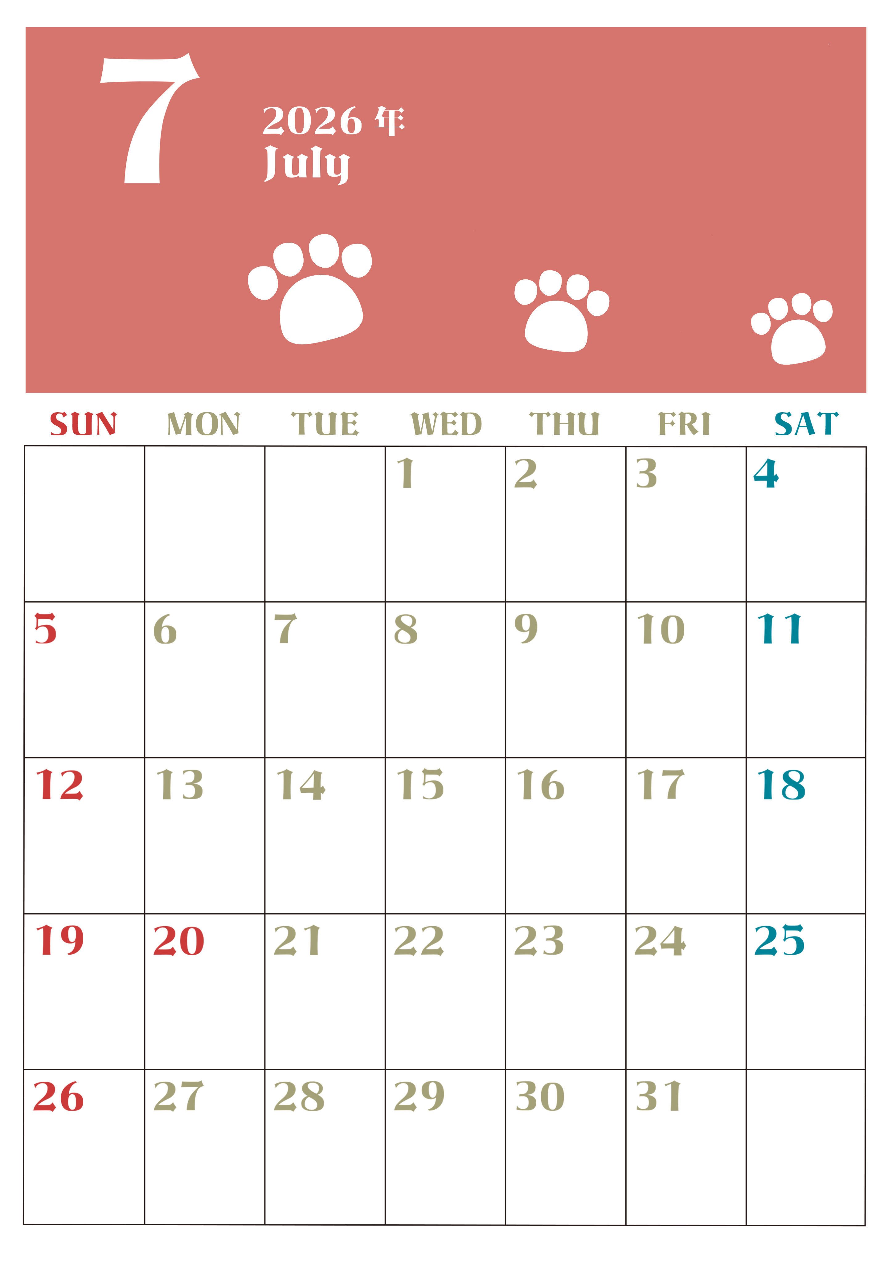 2026年7月カレンダーは縦型日曜始まり で猫の自由きままな足あとがおしゃれかわいいデザインなのでおすすめ:無料(2026-01270710)