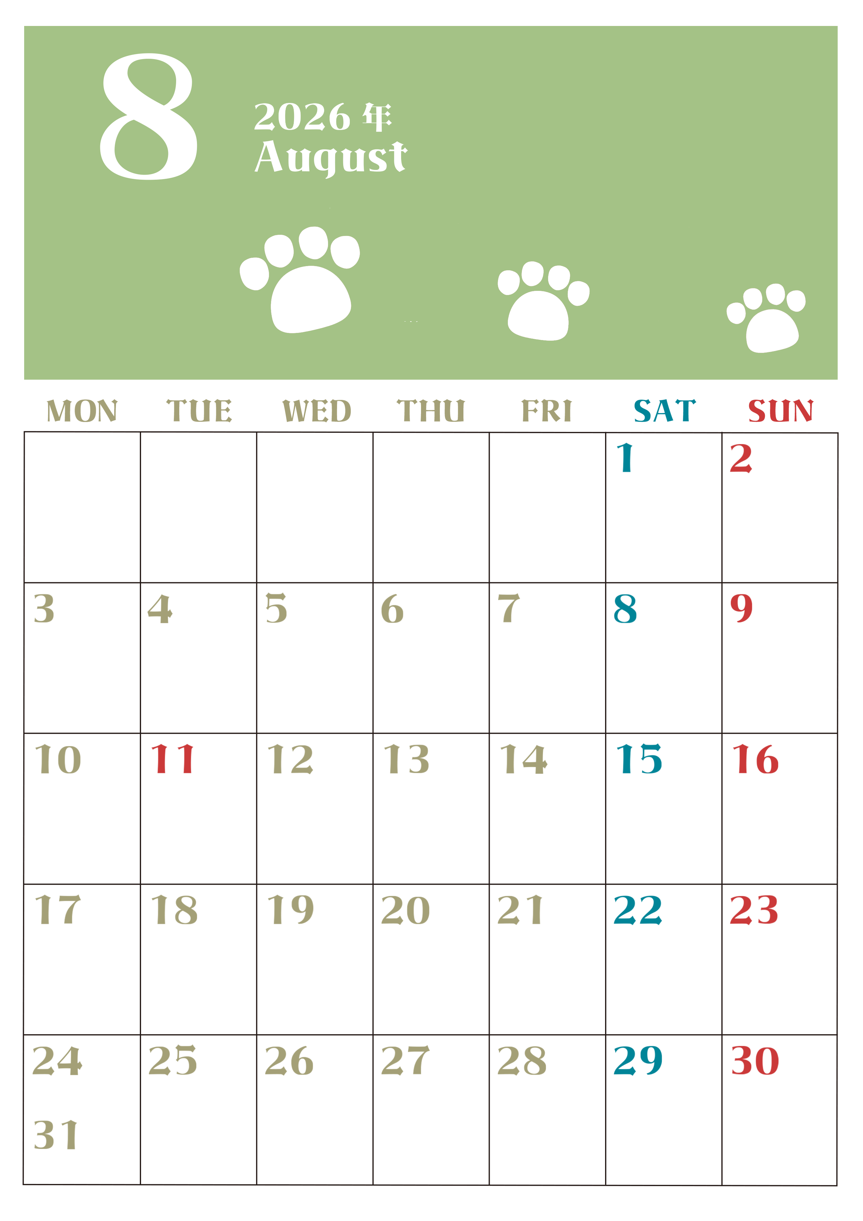 2026年8月カレンダーは縦型月曜始まりで猫の肉球がおしゃれかわいいカラフルな無料イラスト付き素材♪(2026-01270811)