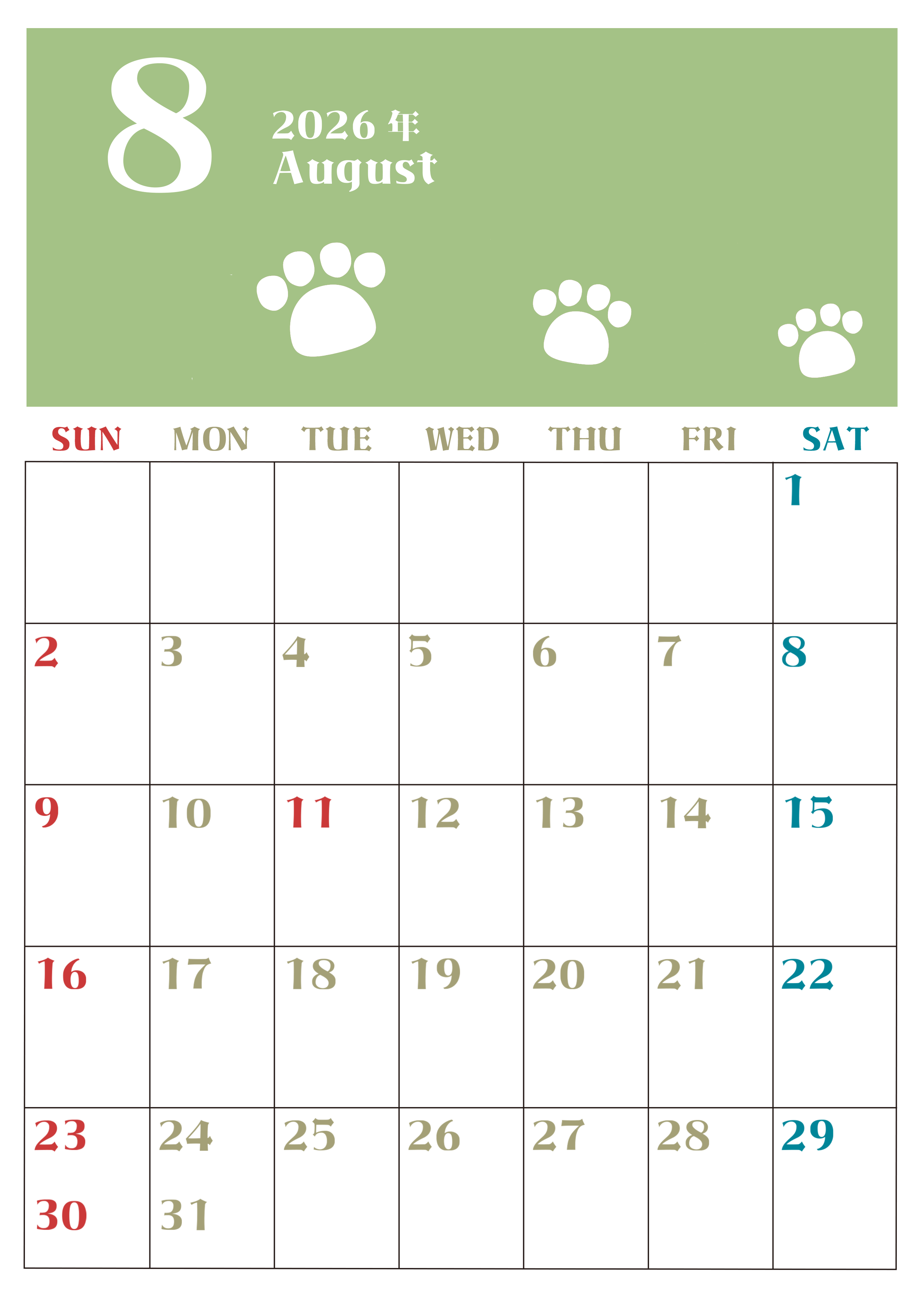 2026年・無料のカレンダーテンプレート 2026年8月カレンダーは縦型日曜始まりで猫の肉球がおしゃれかわいいカラフルな無料イラスト付き素材♪(2026-01270810) 素材状デザイン王 2025年4月9日 2026年8月カレンダーは縦型日曜始まりで猫の肉球がおしゃれかわいいカラフルな無料イラスト付き素材です。白いゆるかわいい猫の足あとが毎月カラフルな色のカレンダーに添えられているので楽しくスケジュール管理ができます。(2026-01270810) おしゃれ 8月 猫 縦型のカレンダー 日曜始まり カレンダーデザイン-0127