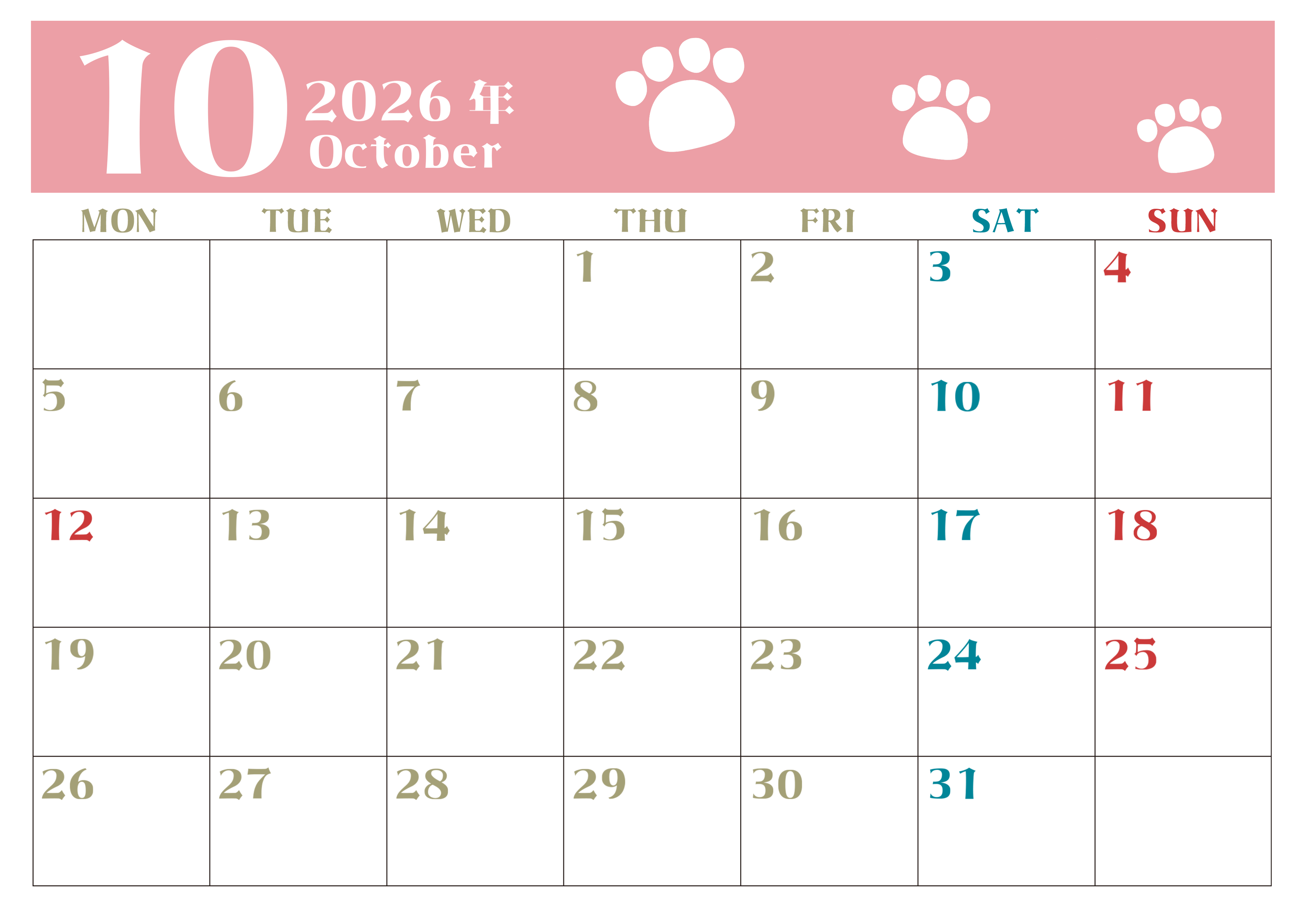 2026年・無料のカレンダーテンプレート 2026年10月カレンダーは横型月曜始まりで猫の肉球がおしゃれかわいいカラフルな無料イラスト付き素材♪(2026-01271001) 素材状デザイン王 2025年4月9日 2026年10月カレンダーは横型月曜始まりで猫の肉球がおしゃれかわいいカラフルな無料イラスト付き素材です。白いゆるかわいい猫の足あとが毎月カラフルな色のカレンダーに添えられているので楽しくスケジュール管理ができます。(2026-01271001) おしゃれ 10月 猫 横型のカレンダー 月曜始まり カレンダーデザイン-0127