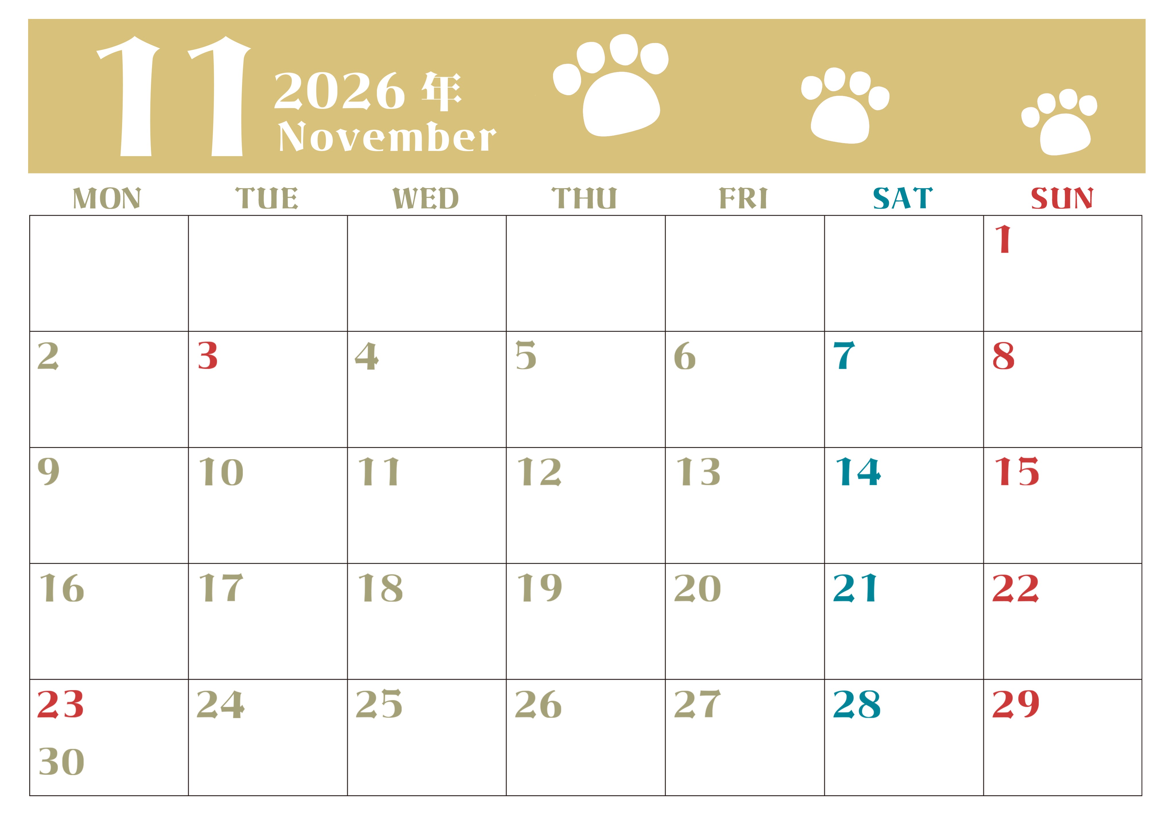 2026年・無料のカレンダーテンプレート 2026年11月カレンダーは横型月曜始まりで猫の肉球がおしゃれかわいいカラフルな無料イラスト付き素材♪(2026-01271101) 素材状デザイン王 2025年4月9日 2026年11月カレンダーは横型月曜始まりで猫の肉球がおしゃれかわいいカラフルな無料イラスト付き素材です。白いゆるかわいい猫の足あとが毎月カラフルな色のカレンダーに添えられているので楽しくスケジュール管理ができます。(2026-01271101) おしゃれ 11月 猫 横型のカレンダー 月曜始まり カレンダーデザイン-0127