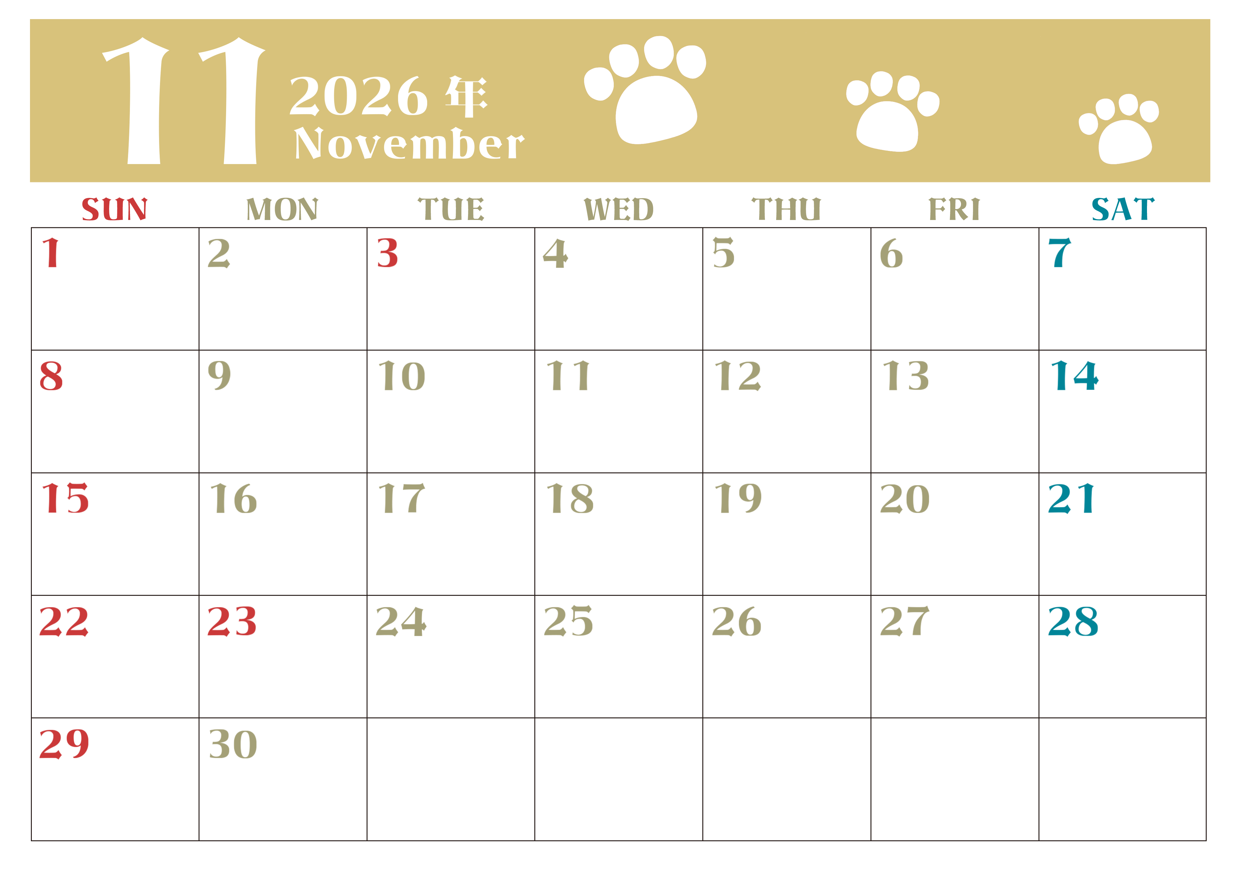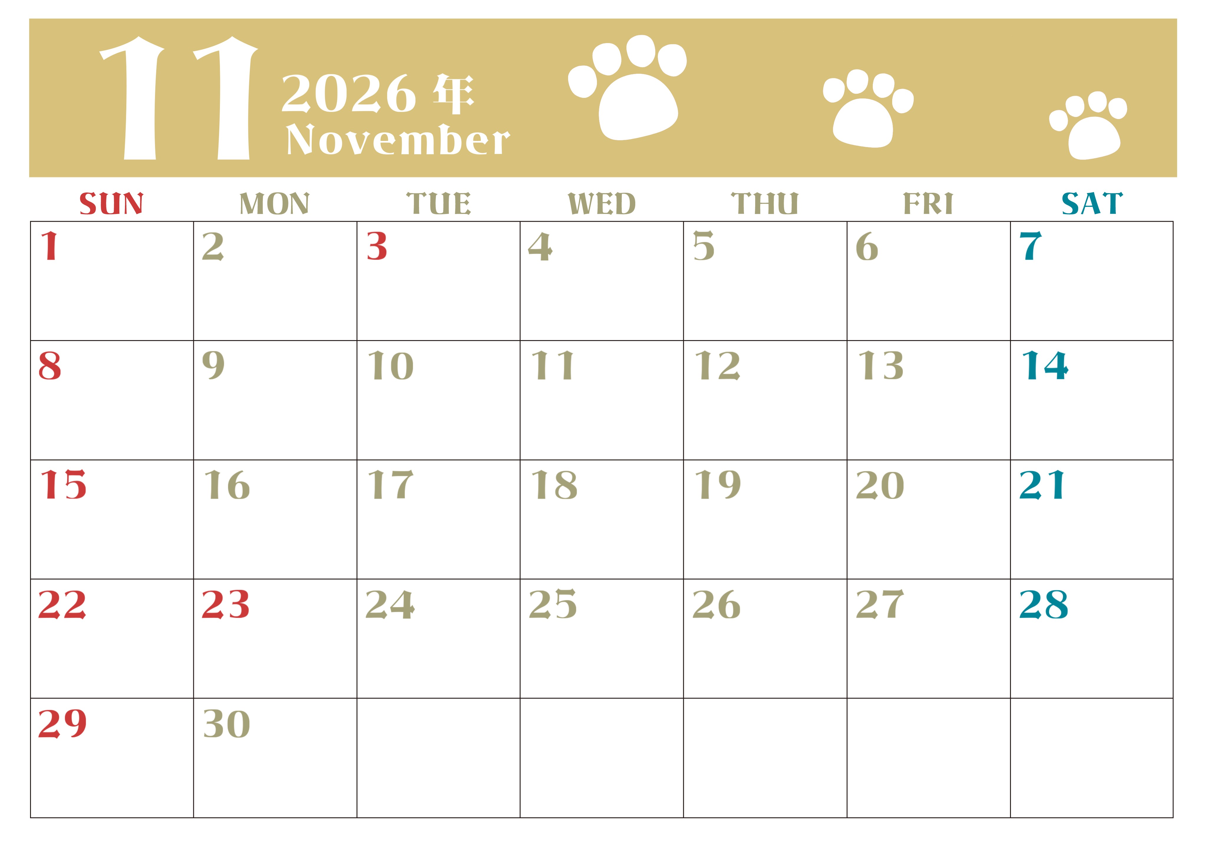 2026年・無料のカレンダーテンプレート 2026年11月カレンダーは横型日曜始まりで猫の肉球がおしゃれかわいいカラフルな無料イラスト付き素材♪(2026-01271100) 素材状デザイン王 2025年4月9日 2026年11月カレンダーは横型日曜始まりで猫の肉球がおしゃれかわいいカラフルな無料イラスト付き素材です。白いゆるかわいい猫の足あとが毎月カラフルな色のカレンダーに添えられているので楽しくスケジュール管理ができます。(2026-01271100) おしゃれ 11月 猫 横型のカレンダー 日曜始まり カレンダーデザイン-0127