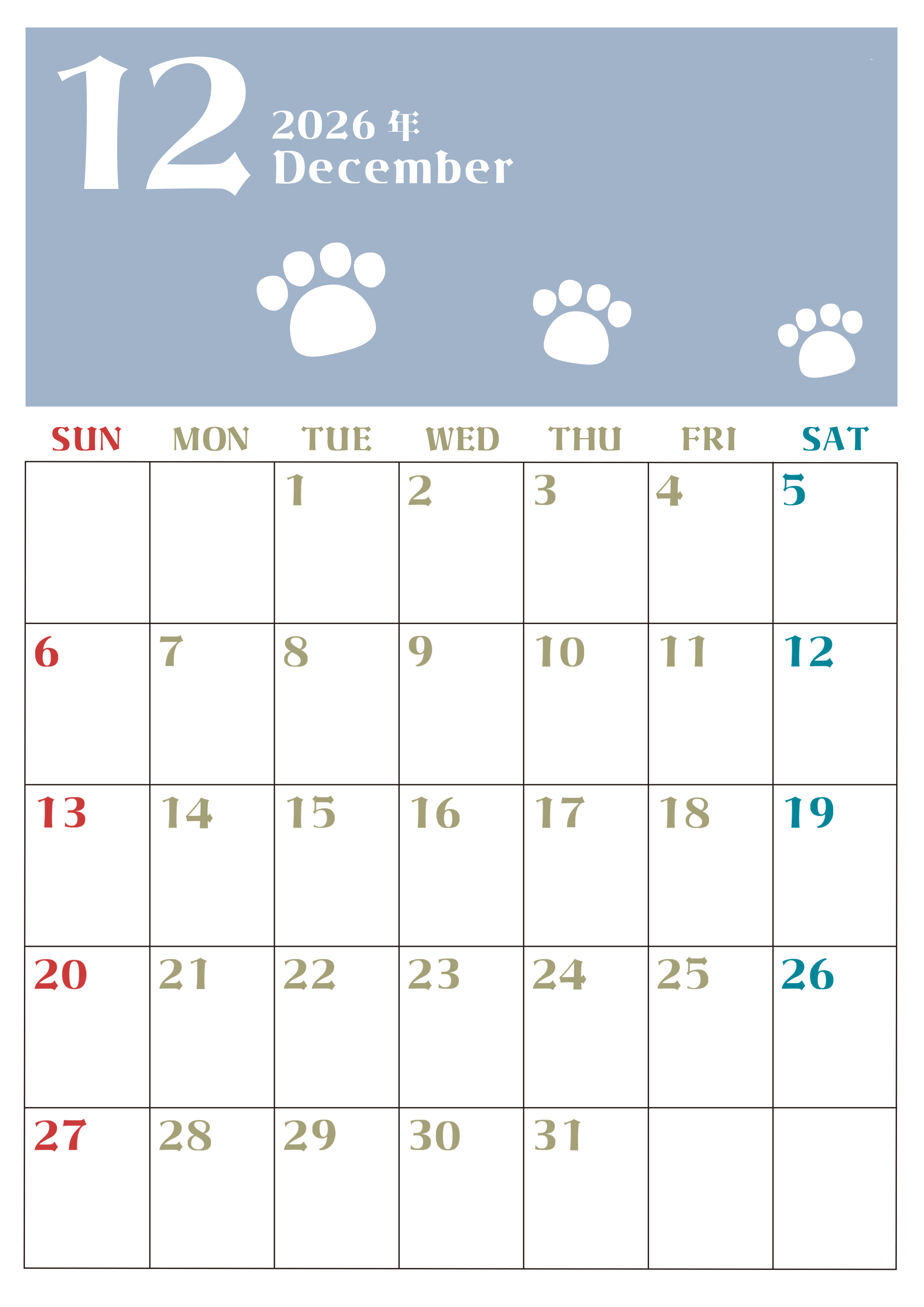 2026年12月カレンダーは縦型日曜始まりで猫の肉球がおしゃれかわいいカラフルな無料イラスト付き素材♪(2026-01271210)