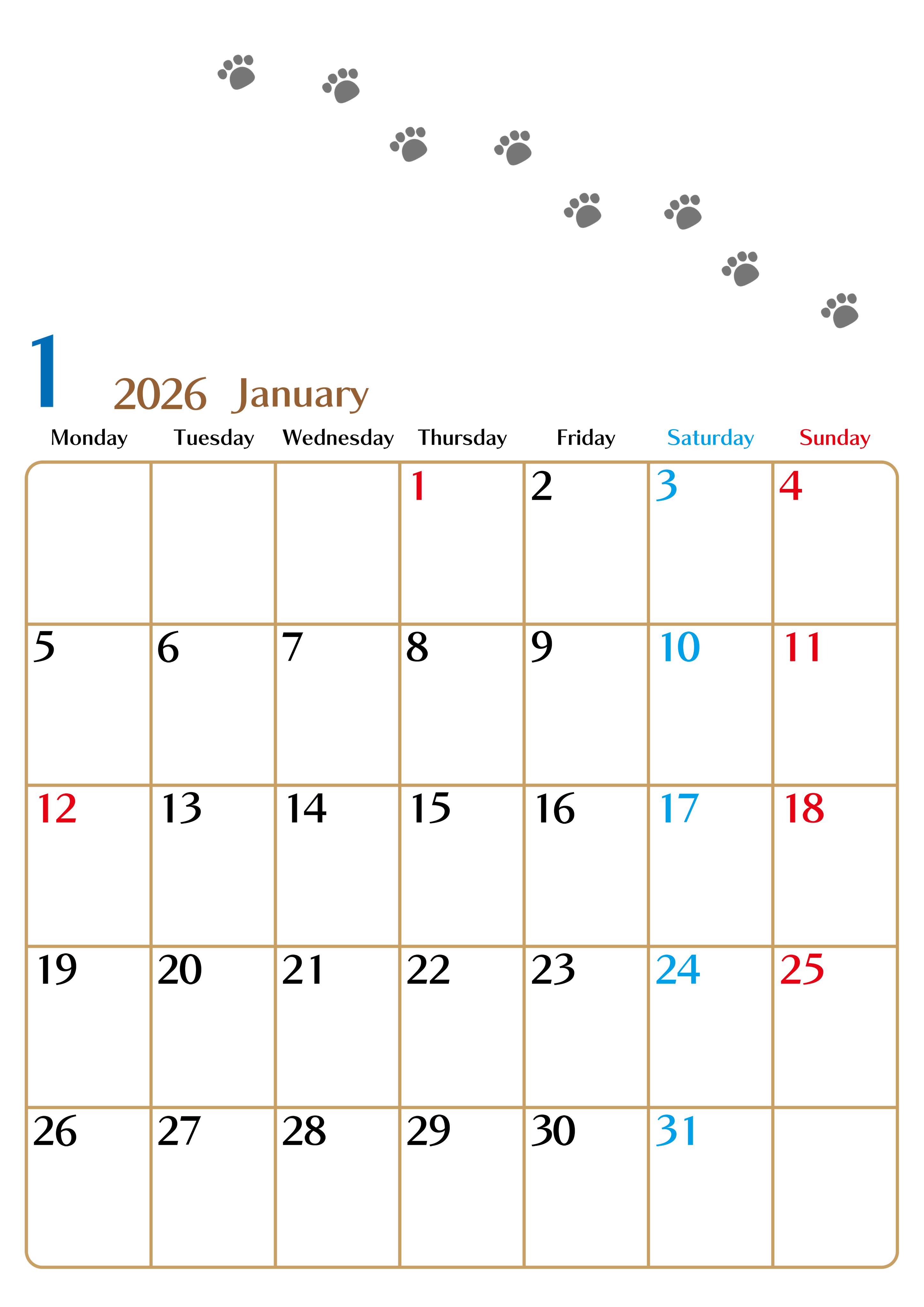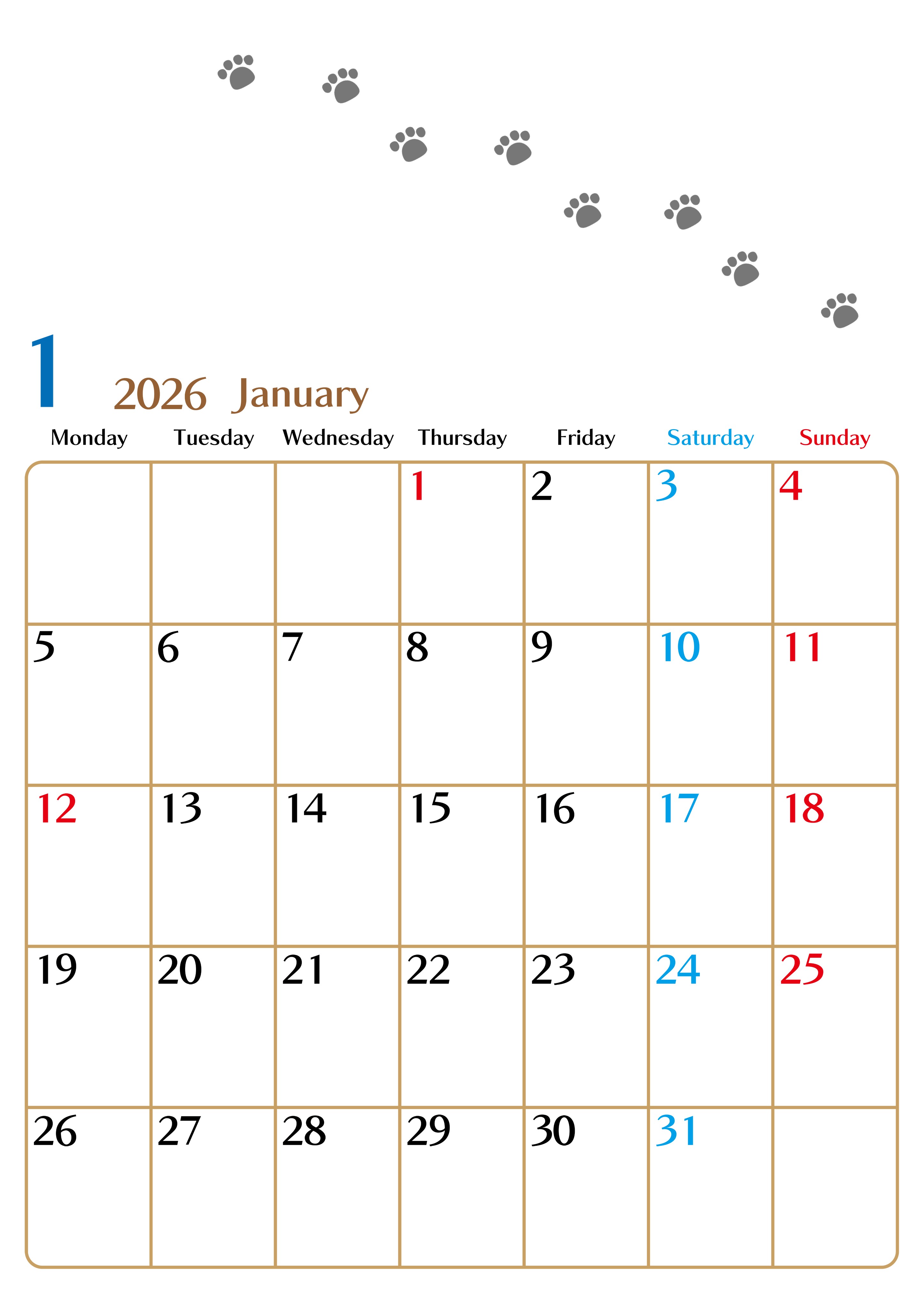 2026年・無料のカレンダーテンプレート 2026年1月カレンダーは縦型月曜始まりで猫の肉球にほっこり癒されるゆるおしゃれデザイン♪ダウンロードは無料♪(2026-01280111) 素材状デザイン王 2025年4月9日 2026年1月カレンダーは縦型月曜始まりで猫の肉球にほっこり癒されるゆるおしゃれデザインです。ダウンロードは無料なので自由にお好みでご利用ください。忙しい毎日をほっこりさせてくれるカレンダーです。(2026-01280111) おしゃれ 1月 猫 縦型のカレンダー 月曜始まり カレンダーデザイン-0128