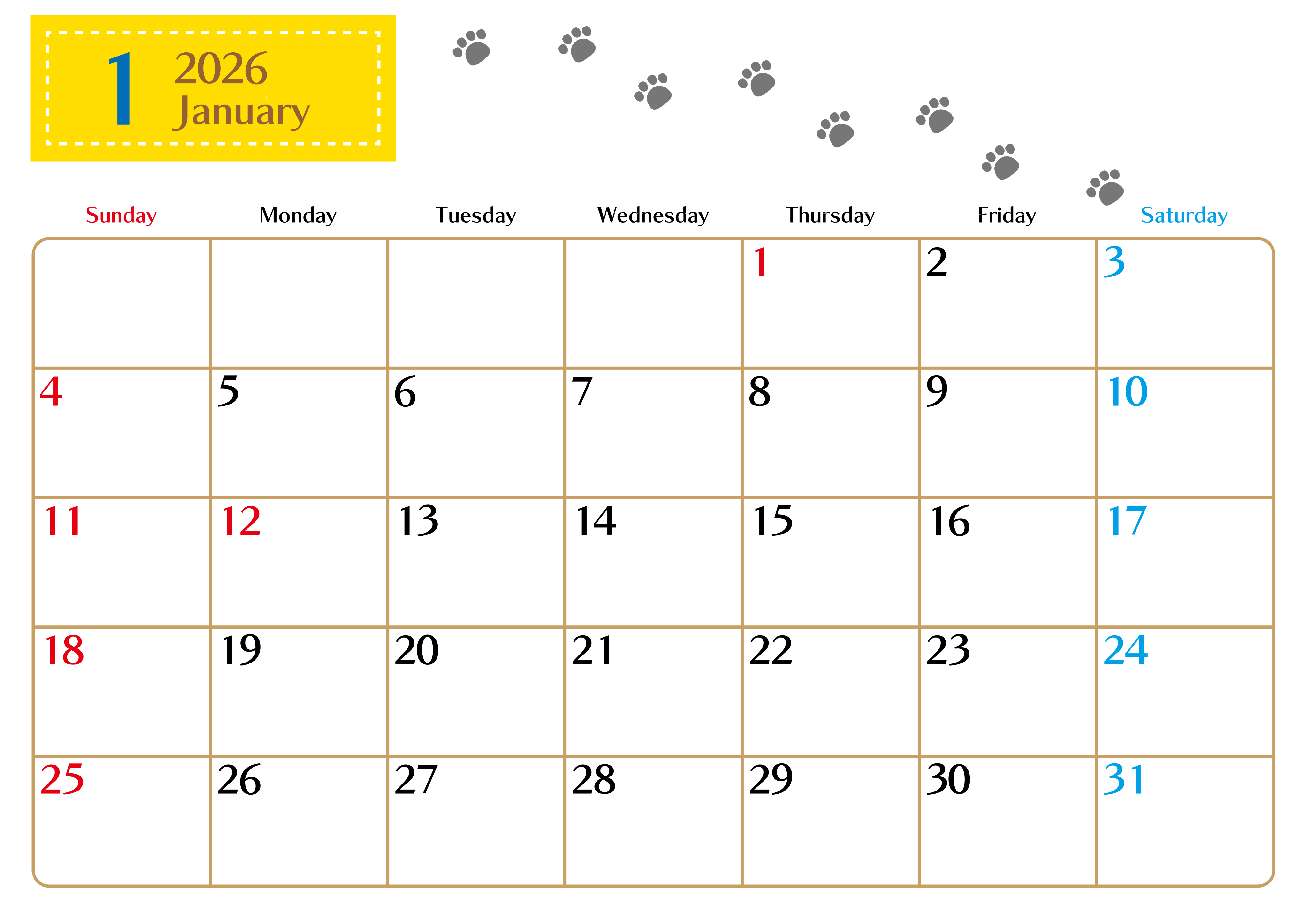 2026年・無料のカレンダーテンプレート 2026年1月カレンダーは横型日曜始まりで猫の肉球にほっこり癒されるゆるおしゃれデザイン♪ダウンロードは無料♪(2026-01280100) 素材状デザイン王 2025年4月9日 2026年1月カレンダーは横型日曜始まりで猫の肉球にほっこり癒されるゆるおしゃれデザインです。ダウンロードは無料なので自由にお好みでご利用ください。忙しい毎日をほっこりさせてくれるカレンダーです。(2026-01280100) おしゃれ 1月 猫 横型のカレンダー 日曜始まり カレンダーデザイン-0128