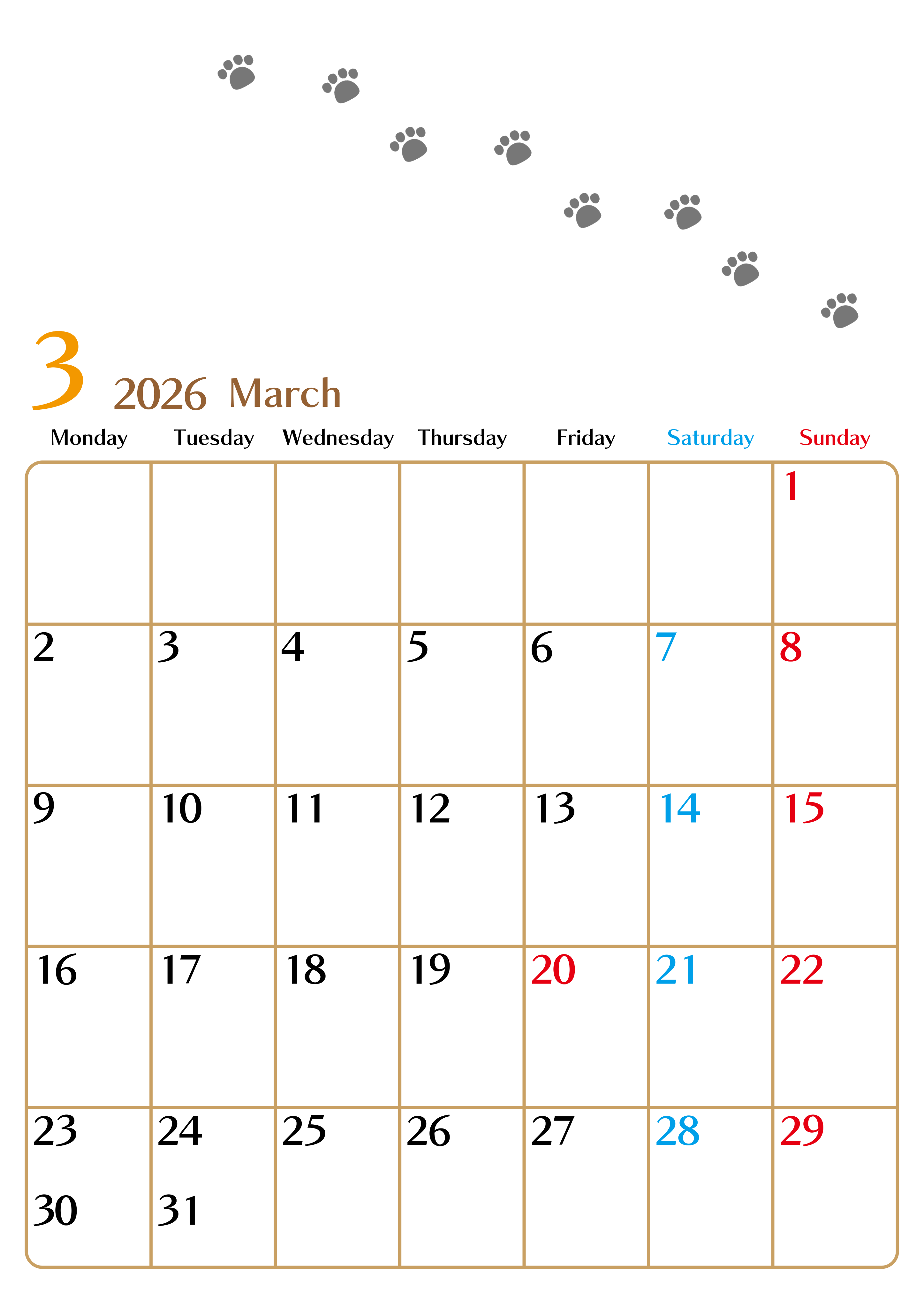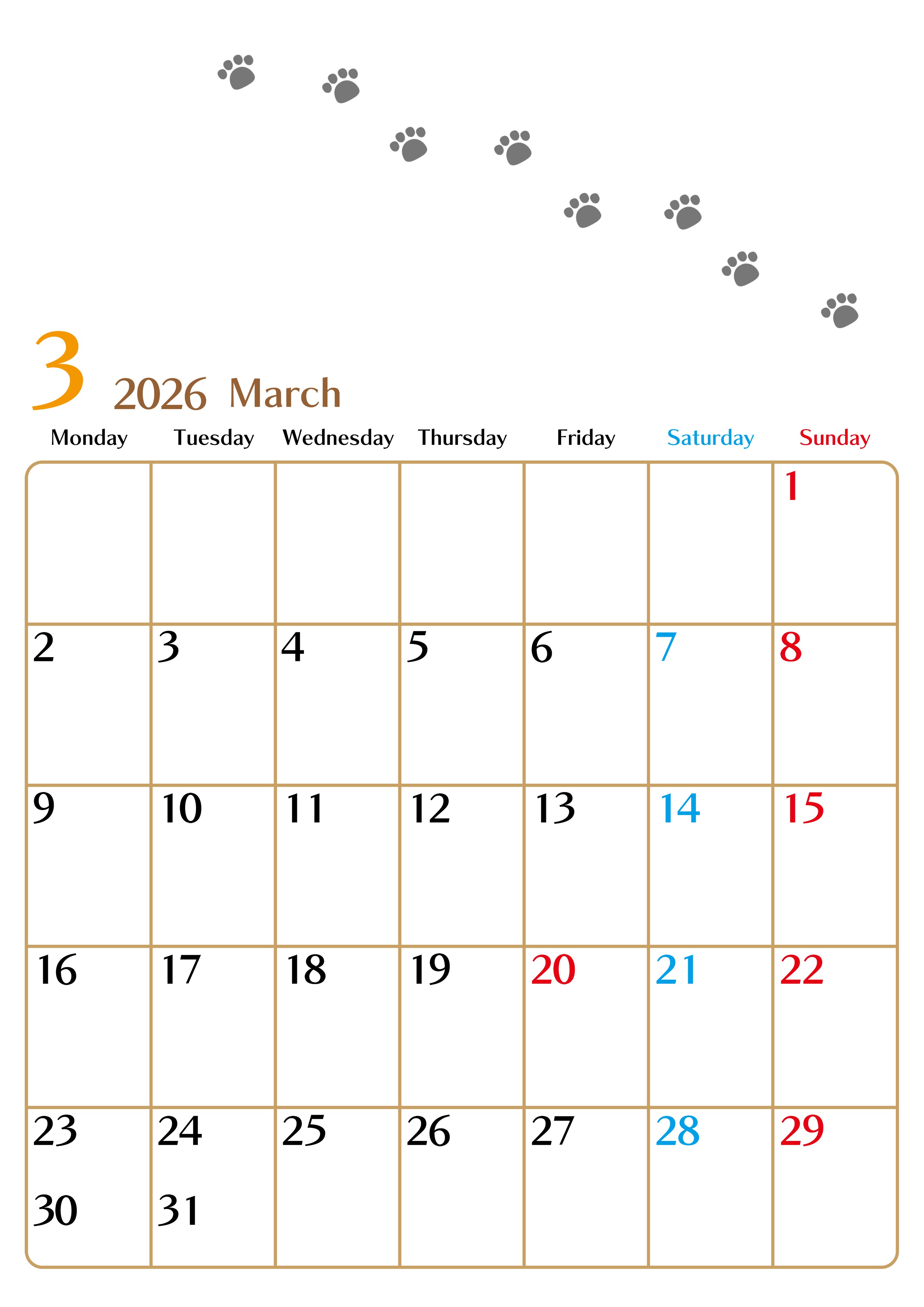2026年・無料のカレンダーテンプレート 2026年3月カレンダーは縦型月曜始まりで猫の肉球にほっこり癒されるゆるおしゃれデザイン♪ダウンロードは無料♪(2026-01280311) 素材状デザイン王 2025年4月9日 2026年3月カレンダーは縦型月曜始まりで猫の肉球にほっこり癒されるゆるおしゃれデザインです。ダウンロードは無料なので自由にお好みでご利用ください。忙しい毎日をほっこりさせてくれるカレンダーです。(2026-01280311) おしゃれ 3月 猫 縦型のカレンダー 月曜始まり カレンダーデザイン-0128