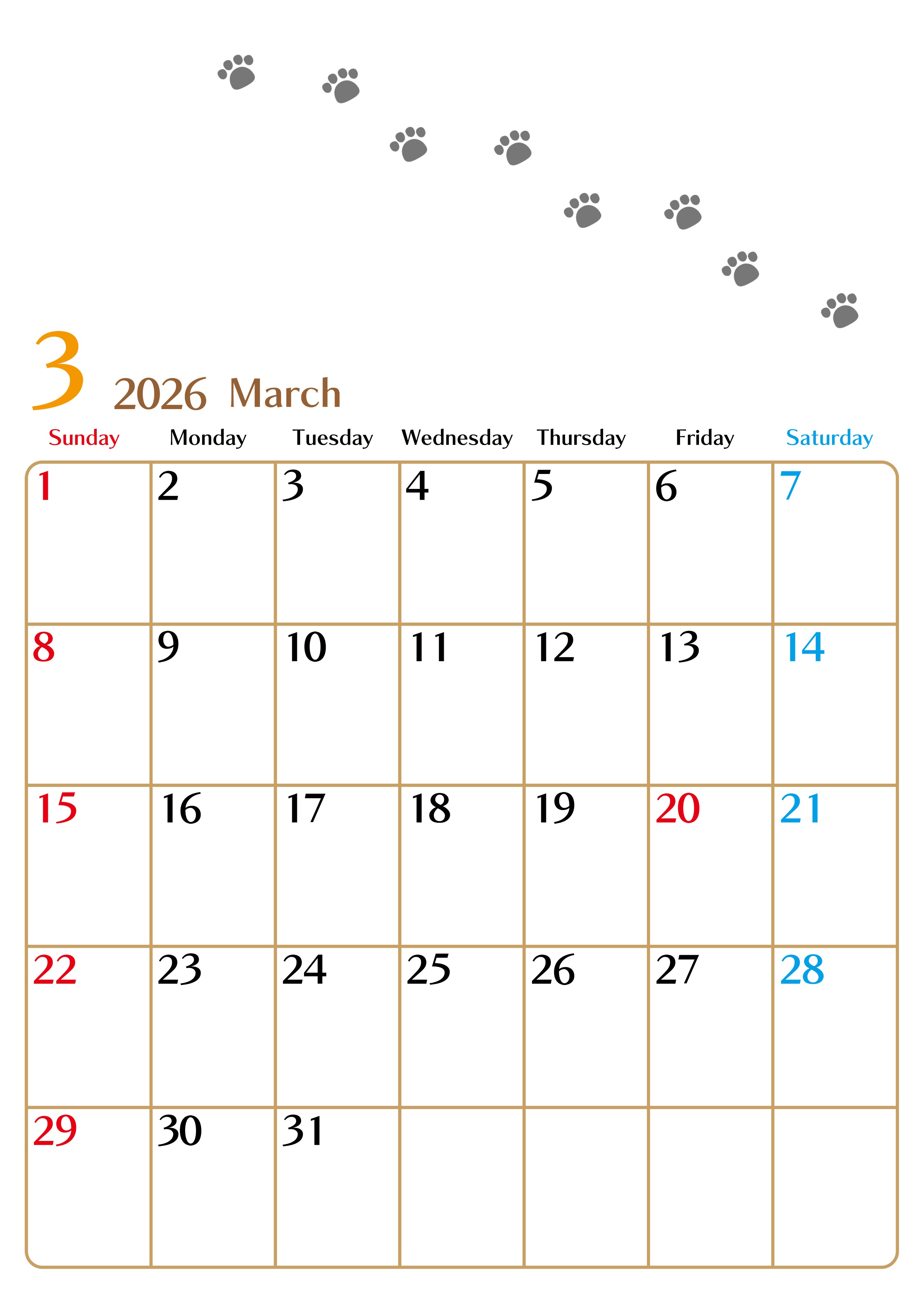 2026年・無料のカレンダーテンプレート 2026年3月カレンダーは縦型日曜始まりで猫の肉球にほっこり癒されるゆるおしゃれデザイン♪ダウンロードは無料♪(2026-01280310) 素材状デザイン王 2025年4月9日 2026年3月カレンダーは縦型日曜始まりで猫の肉球にほっこり癒されるゆるおしゃれデザインです。ダウンロードは無料なので自由にお好みでご利用ください。忙しい毎日をほっこりさせてくれるカレンダーです。(2026-01280310) おしゃれ 3月 猫 縦型のカレンダー 日曜始まり カレンダーデザイン-0128