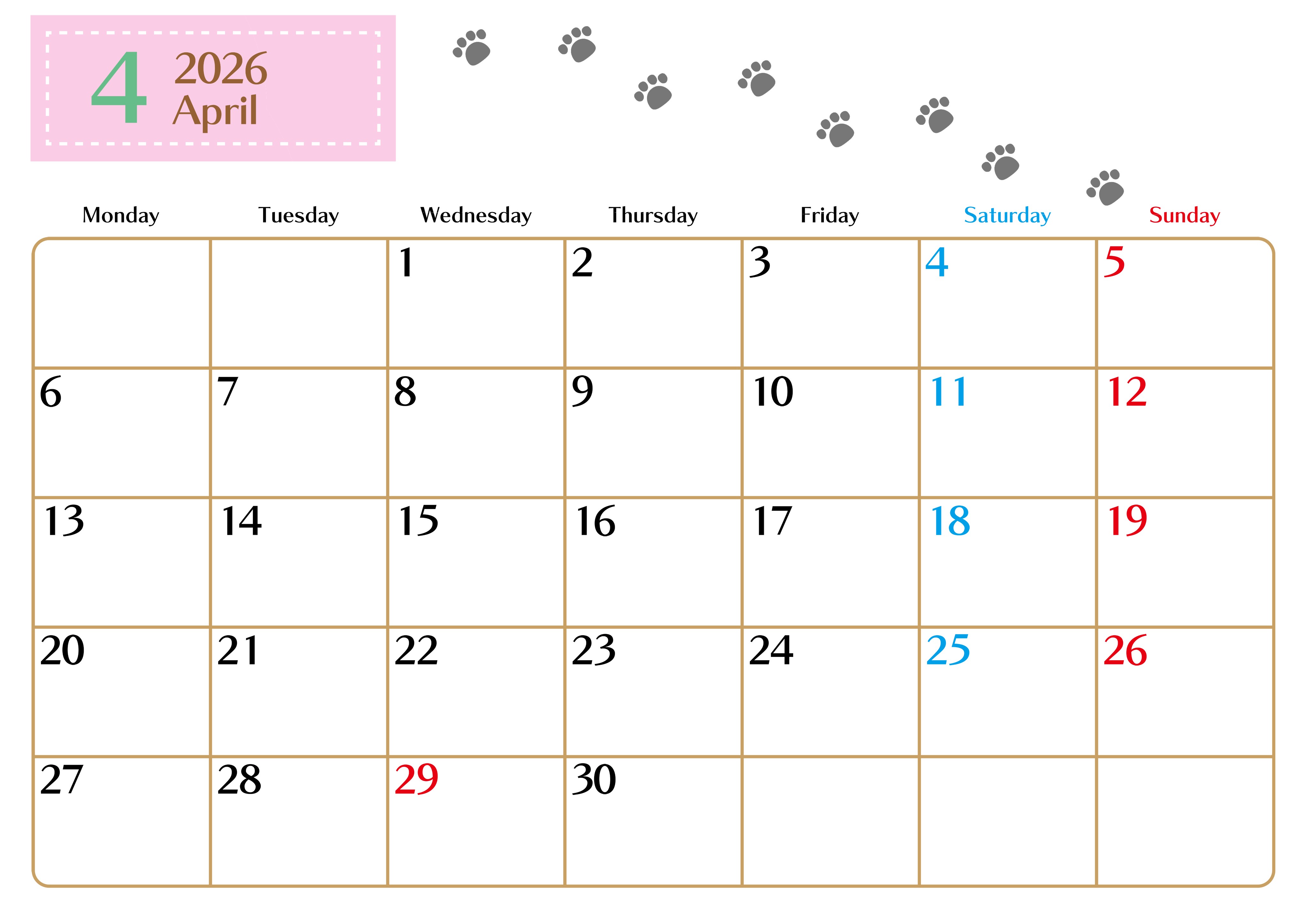 2026年4月カレンダーは横型月曜始まりで猫の肉球にほっこり癒されるゆるおしゃれデザインです。ダウンロードは無料なので自由にお好みでご利用ください。忙しい毎日をほっこりさせてくれるカレンダーです。(2026-01280401)