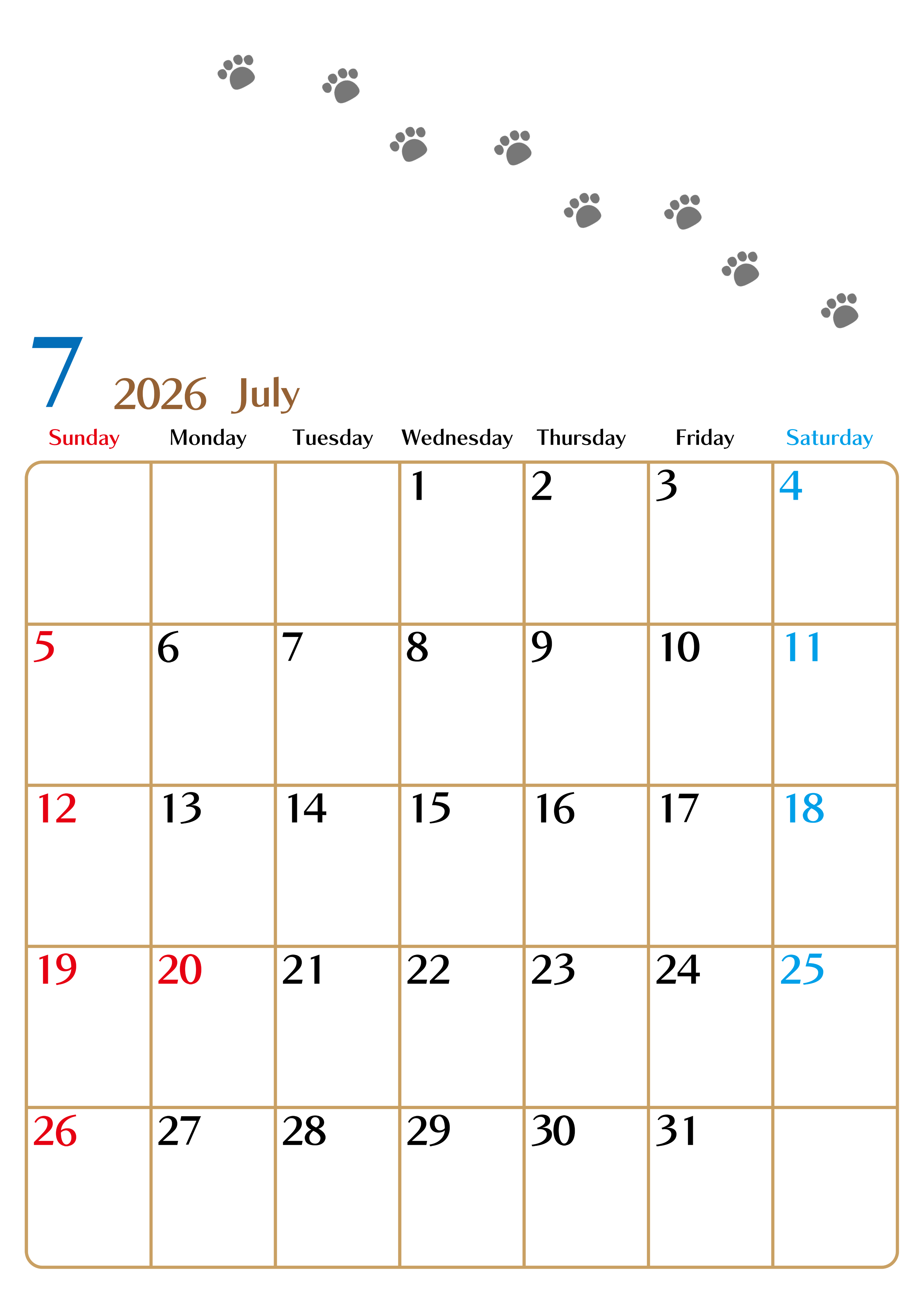 2026年7月カレンダーは縦型日曜始まりで猫の肉球にほっこり癒されるゆるおしゃれデザインです。ダウンロードは無料なので自由にお好みでご利用ください。忙しい毎日をほっこりさせてくれるカレンダーです。(2026-01280710)