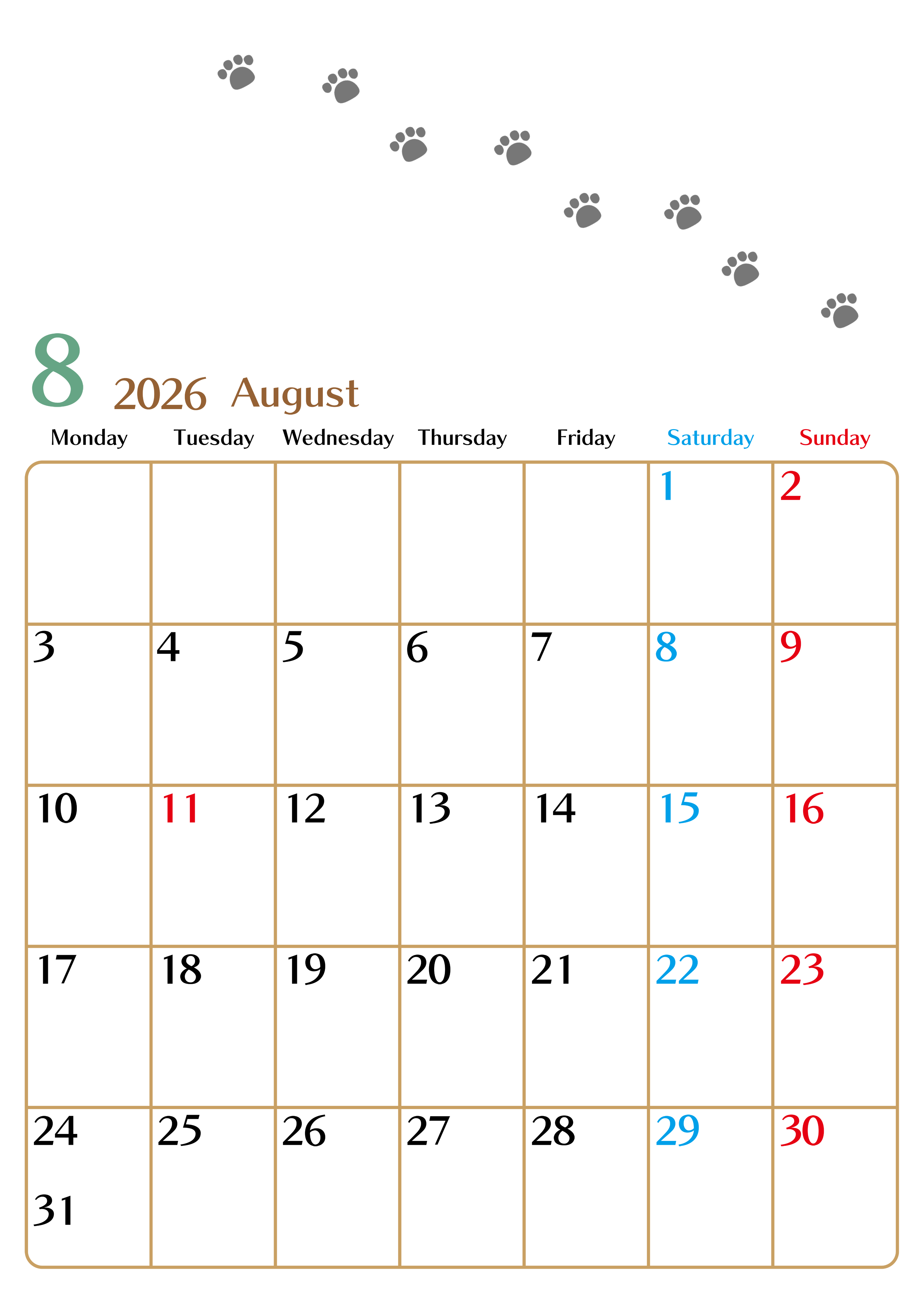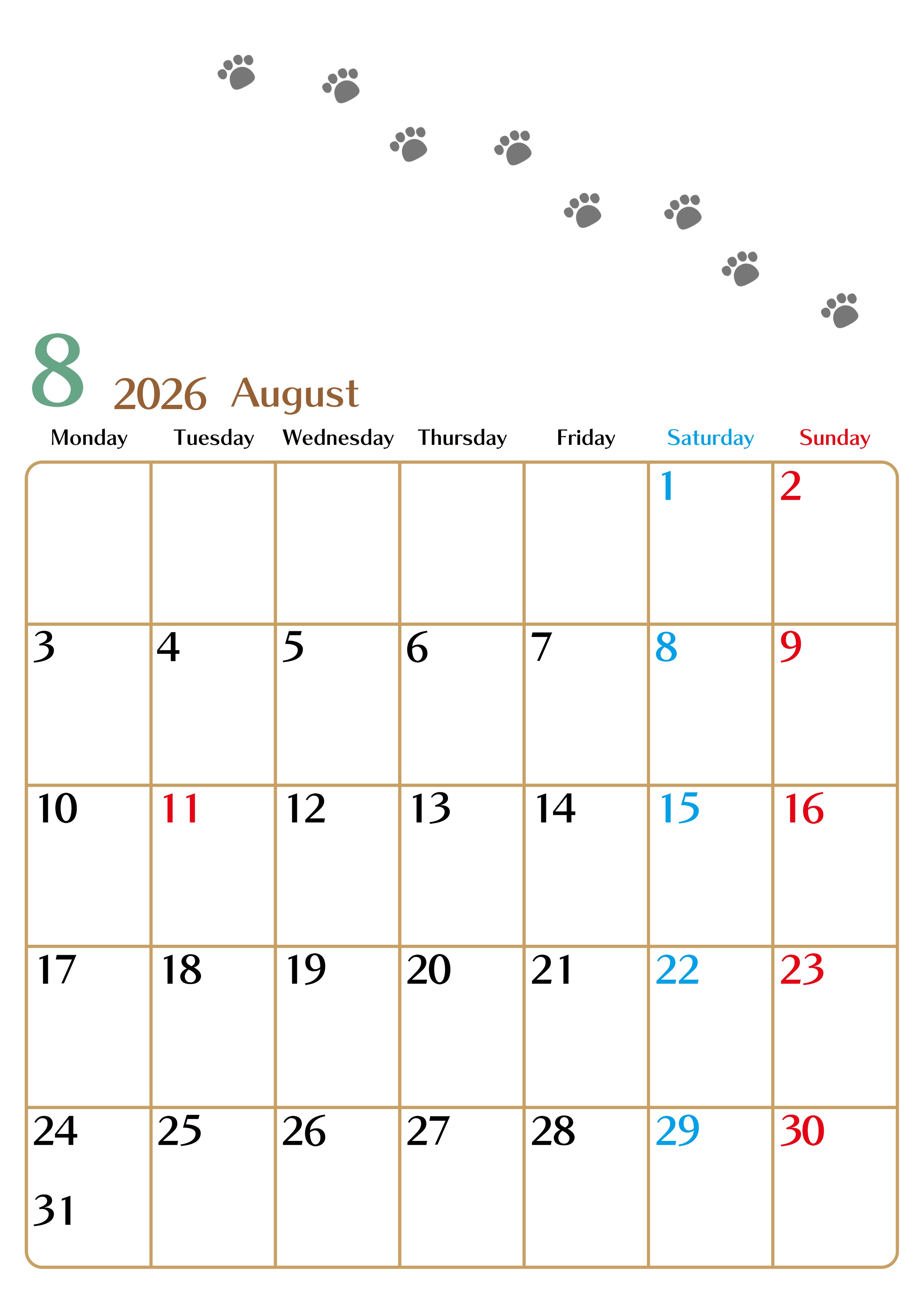 2026年・無料のカレンダーテンプレート 2026年8月カレンダーは縦型月曜始まりで猫の肉球にほっこり癒されるゆるおしゃれデザイン♪ダウンロードは無料♪(2026-01280811) 素材状デザイン王 2025年4月9日 2026年8月カレンダーは縦型月曜始まりで猫の肉球にほっこり癒されるゆるおしゃれデザインです。ダウンロードは無料なので自由にお好みでご利用ください。忙しい毎日をほっこりさせてくれるカレンダーです。(2026-01280811) おしゃれ 8月 猫 縦型のカレンダー 月曜始まり カレンダーデザイン-0128