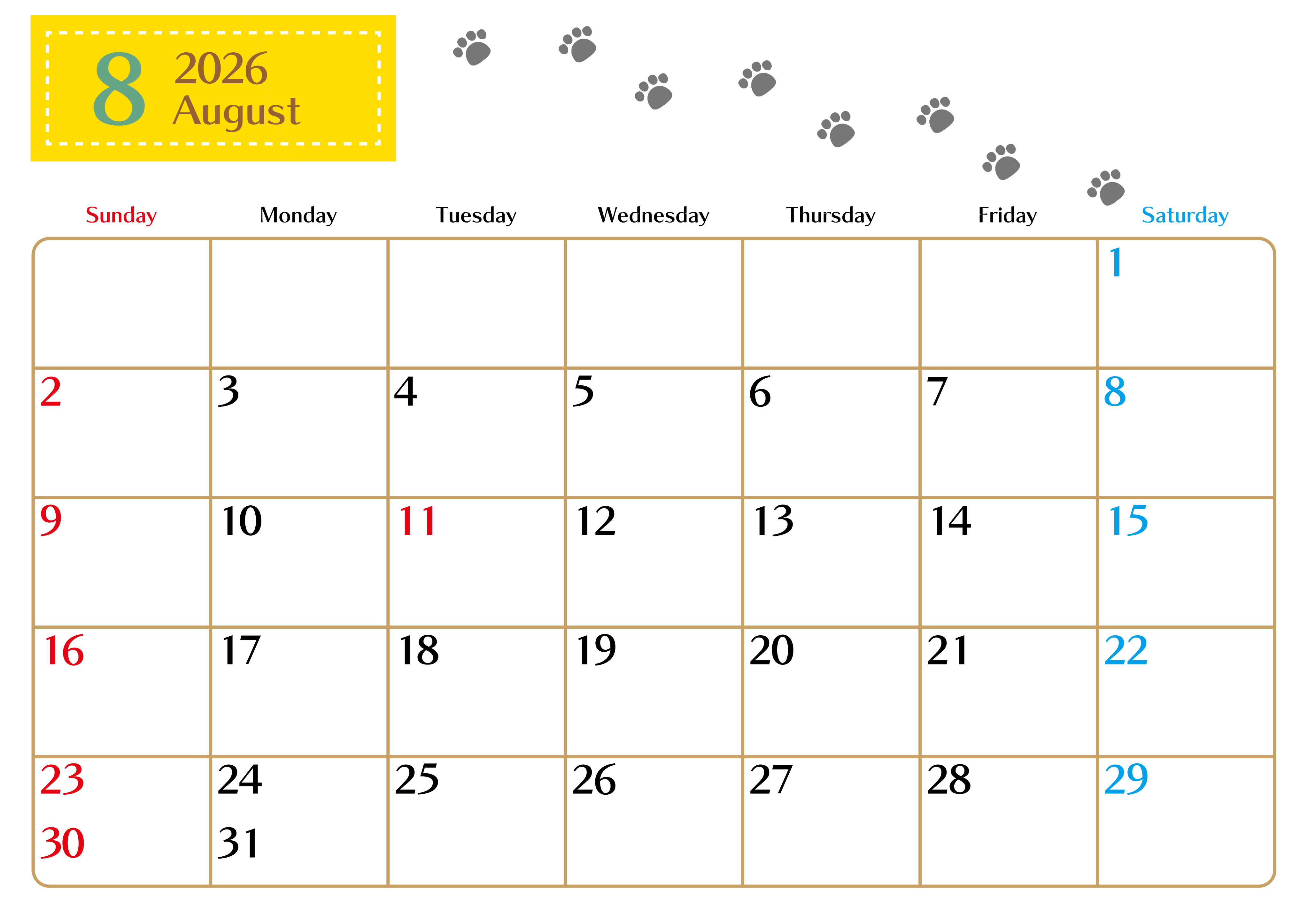 2026年・無料のカレンダーテンプレート 2026年8月カレンダーは横型日曜始まりで猫の肉球にほっこり癒されるゆるおしゃれデザイン♪ダウンロードは無料♪(2026-01280800) 素材状デザイン王 2025年4月9日 2026年8月カレンダーは横型日曜始まりで猫の肉球にほっこり癒されるゆるおしゃれデザインです。ダウンロードは無料なので自由にお好みでご利用ください。忙しい毎日をほっこりさせてくれるカレンダーです。(2026-01280800) おしゃれ 8月 猫 横型のカレンダー 日曜始まり カレンダーデザイン-0128