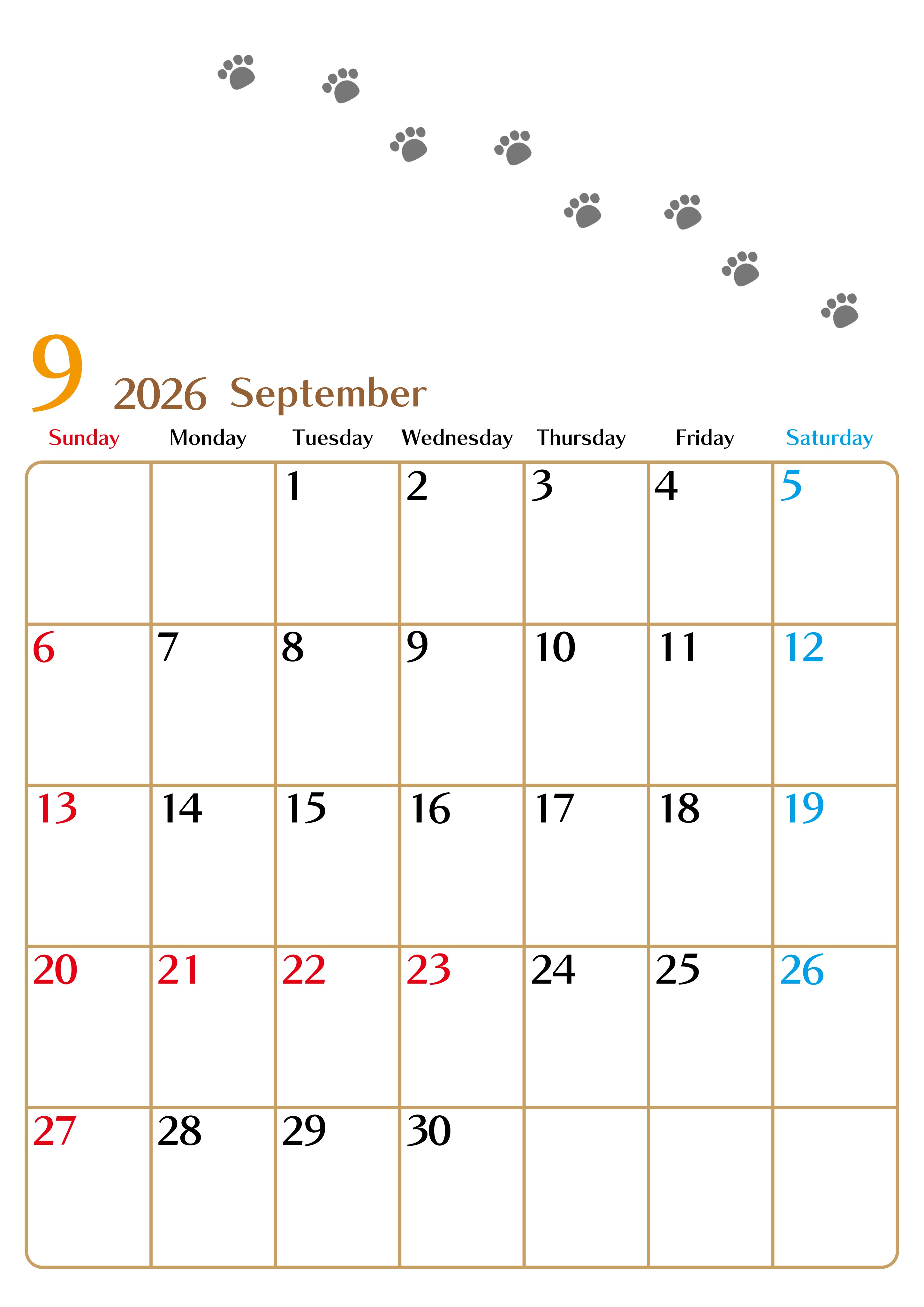 2026年・無料のカレンダーテンプレート 2026年9月カレンダーは縦型日曜始まりで猫の肉球にほっこり癒されるゆるおしゃれデザイン♪ダウンロードは無料♪(2026-01280910) 素材状デザイン王 2025年4月9日 2026年9月カレンダーは縦型日曜始まりで猫の肉球にほっこり癒されるゆるおしゃれデザインです。ダウンロードは無料なので自由にお好みでご利用ください。忙しい毎日をほっこりさせてくれるカレンダーです。(2026-01280910) おしゃれ 9月 猫 縦型のカレンダー 日曜始まり カレンダーデザイン-0128
