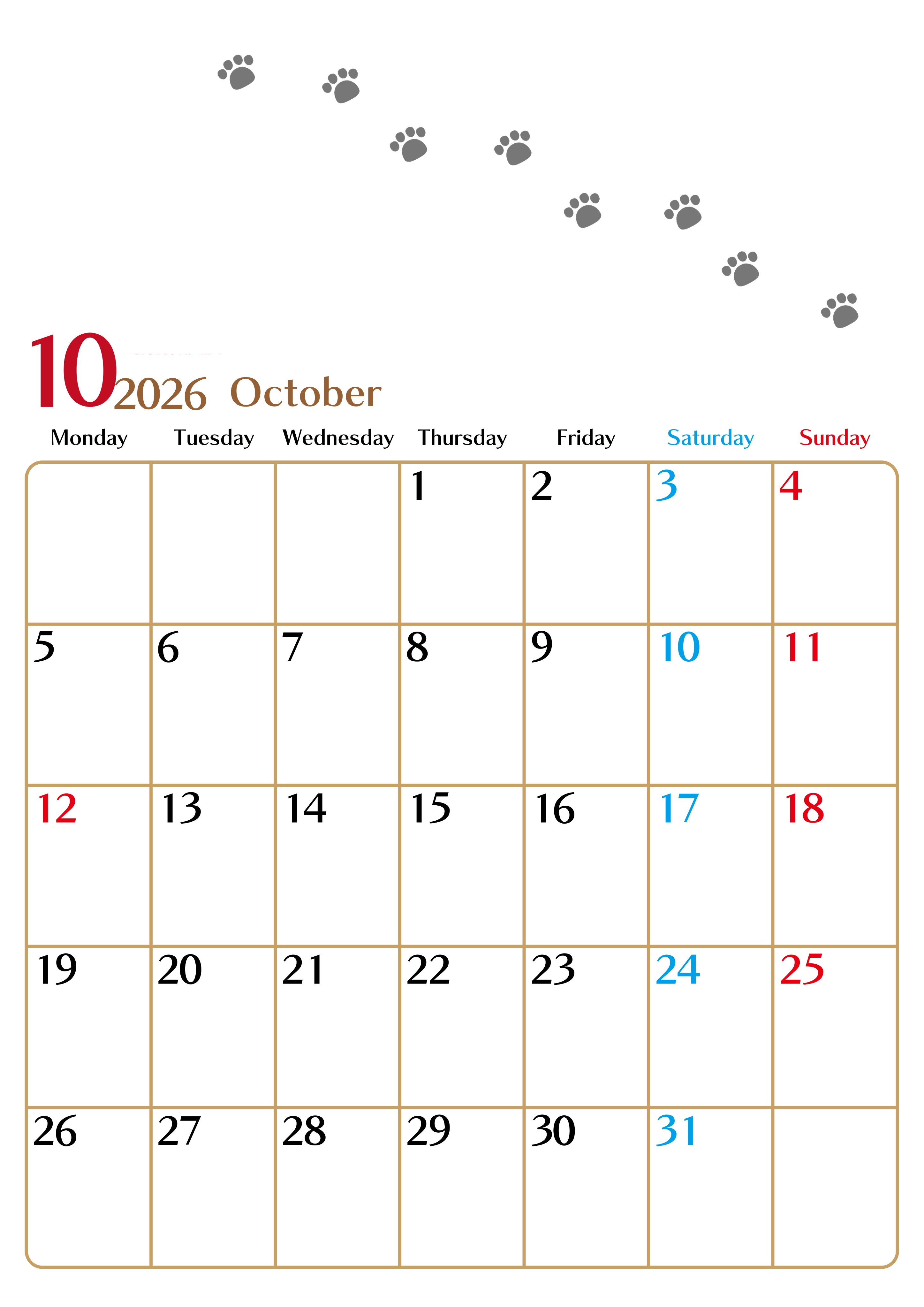 2026年・無料のカレンダーテンプレート 2026年10月カレンダーは縦型月曜始まりで猫の肉球にほっこり癒されるゆるおしゃれデザイン♪ダウンロードは無料♪(2026-01281011) 素材状デザイン王 2025年4月9日 2026年10月カレンダーは縦型月曜始まりで猫の肉球にほっこり癒されるゆるおしゃれデザインです。ダウンロードは無料なので自由にお好みでご利用ください。忙しい毎日をほっこりさせてくれるカレンダーです。(2026-01281011) おしゃれ 10月 猫 縦型のカレンダー 月曜始まり カレンダーデザイン-0128