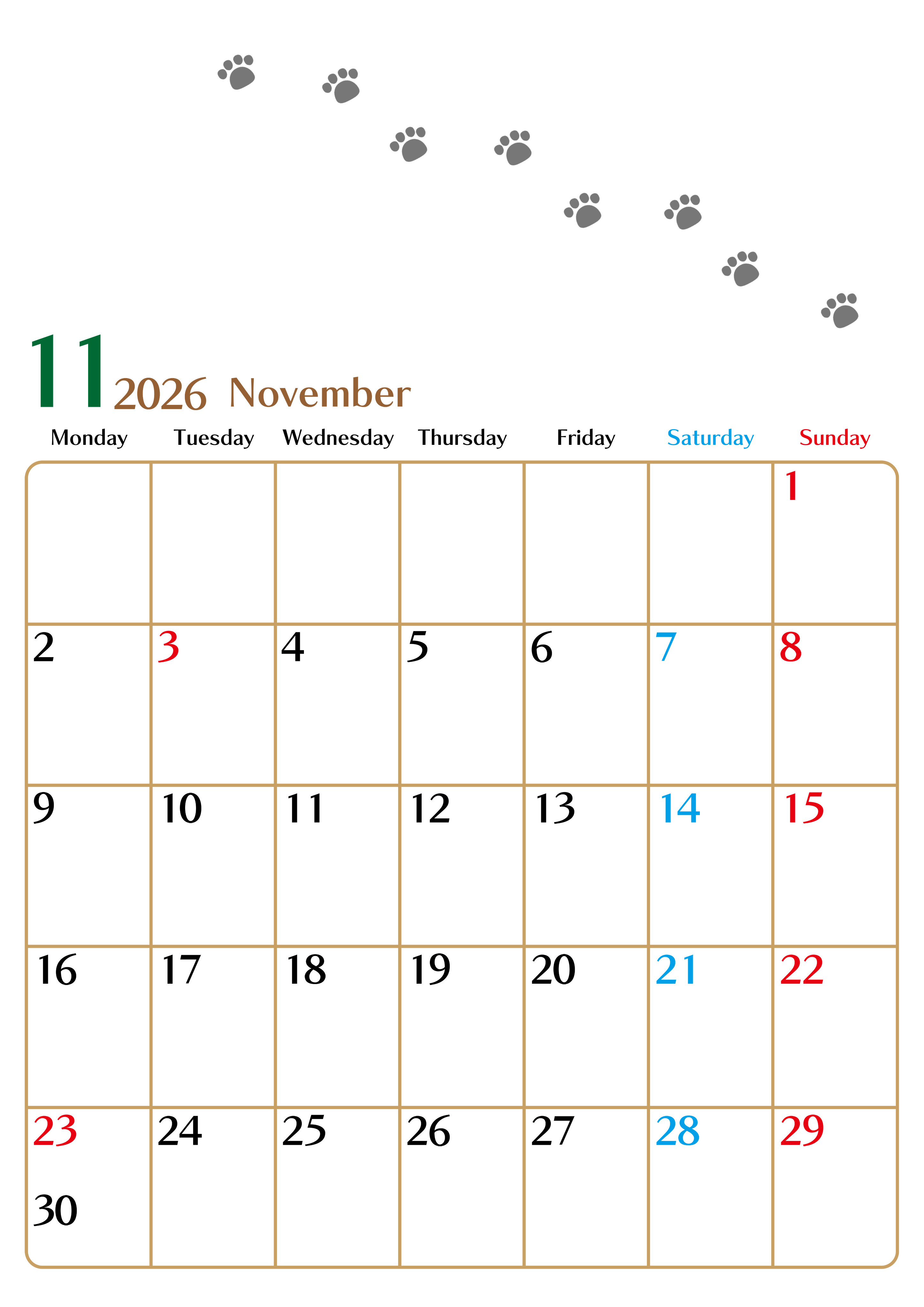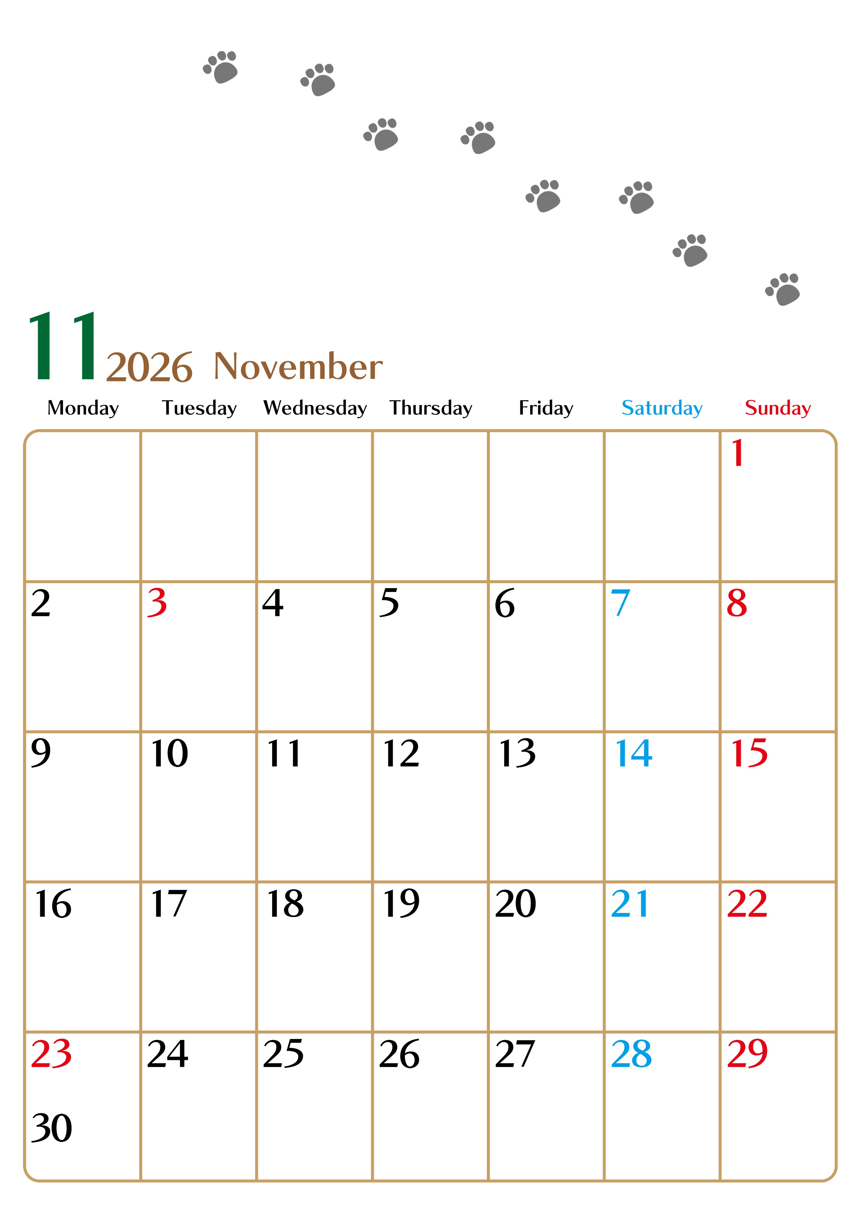 2026年・無料のカレンダーテンプレート 2026年11月カレンダーは縦型月曜始まりで猫の肉球にほっこり癒されるゆるおしゃれデザイン♪ダウンロードは無料♪(2026-01281111) 素材状デザイン王 2025年4月9日 2026年11月カレンダーは縦型月曜始まりで猫の肉球にほっこり癒されるゆるおしゃれデザインです。ダウンロードは無料なので自由にお好みでご利用ください。忙しい毎日をほっこりさせてくれるカレンダーです。(2026-01281111) おしゃれ 11月 猫 縦型のカレンダー 月曜始まり カレンダーデザイン-0128