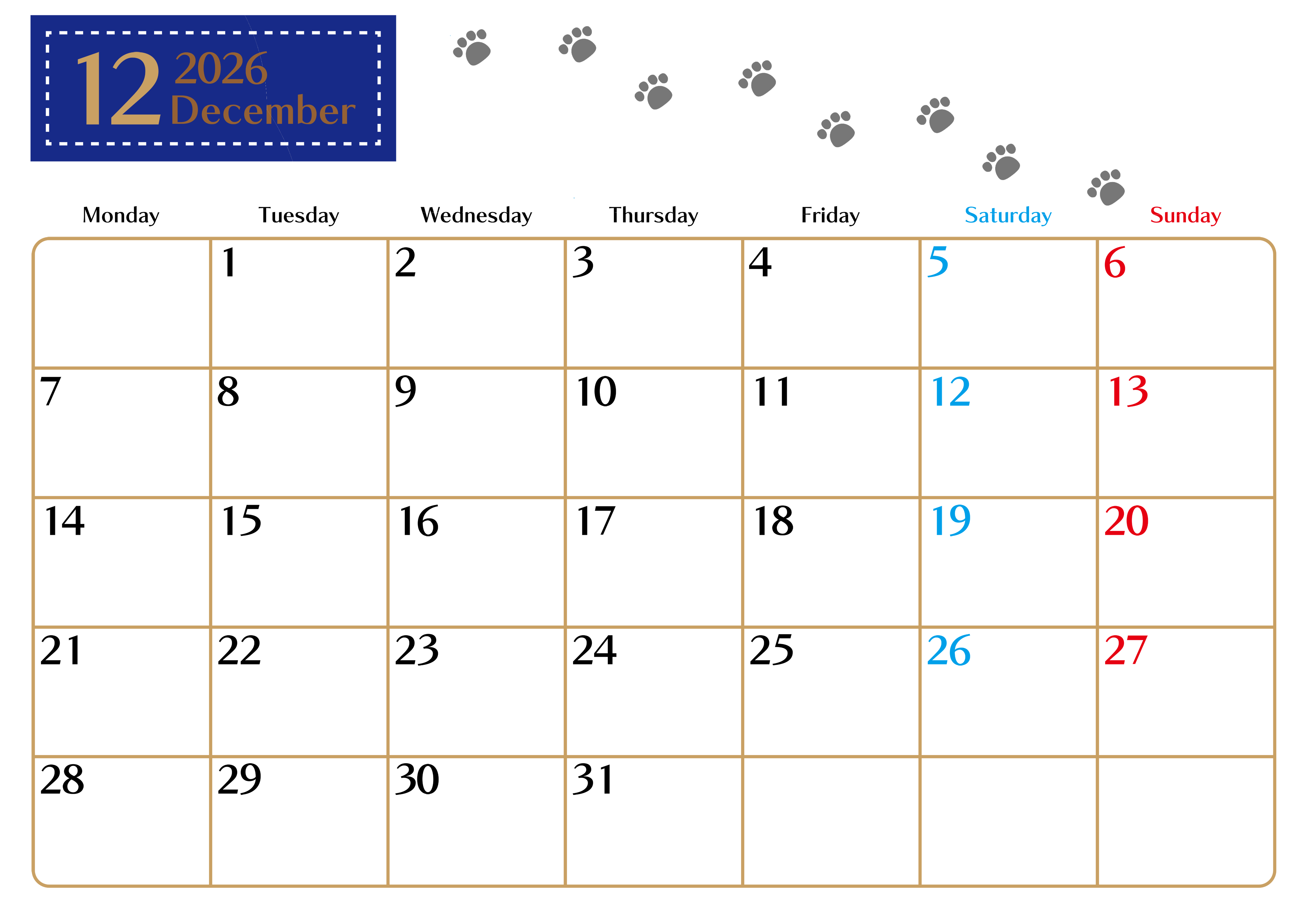 2026年・無料のカレンダーテンプレート 2026年12月カレンダーは横型月曜始まりで猫の肉球にほっこり癒されるゆるおしゃれデザイン♪ダウンロードは無料♪(2026-01281201) 素材状デザイン王 2025年4月9日 2026年12月カレンダーは横型月曜始まりで猫の肉球にほっこり癒されるゆるおしゃれデザインです。ダウンロードは無料なので自由にお好みでご利用ください。忙しい毎日をほっこりさせてくれるカレンダーです。(2026-01281201) おしゃれ 12月 猫 横型のカレンダー 月曜始まり カレンダーデザイン-0128