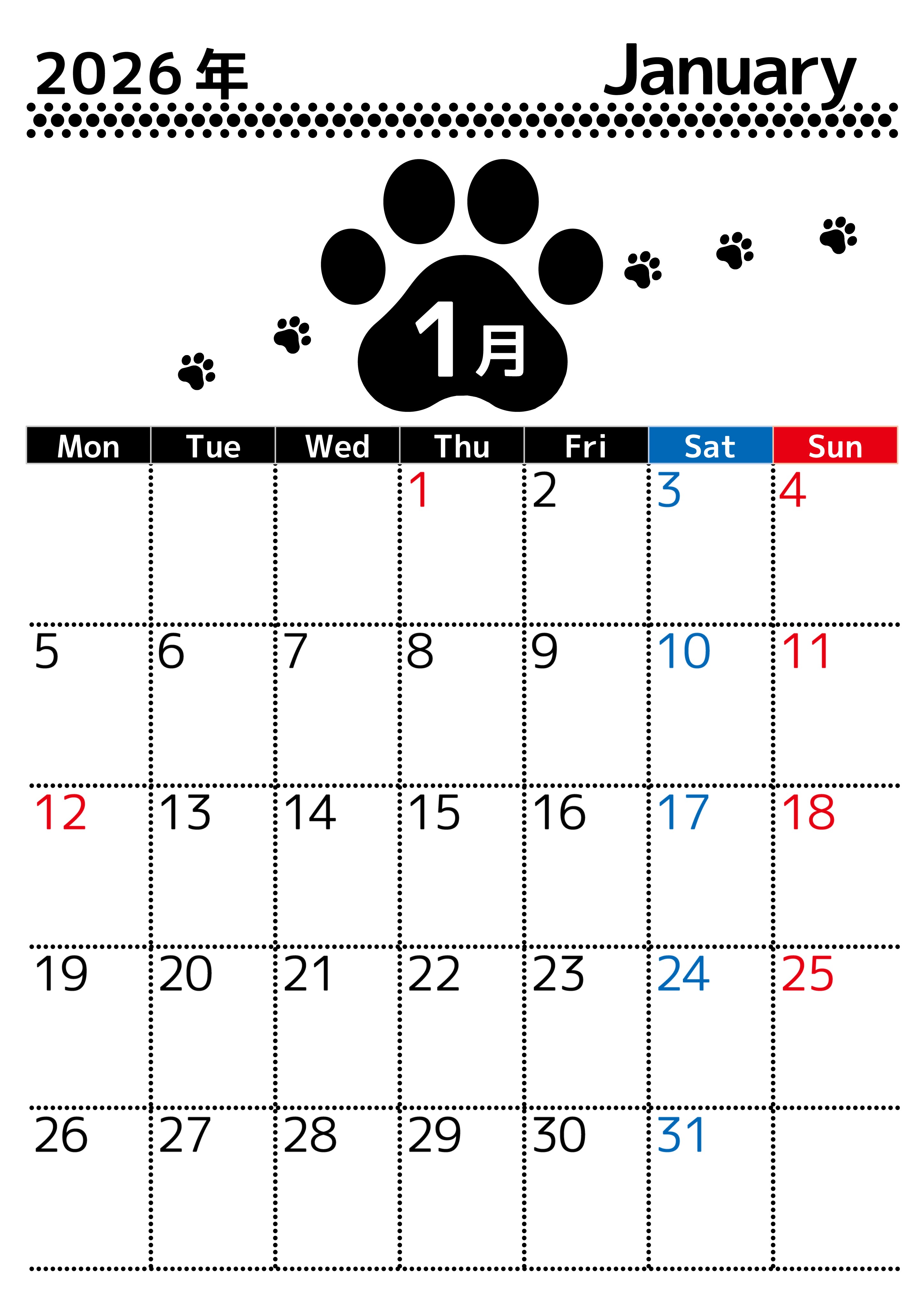2026年・無料のカレンダーテンプレート 2026年1月カレンダーは縦型月曜始まりでかわいい猫の黒い足跡をテーマにしたイラスト付き♪気ままに無料ダウンロード♪(2026-01290111) 素材状デザイン王 2025年4月9日 2026年1月カレンダーは縦型月曜始まりでかわいい猫の黒い足跡をテーマにしたイラスト付きです。気ままに無料ダウンロードできます。(2026-01290111) かわいい 1月 猫 縦型のカレンダー 月曜始まり カレンダーデザイン-0129