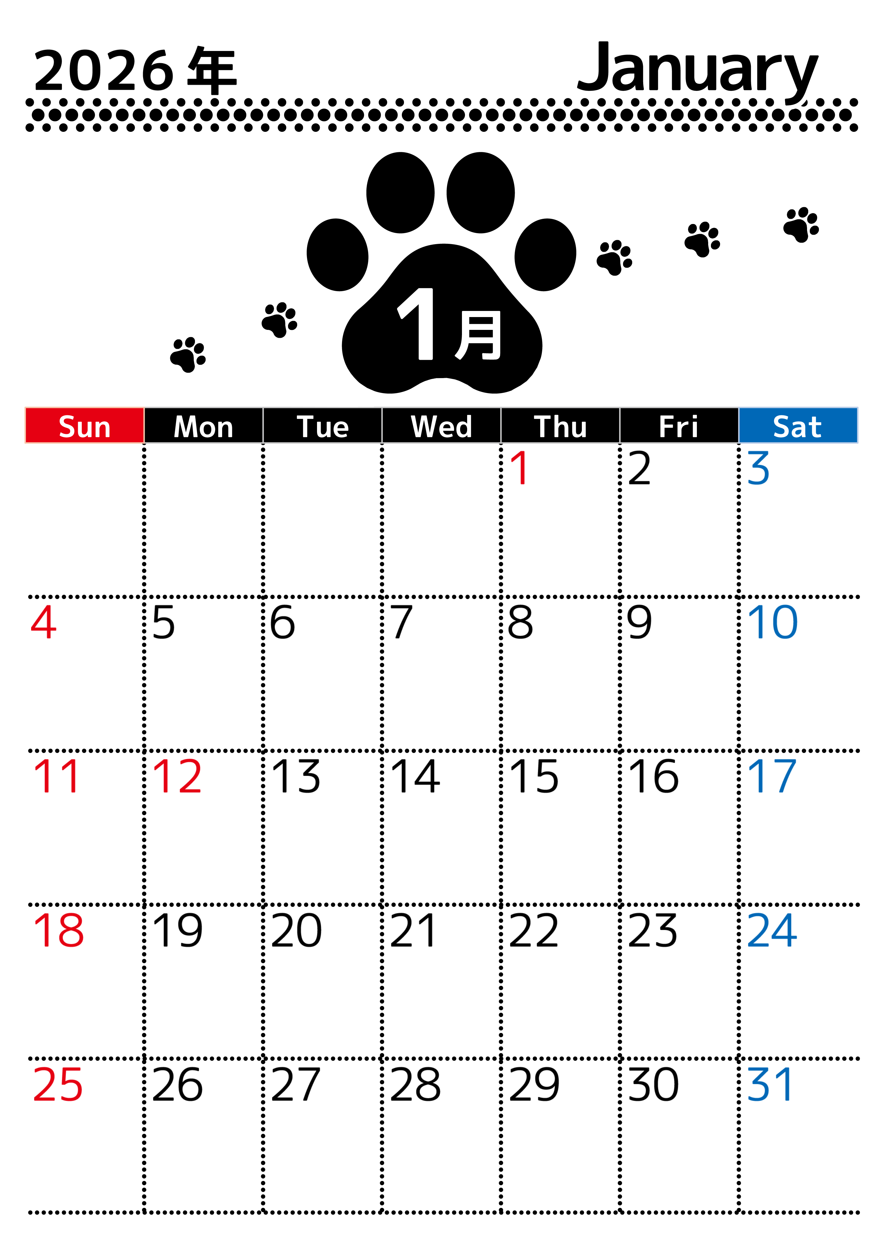 2026年1月カレンダーは縦型日曜始まりでかわいい猫の黒い足跡をテーマにしたイラスト付きです。気ままに無料ダウンロードできます。(2026-01290110)