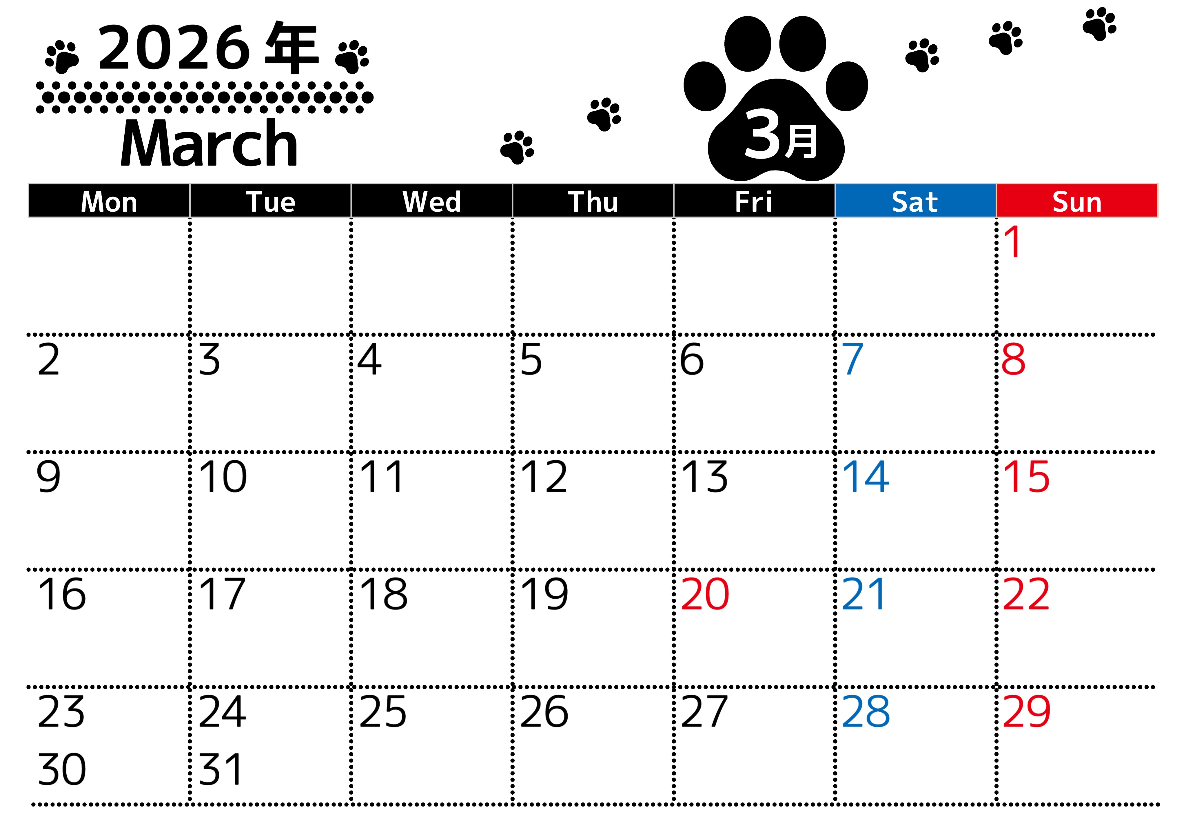 2026年・無料のカレンダーテンプレート 2026年3月カレンダーは横型月曜始まりでかわいい猫の黒い足跡をテーマにしたイラスト付き♪気ままに無料ダウンロード♪(2026-01290301) 素材状デザイン王 2025年4月9日 2026年3月カレンダーは横型月曜始まりでかわいい猫の黒い足跡をテーマにしたイラスト付きです。気ままに無料ダウンロードできます。(2026-01290301) かわいい 3月 猫 横型のカレンダー 月曜始まり カレンダーデザイン-0129